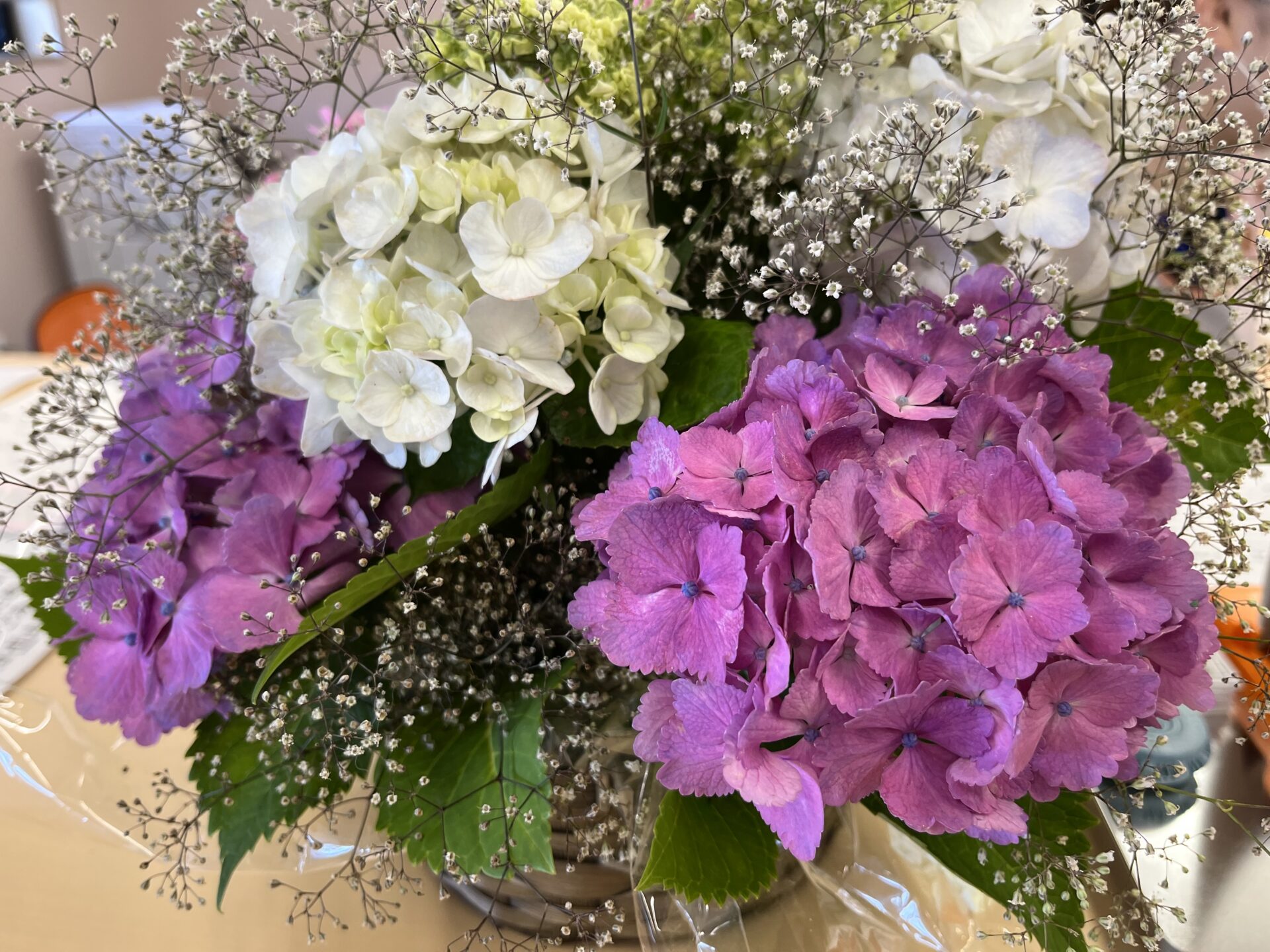Y先生が、自宅の庭に咲いた花をアレンジメントフラワーにして、持ってきてくれました。(Y先生はアレンジメントフラワーが得意なんです。)