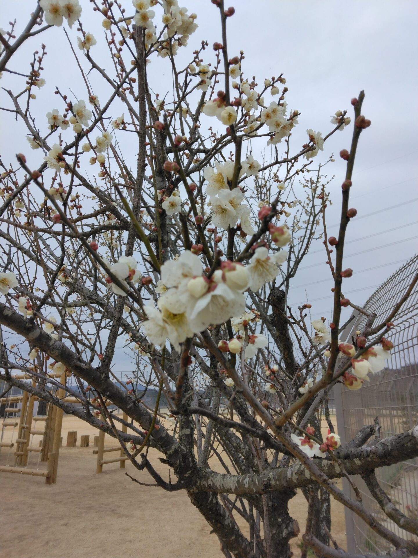 5歳児の部屋から園庭に出るところに、梅の木があり、花が咲きはじめています。