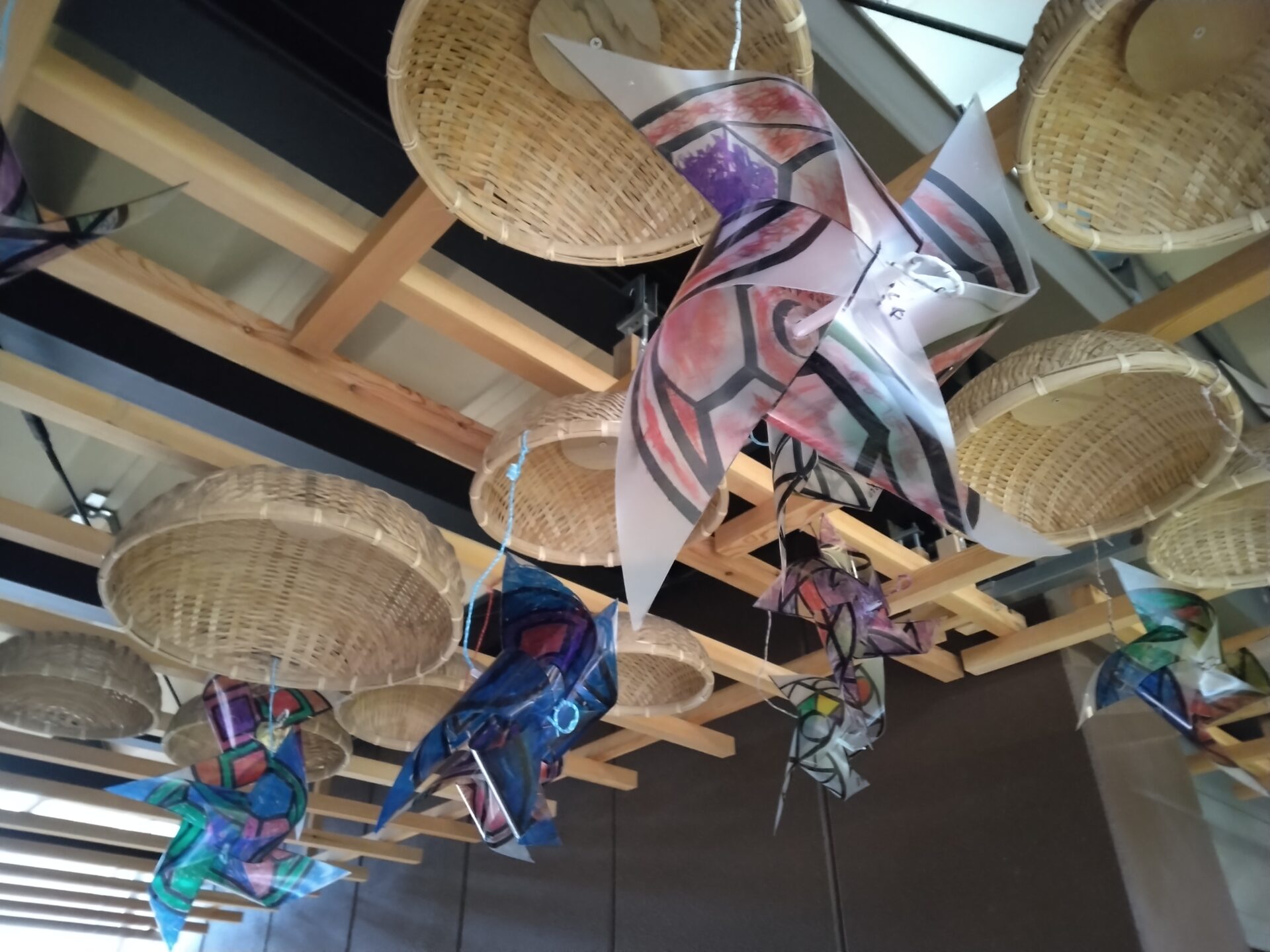 こいのぼりのまわりには、 矢車回天球(こいのぼりのポールの先について回転している物)がわりにみんなで作った「風ぐるま」も飾りました。 風ぐるまをどうやって飾ろうかな?と、何気なく保護者さんに話したことがきっかけで、保護者さんから、針金で吊るすアイデアをいただきました。