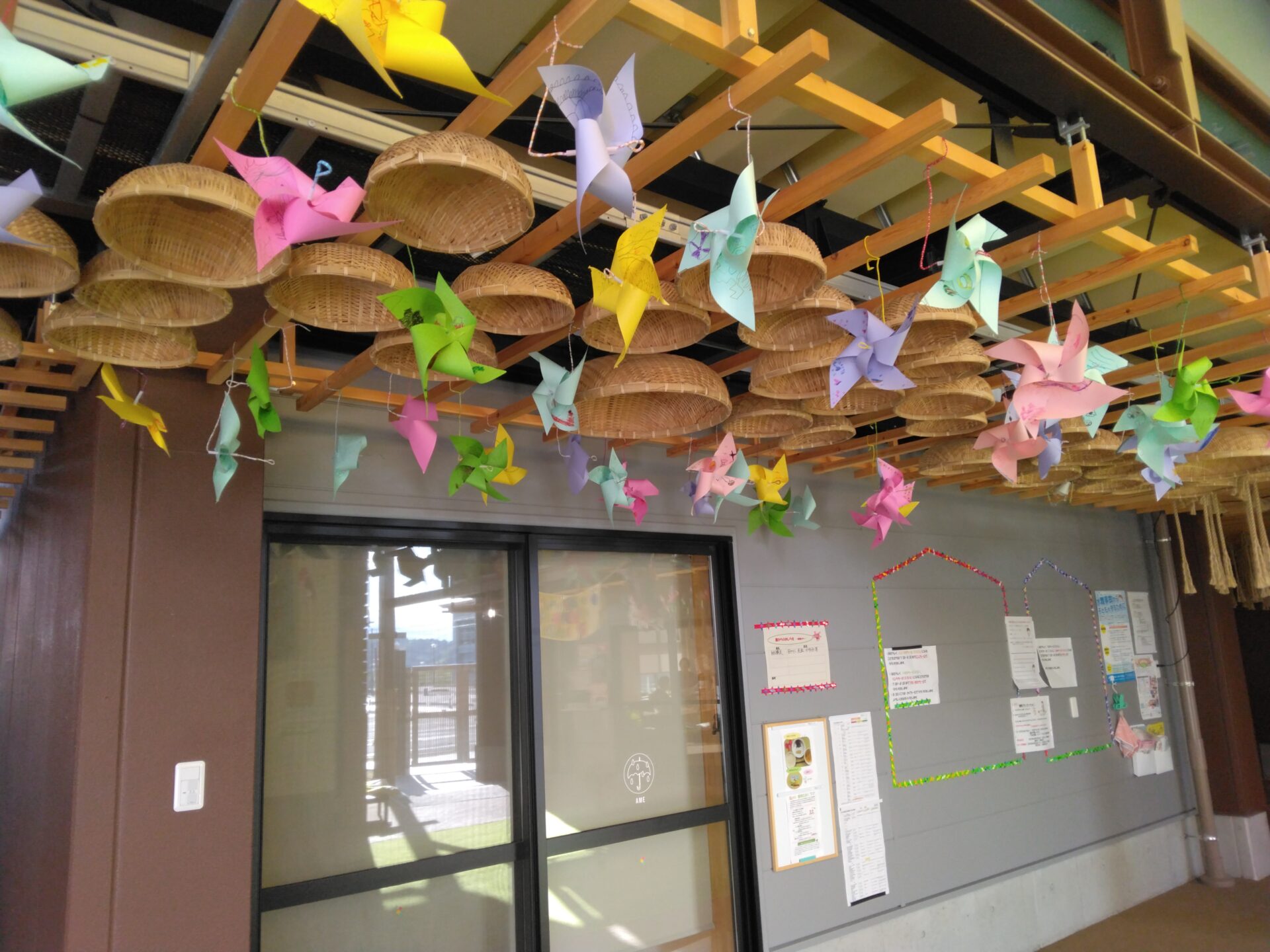 こいのぼりの友だちができ、風ぐるまもくるくるまわって、にぎやかなエントランスに大変身しました。