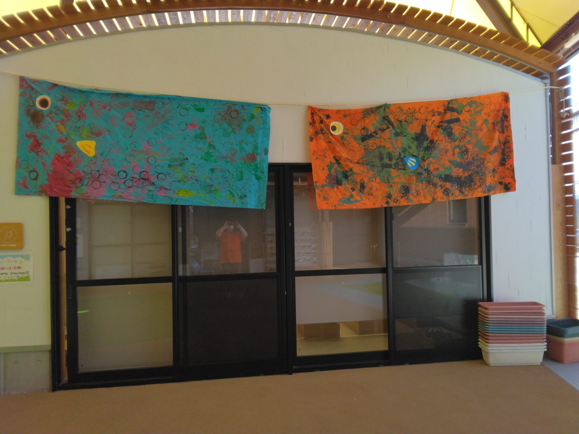 伴谷くじらこども園にあるエントランスに、5歳児くじらチームのこいのぼりが元気よく泳いでいます。