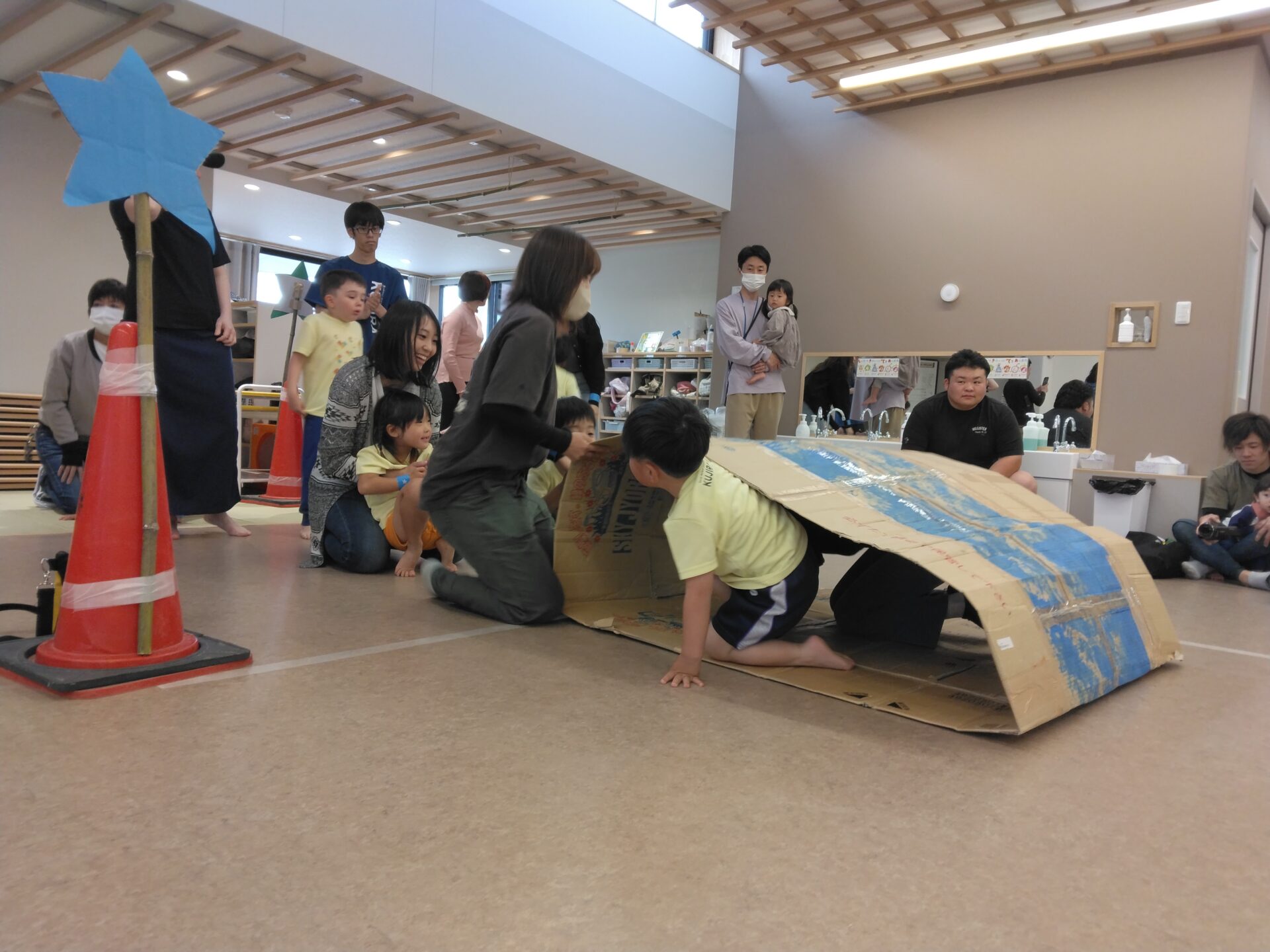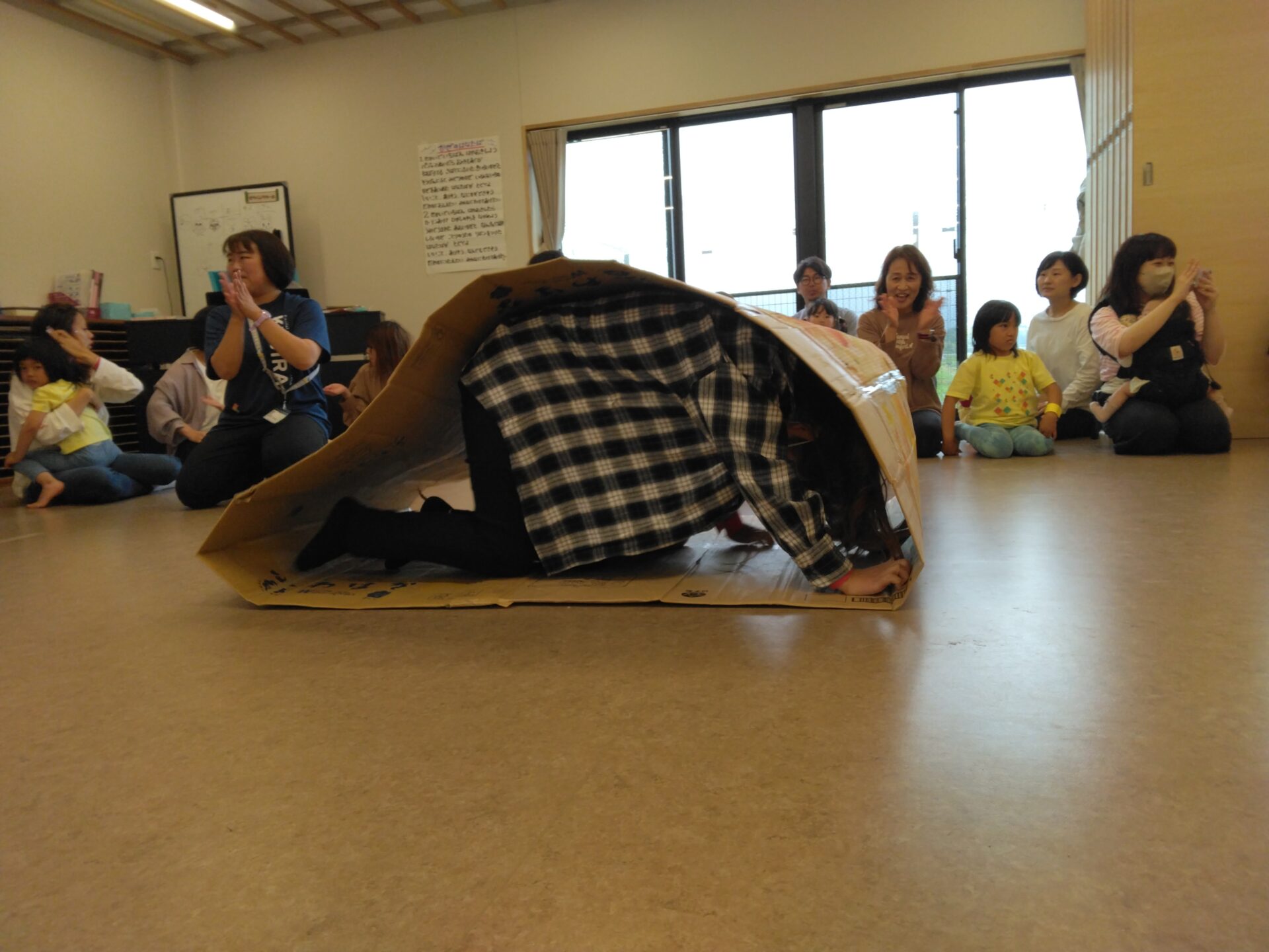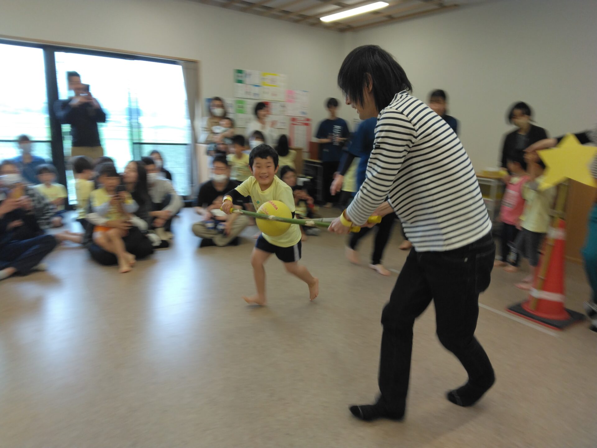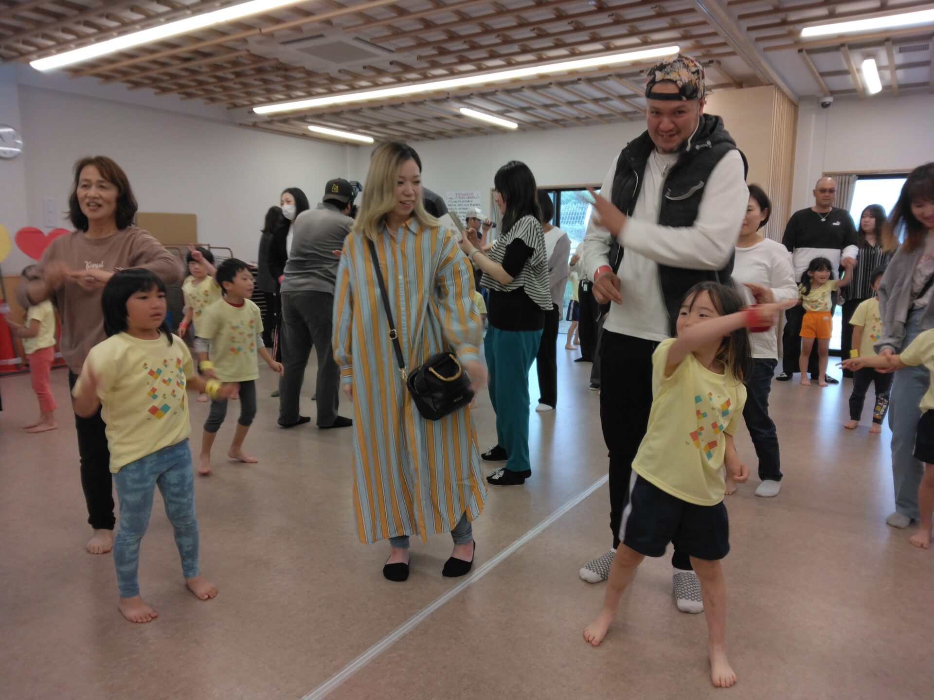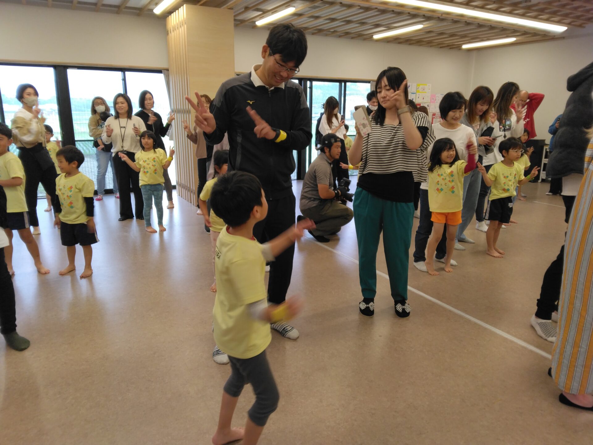 当日の天気は、朝から小雨がパラパラとしていたので、運動遊びは室内に変更になりました。準備体操もかねて”エビカニクス“を踊り、子どもたちがお家の人に教えている姿もありました。