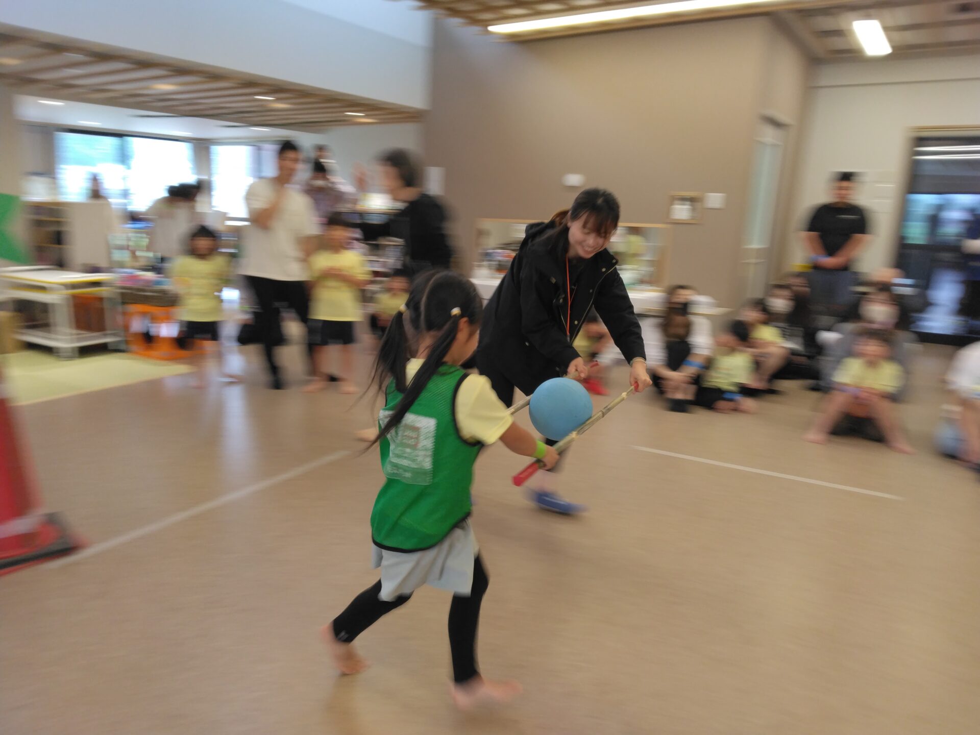 次は、ボール運びです。二本の竹を使ってボールを挟み、次の友だちにバトンタッチ・・・力を入れすぎると、ボールが上手く挟めなかったり、緩かったらボールが落ちてしまったり・・・やってみると意外に難しい・・・