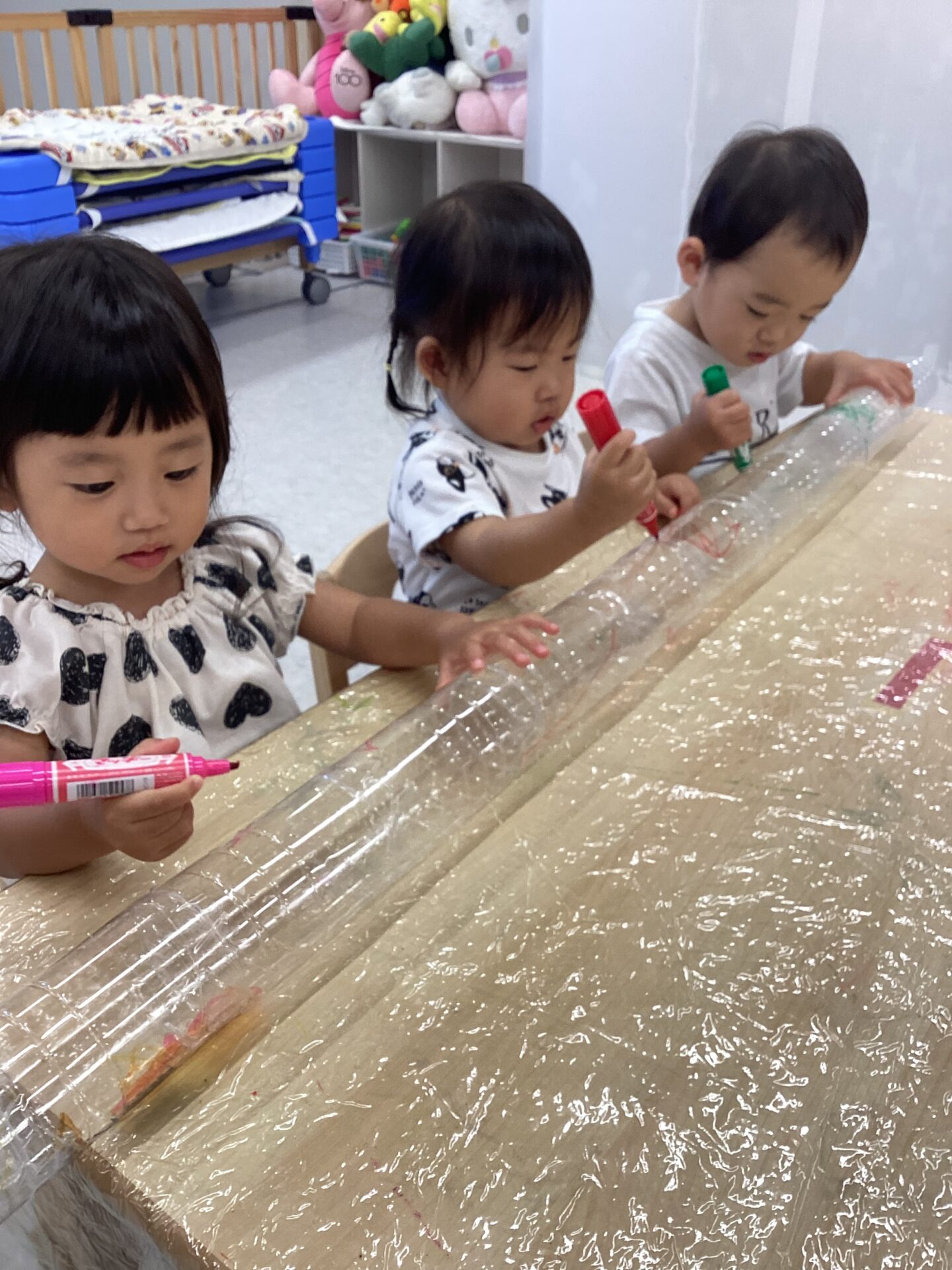 なにか柄があるといいよね!ということで、子どもたちにも協力してもらい、自由にペットボトルに色をつけました!