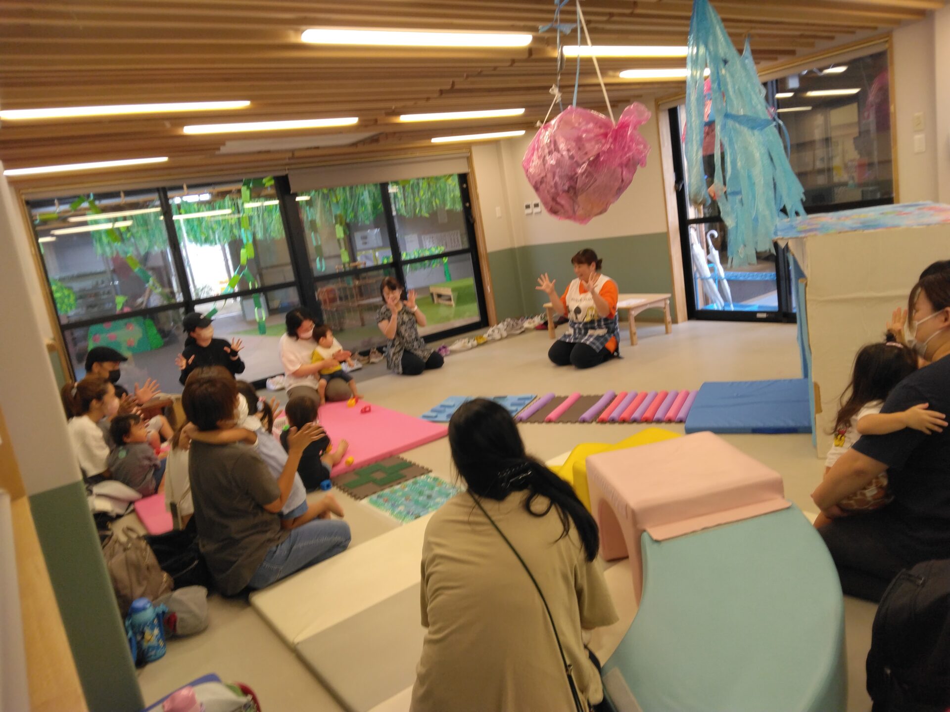 大型絵本を見た後は、いろいろ遊び・・・外は心地よい風が吹き、過ごしやすい気候になったという事もあり、園庭にも出ました。