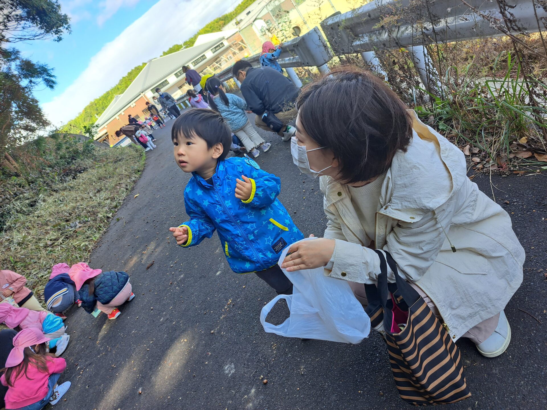 自然に囲まれた伴谷くじらこども園の近くには、ドングリがたくさん落ちている場所があり