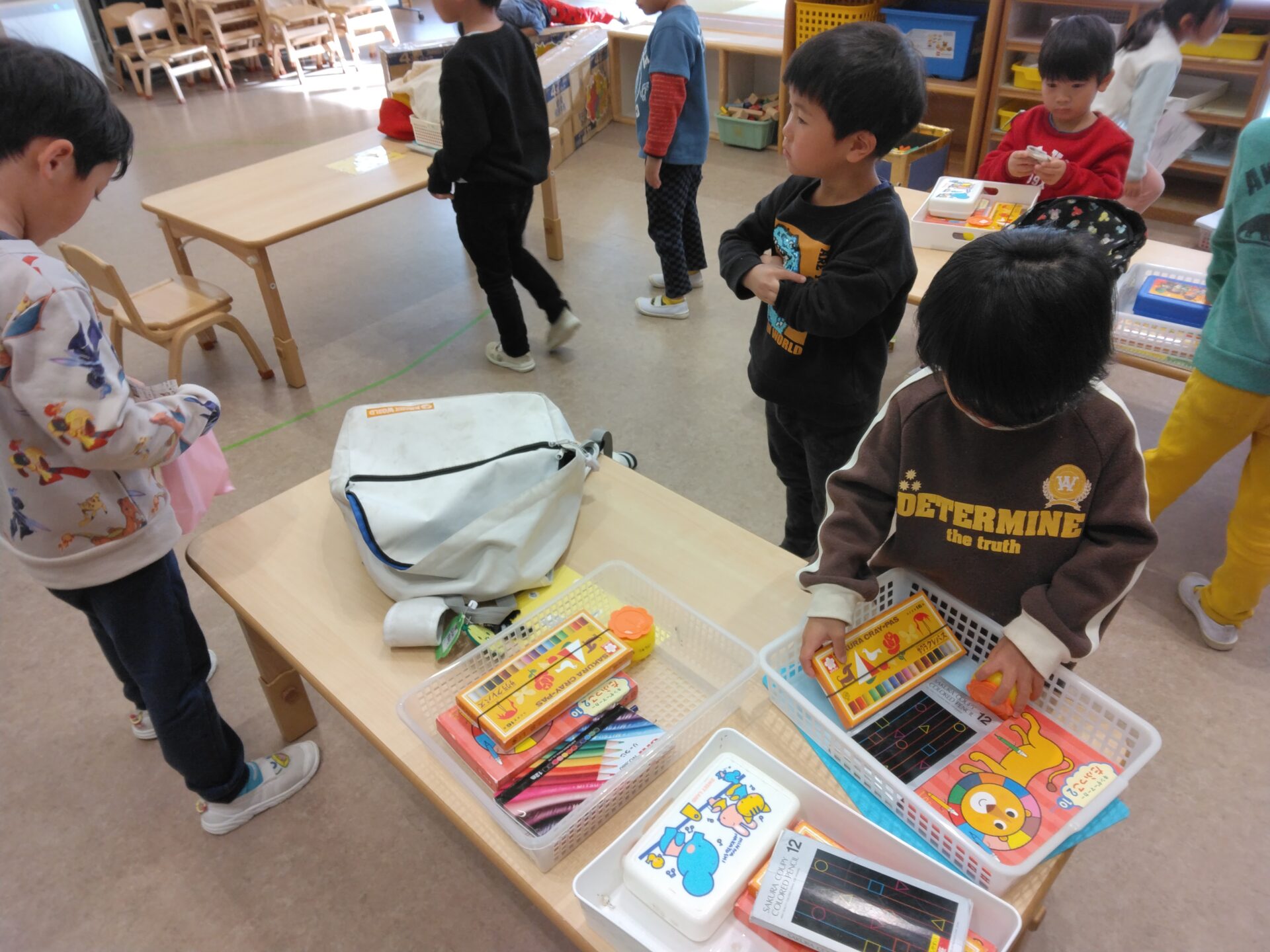 まずは、道具箱から「色鉛筆はバラバラになっていないかな?」「粘土のフタはしまっているかな?」