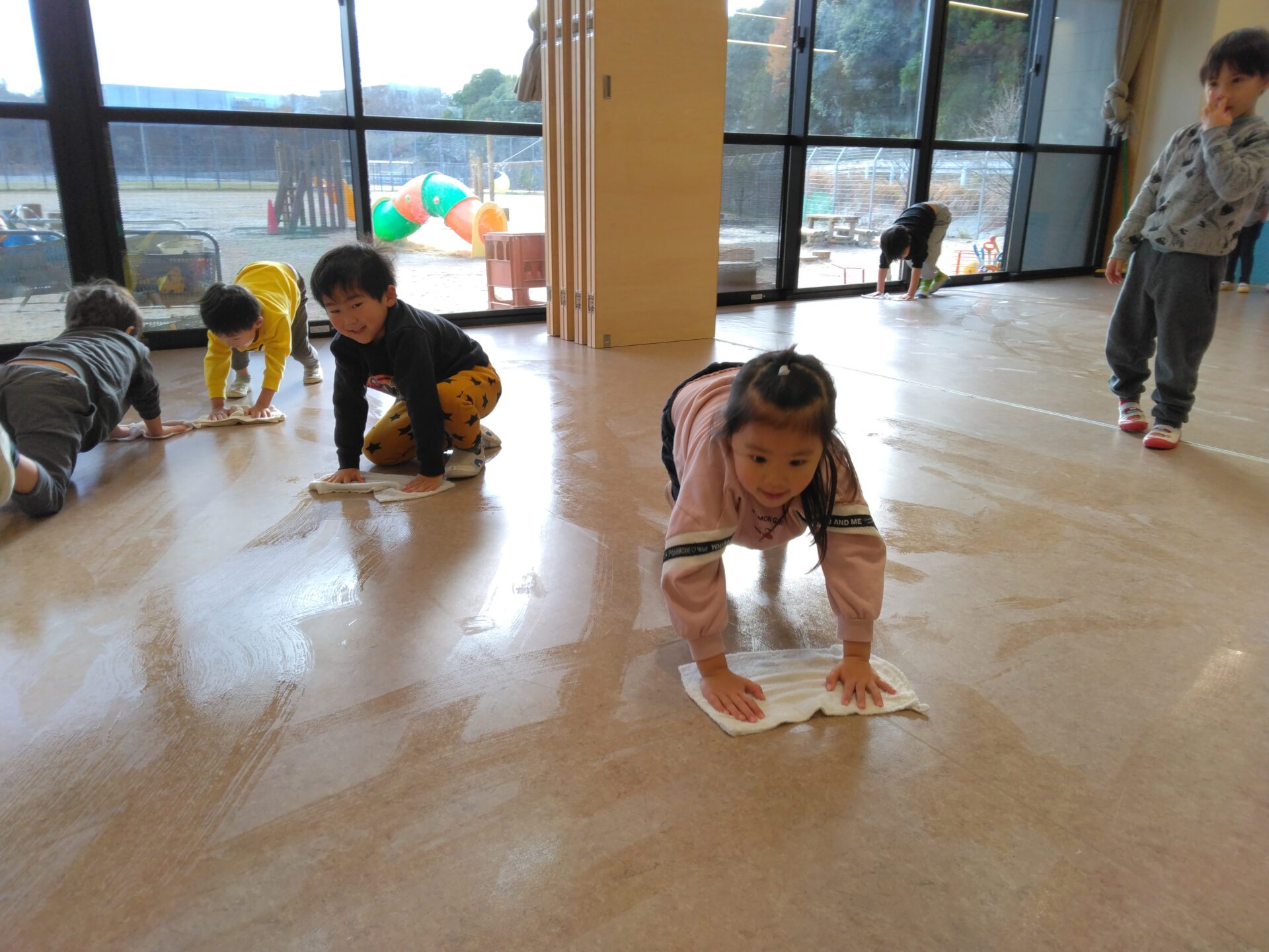 床を雑巾で拭いて、ピカピカに!