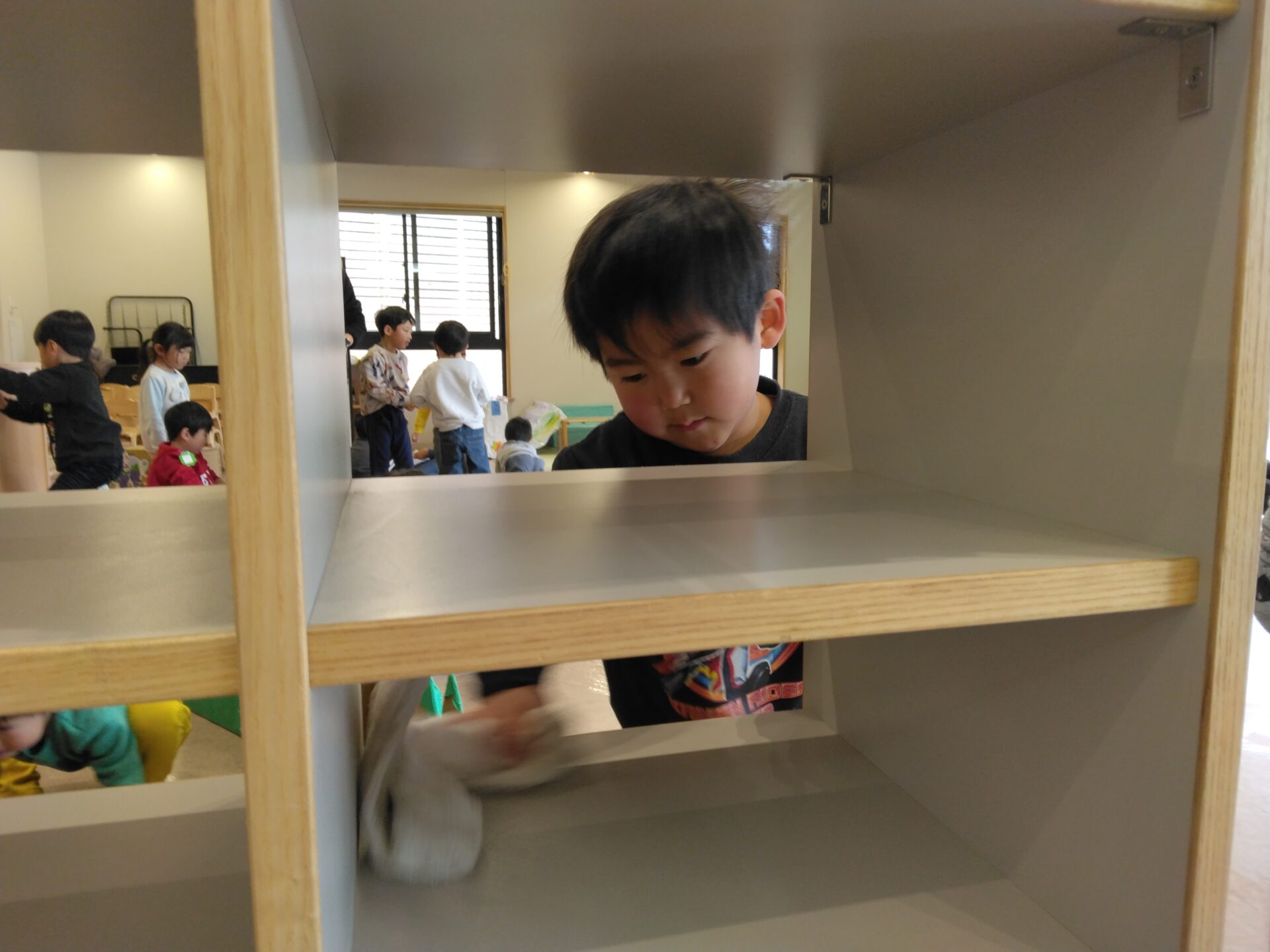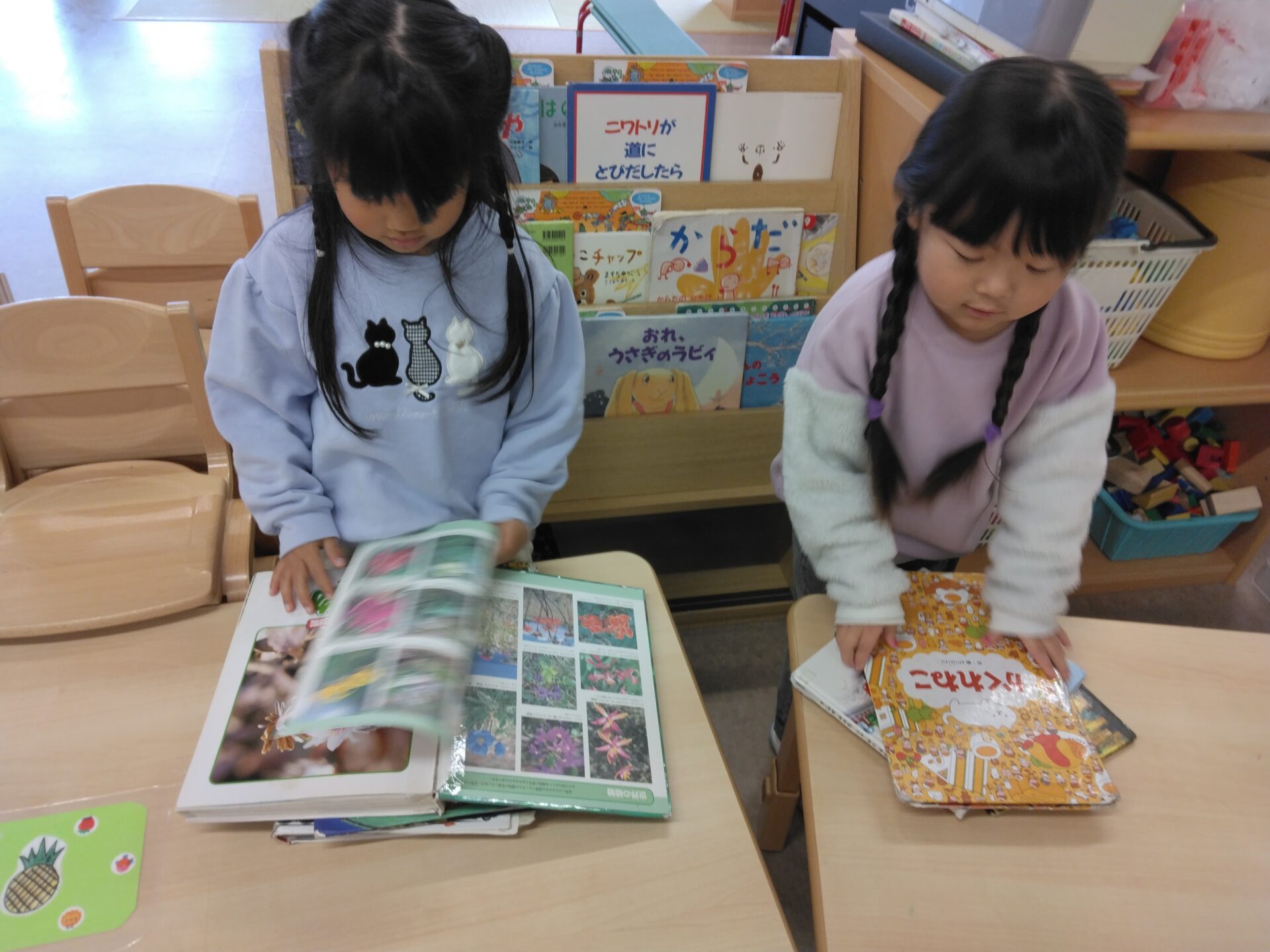 「絵本は破れていないかな?」「きれいに並べてみる!」と、子どもたちが気づいて、絵本の修繕と整頓がはじまりました。