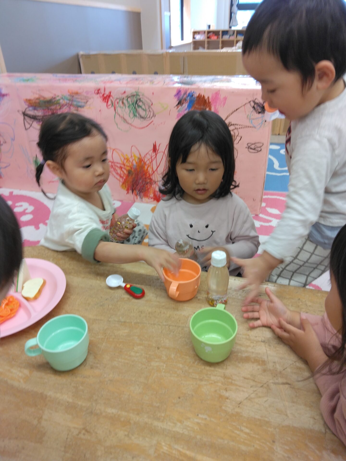 ままごと遊びに興味が出てきた、2歳児あめチームの子どもたち。