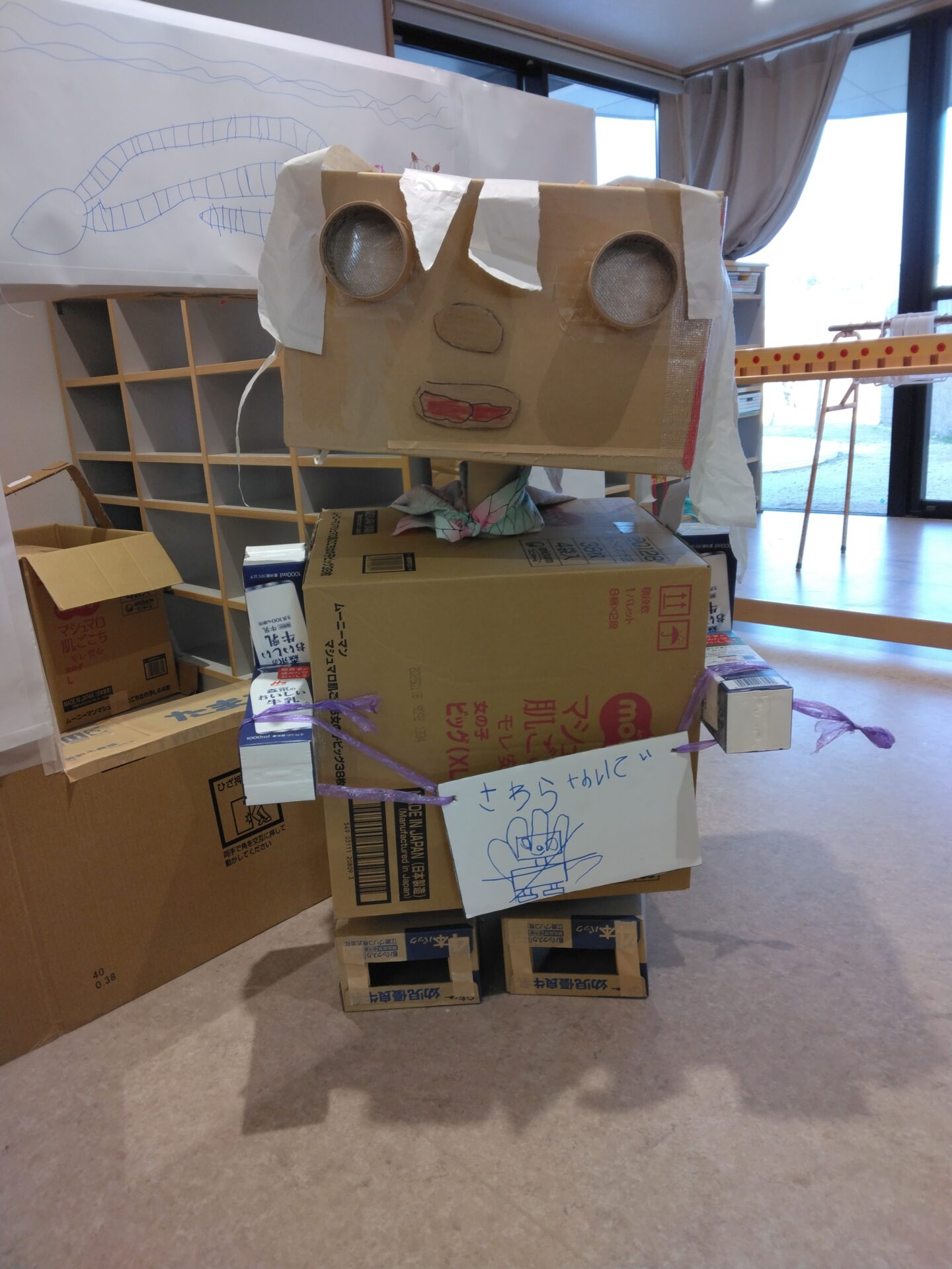 給食後の絵本タイムが好きな子どもたち… 絵本「ロボット ボロたん」を見たあと、「先生、これ一緒に作ろう!」と、絵本の中に出てきたロボットを、段ボールで作りました。