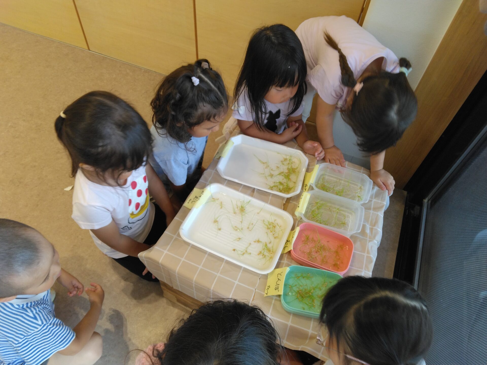 その後、種もみはどんどん成長していき、緑の芽がいっぱいに!【保育者…この後は?どうすればいい?また本を読んで勉強】