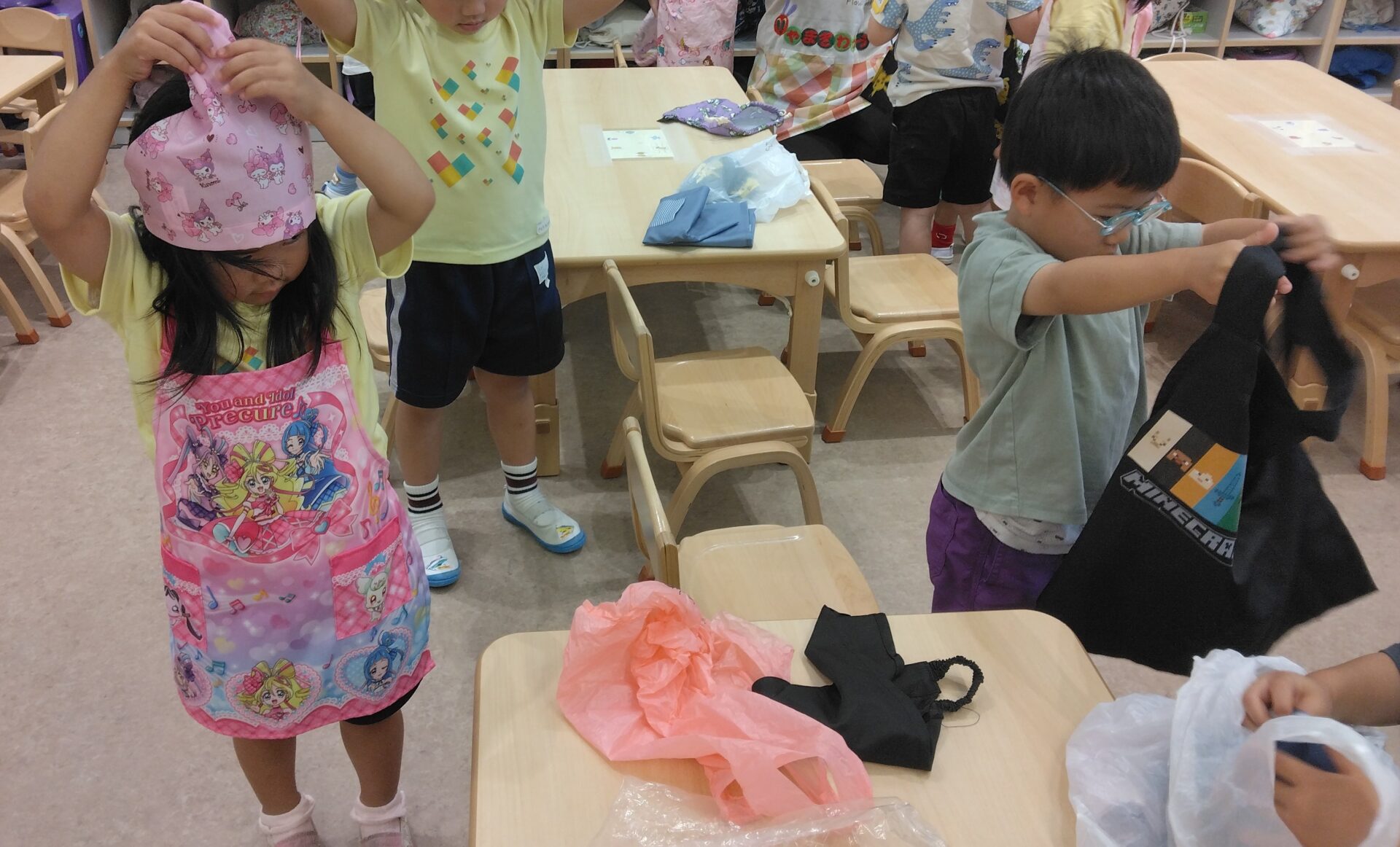 エプロン、三角巾の向きを確認しながら、自分でつけ、