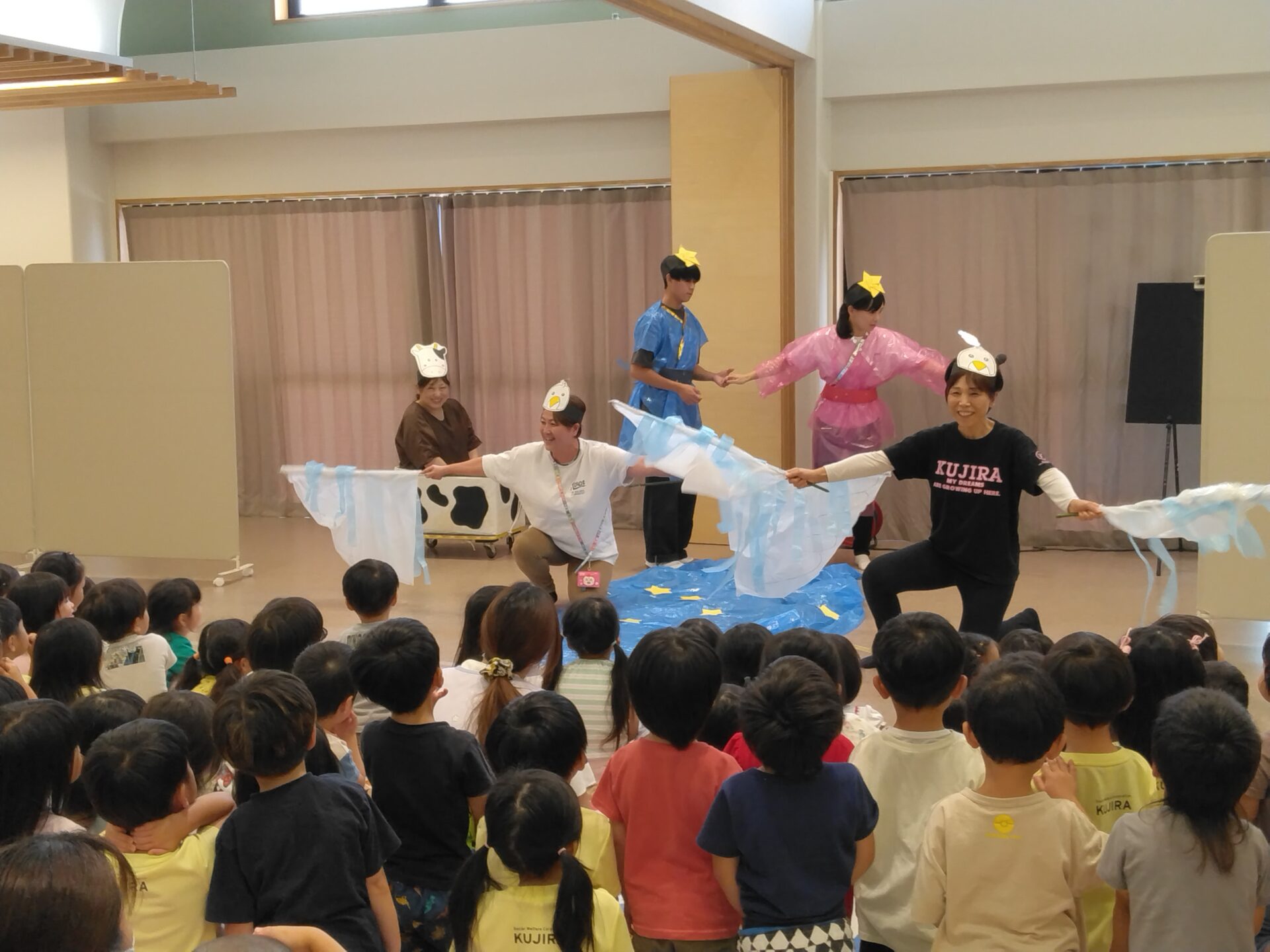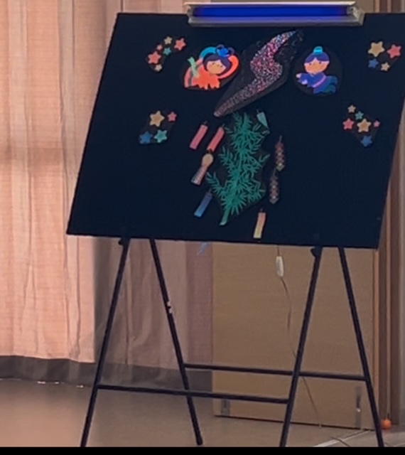 当日は、厨房職員や新卒、中堅、園長、副園長も参加して、七夕の由来を劇で披露。ブラックシアターも楽しみ、幻想的な光に包まれながら歌を口ずさむ子どもたちの姿が、とても印象的でした。