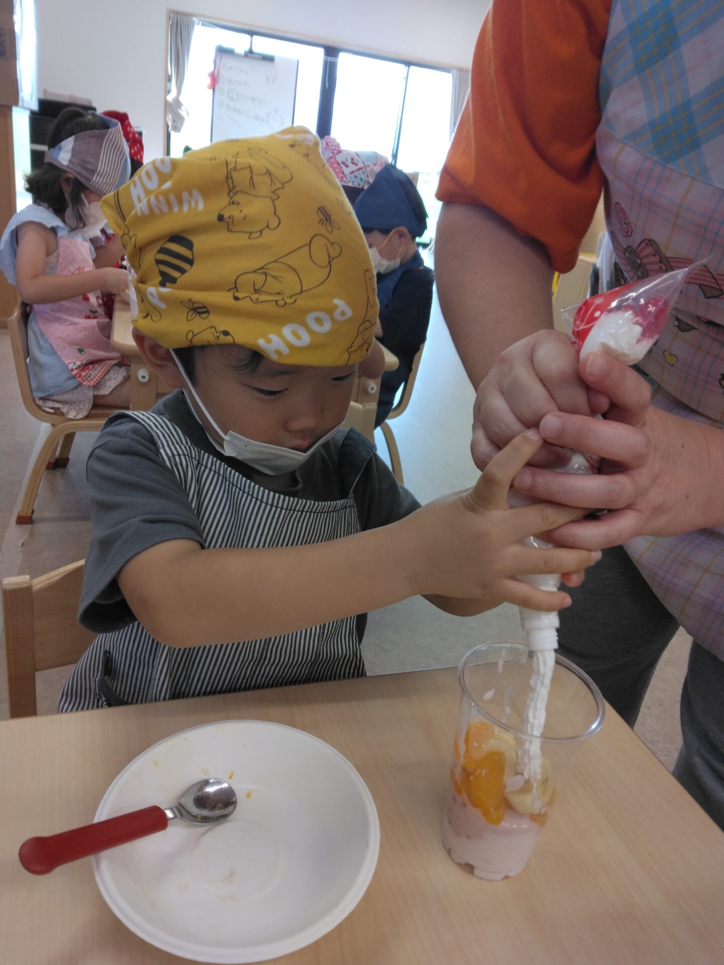 「どんなフルーツをトッピングしようかな?」「生クリームをいっぱいのせたいな!」と楽しみにしていました。
