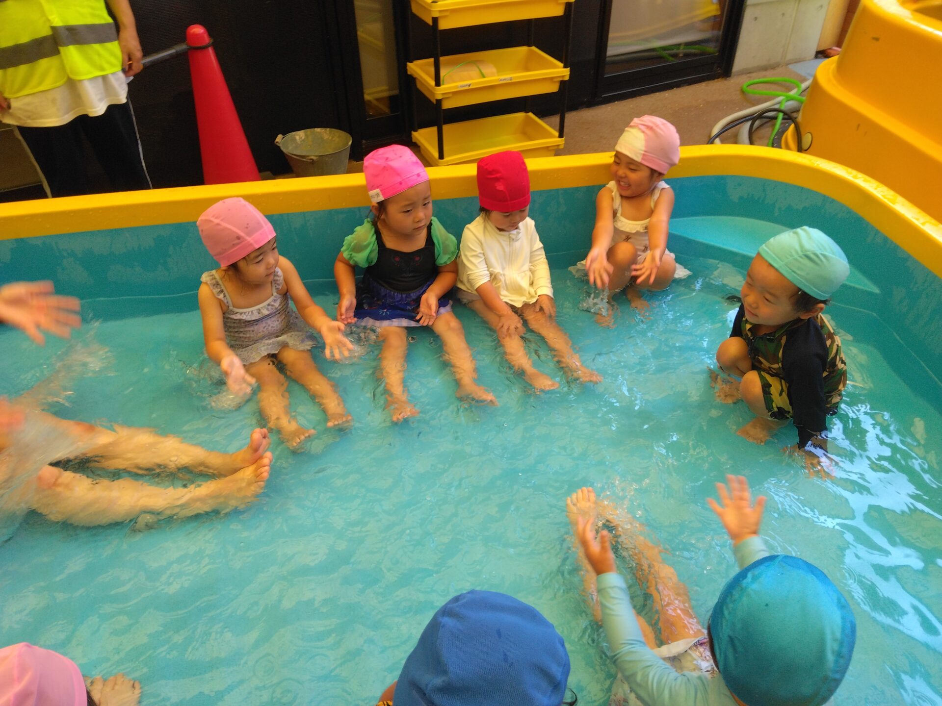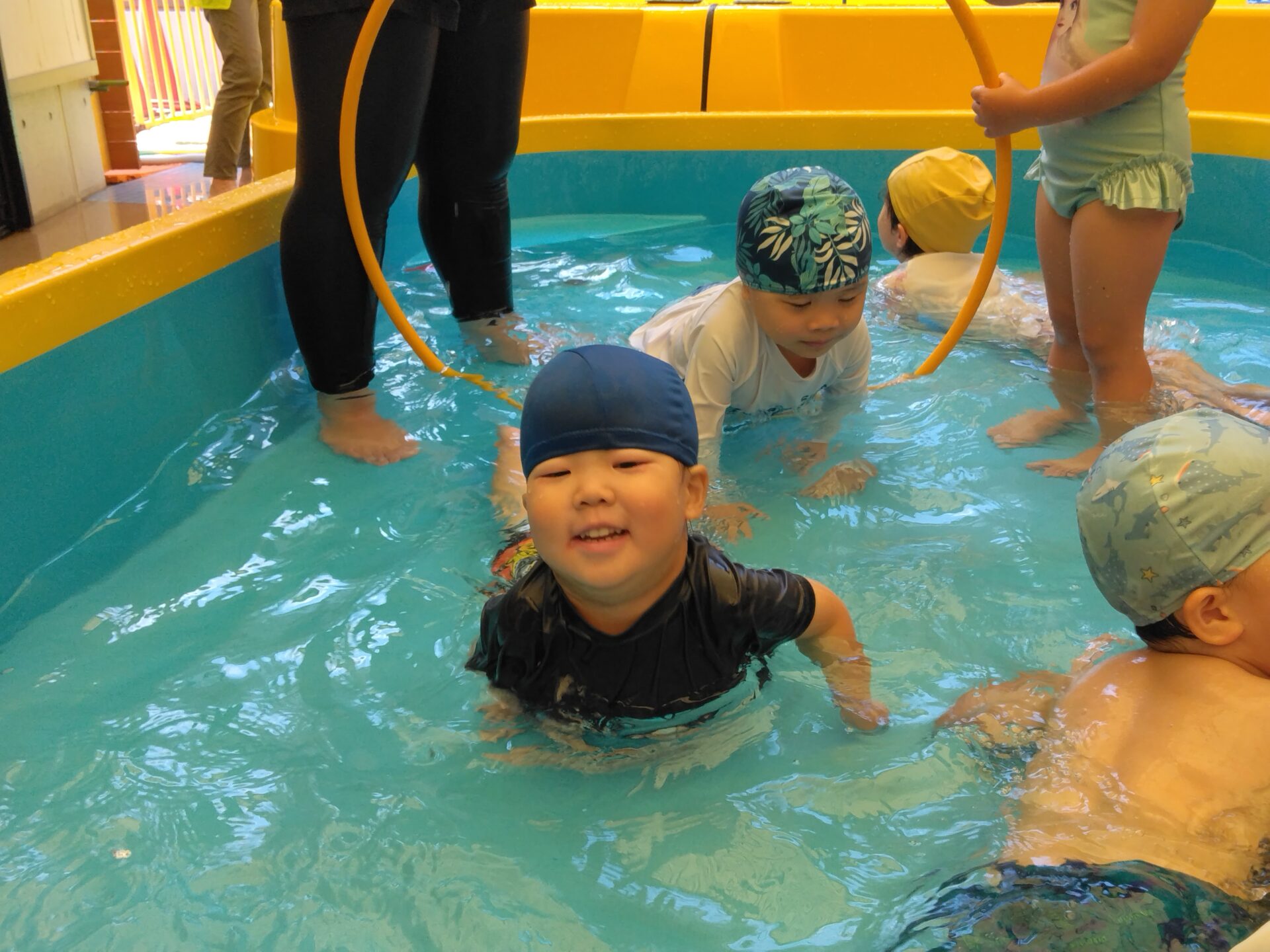 6月の終わりに始まったプール遊び。少し前までは、顔に水がかかるのを嫌がっていた子も今では笑いながら水しぶきを浴び、友だちとのやり取りを楽しむ姿がみられるようになりました。