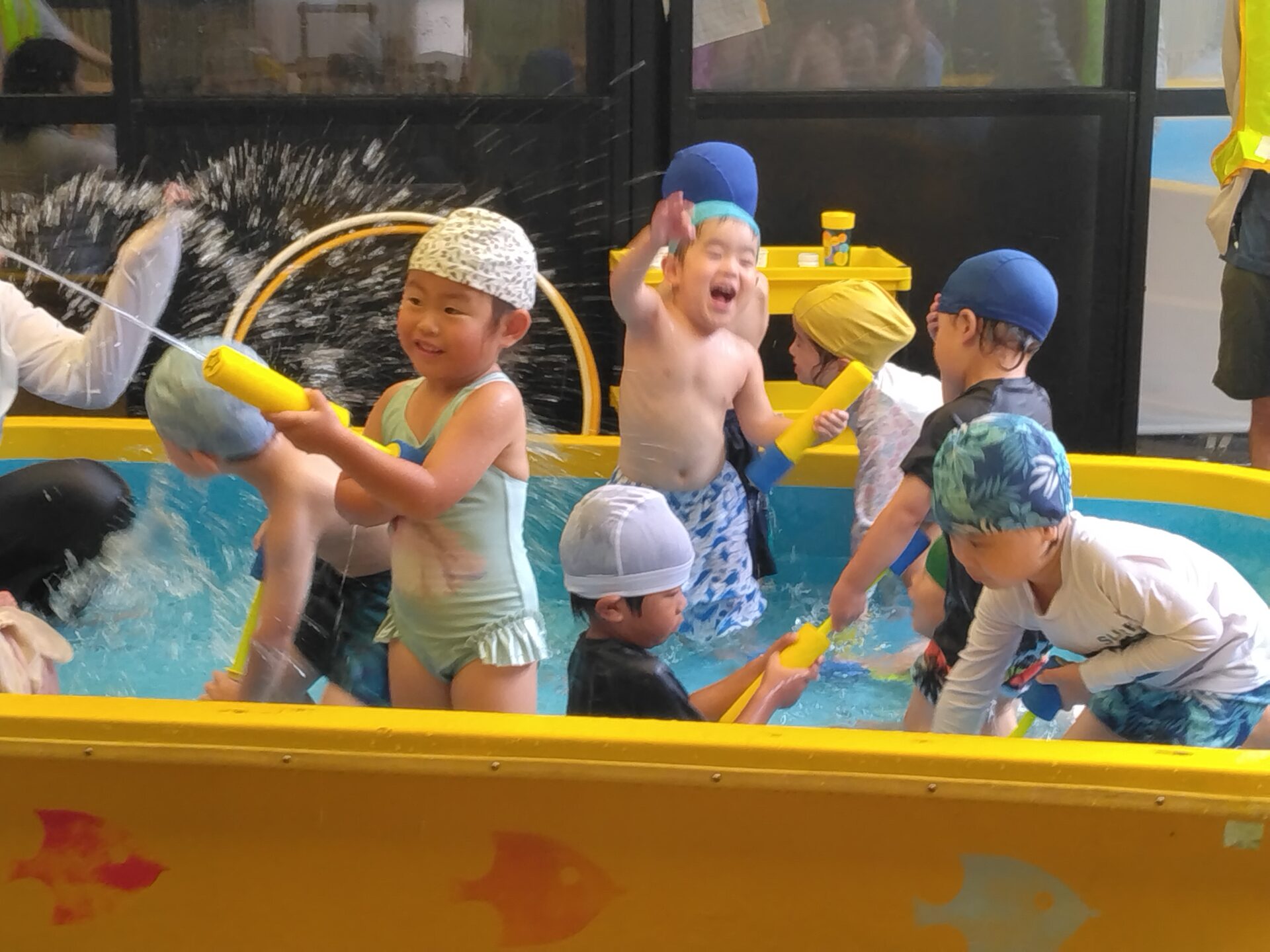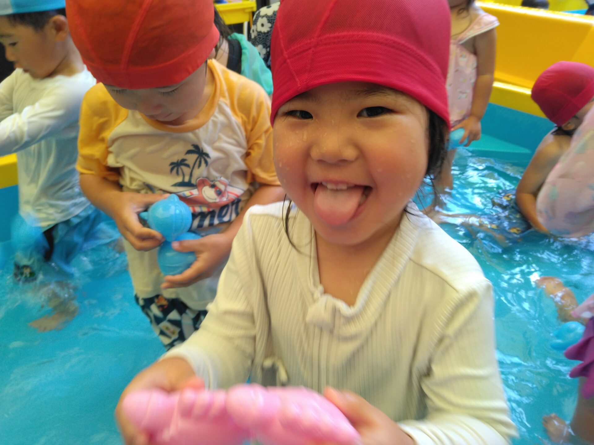 今日のプール遊びでは、「せんせい、たべちゃうぞ~!」と、ワニになりきって水の中を進み、海の仲間の玩具を夢中で拾ったり、水鉄砲で友だちと掛け合いっこをしたりと、友だちと一緒に遊び楽しさを感じながら、遊びの世界がどんどん広がっています。