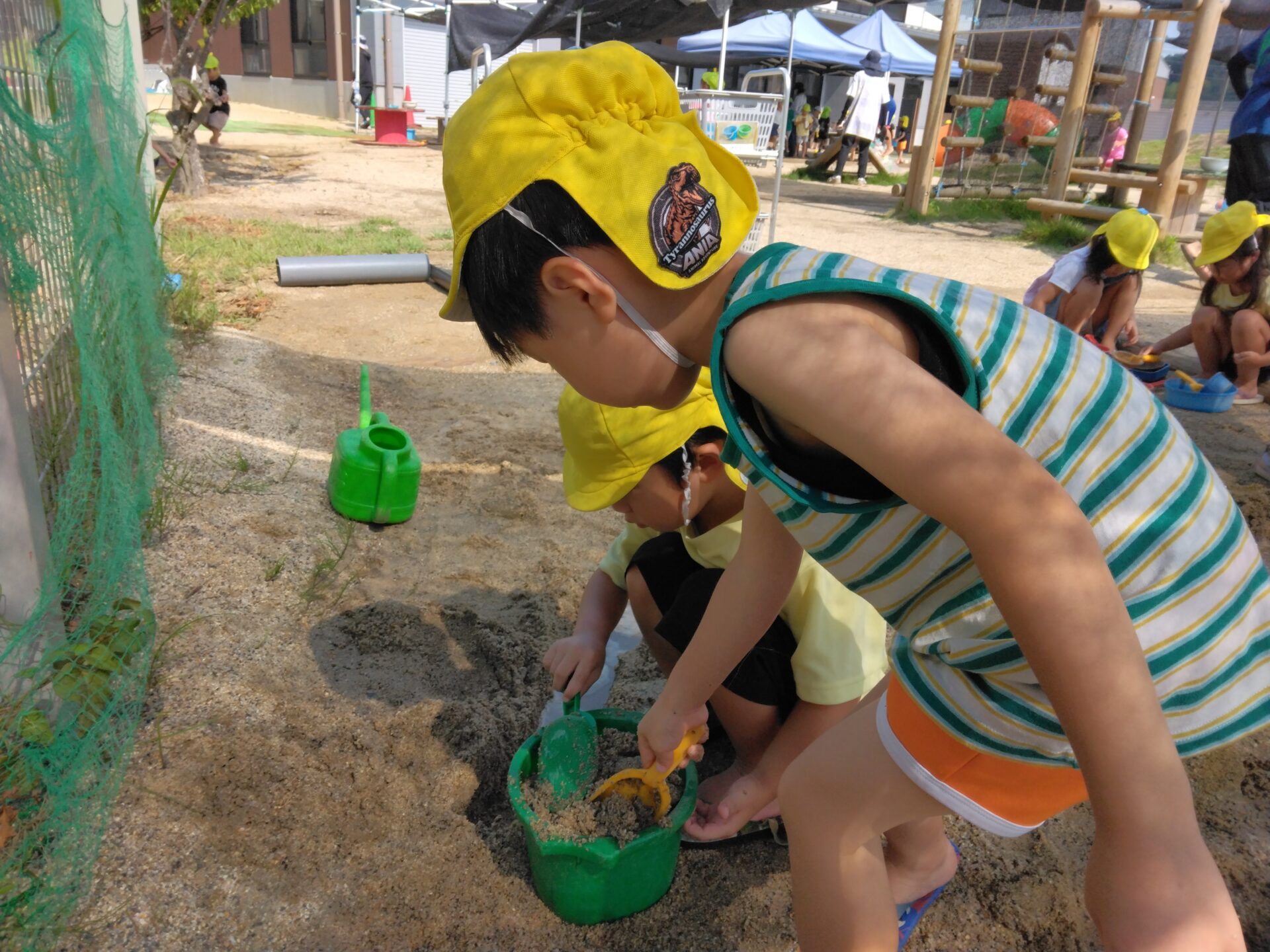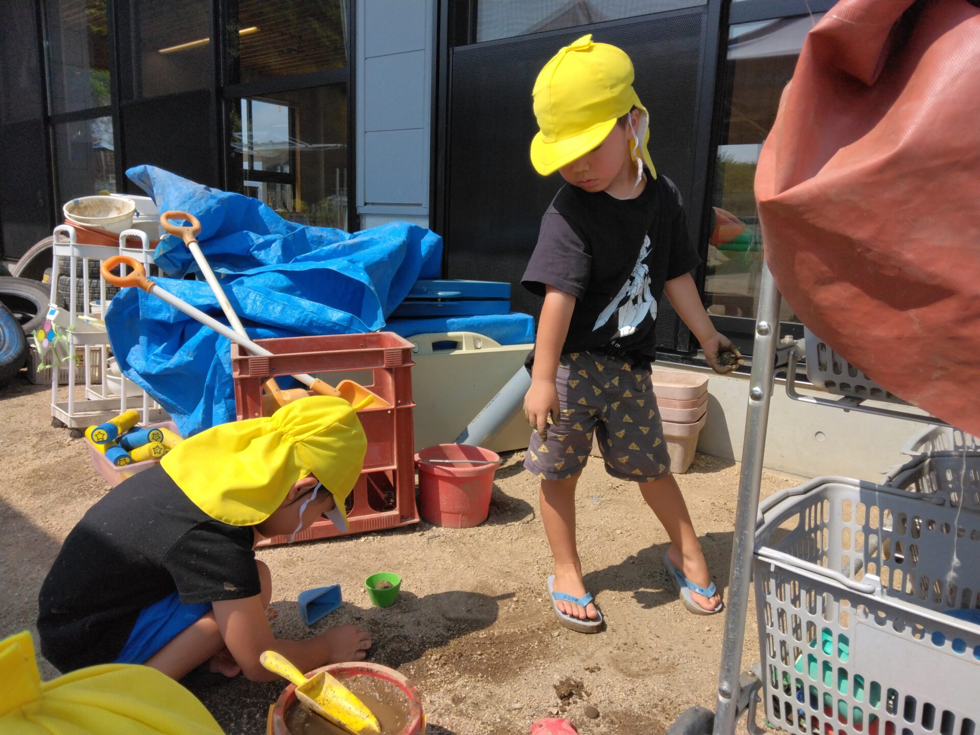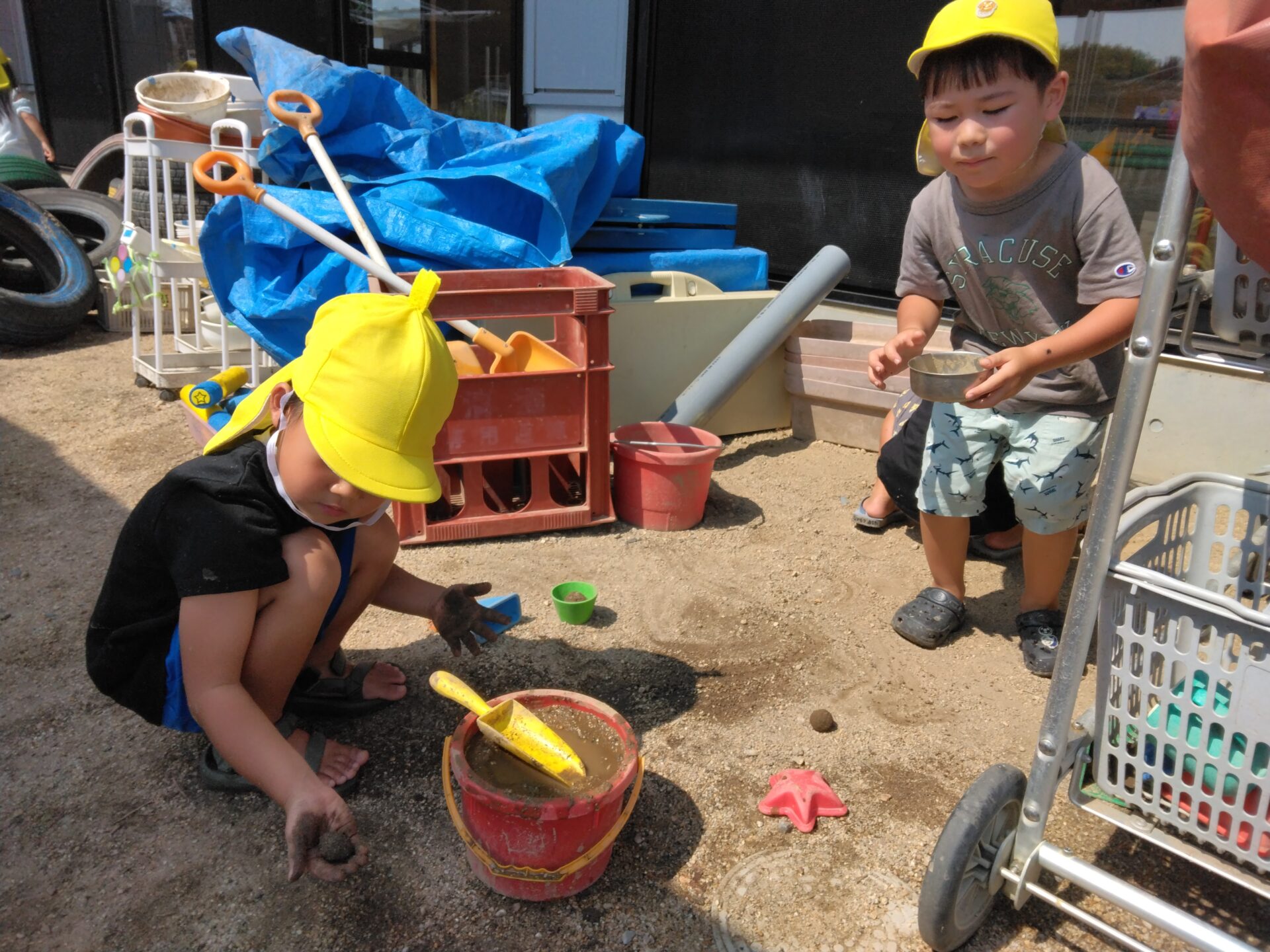4歳児クラスには、『さらこなづくり名人』、『どろだんごづくり名人』、『むしとり名人』いろんな名人がいます。