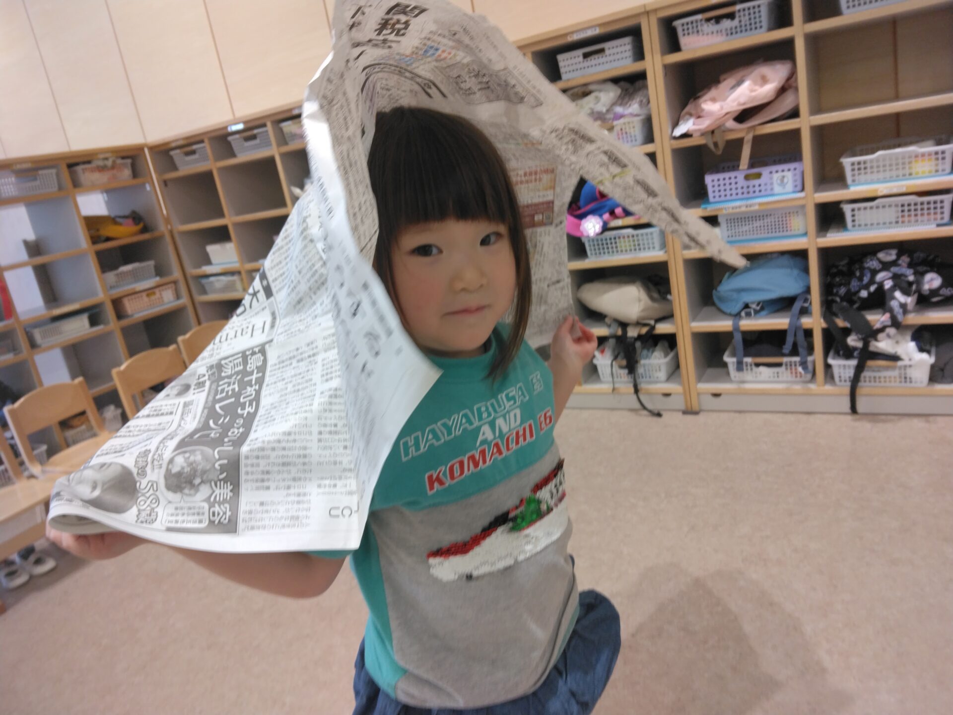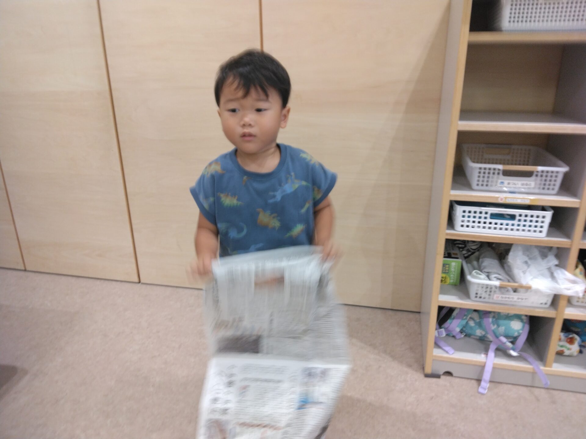 3歳児 にじ・かぜチーム「新聞紙が…大変身」