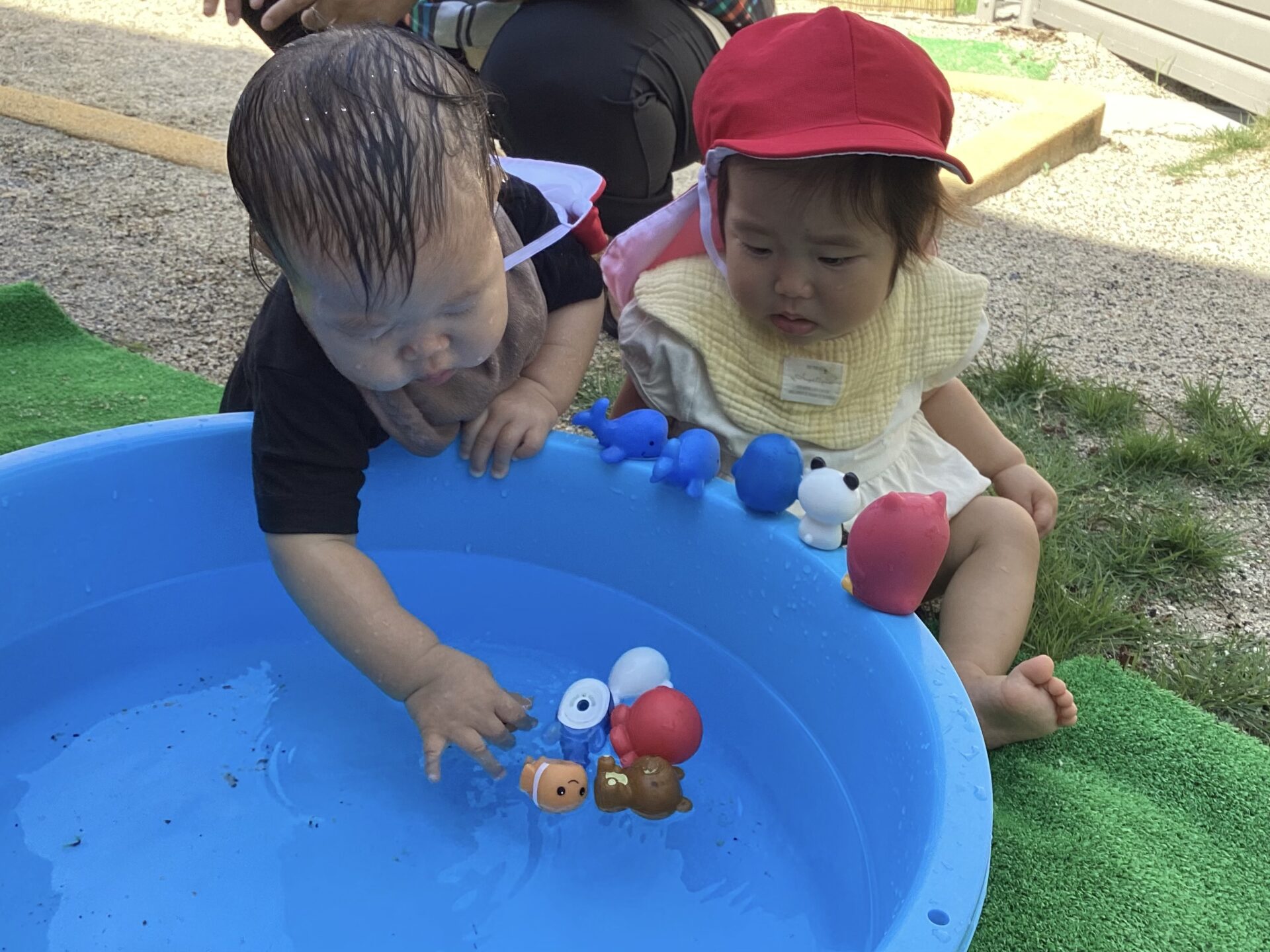 たらいにおもちゃの魚を入れると、すぐに手を伸ばし、つかもうとする子どもたち。つかめると「どうぞ!」と、小さな手で保育者におすそ分けする優しい姿が、微笑ましかったです。