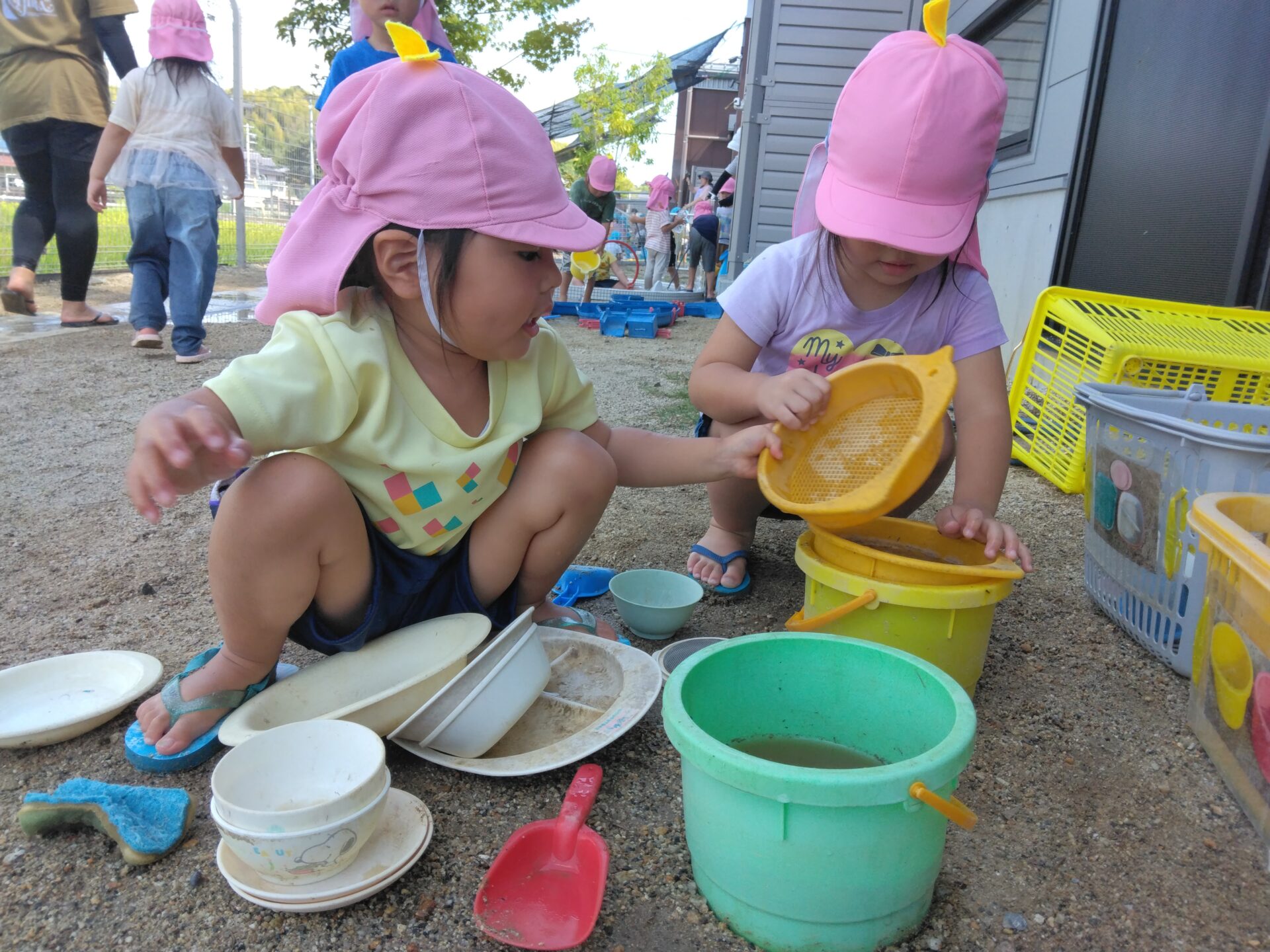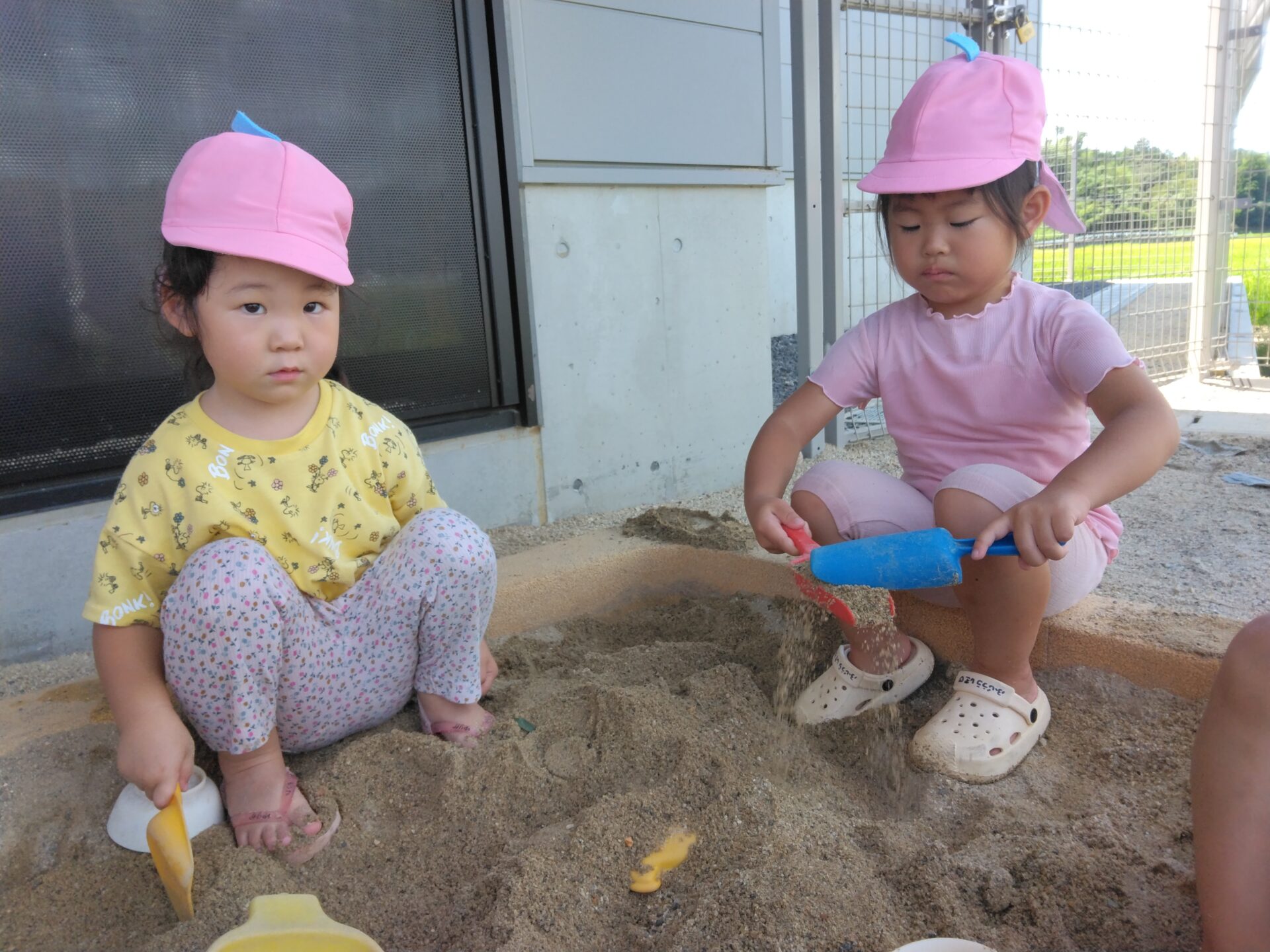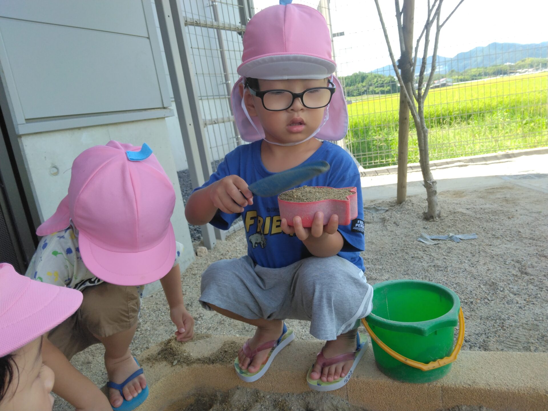 砂場では山を作り「これ、ケーキだよ。おいしそうでしょ」と言う子もいれば、「お山作ってるの」という子もいます。大人からみると一見、同じものを作っているようにみえますが、子どもから話を聞くと想像を膨らませながら、作っていることが分かります。友だちとのやり取りを聞いていると、私生活が垣間見える部分もあり、くすっと笑わせてくれます。これからも子どもたちの会話に耳を傾け、子どもたちと一緒に、「おもしろい」を探求していきたいと思います。