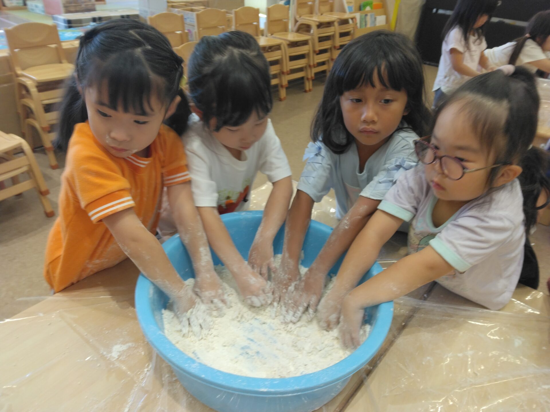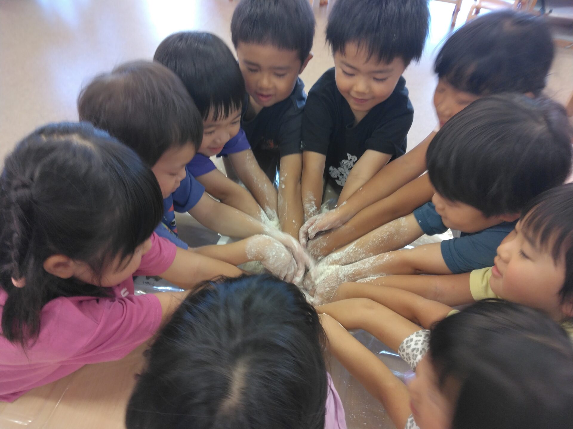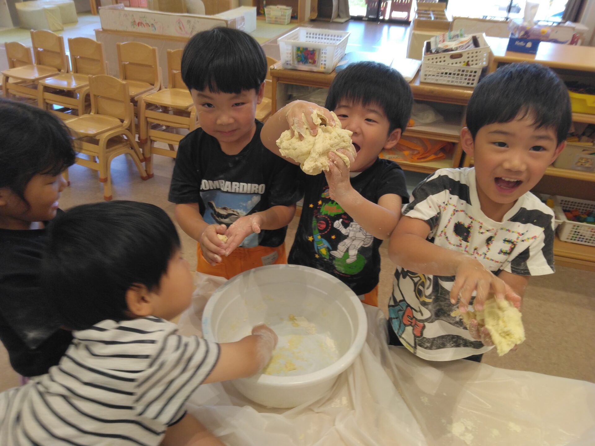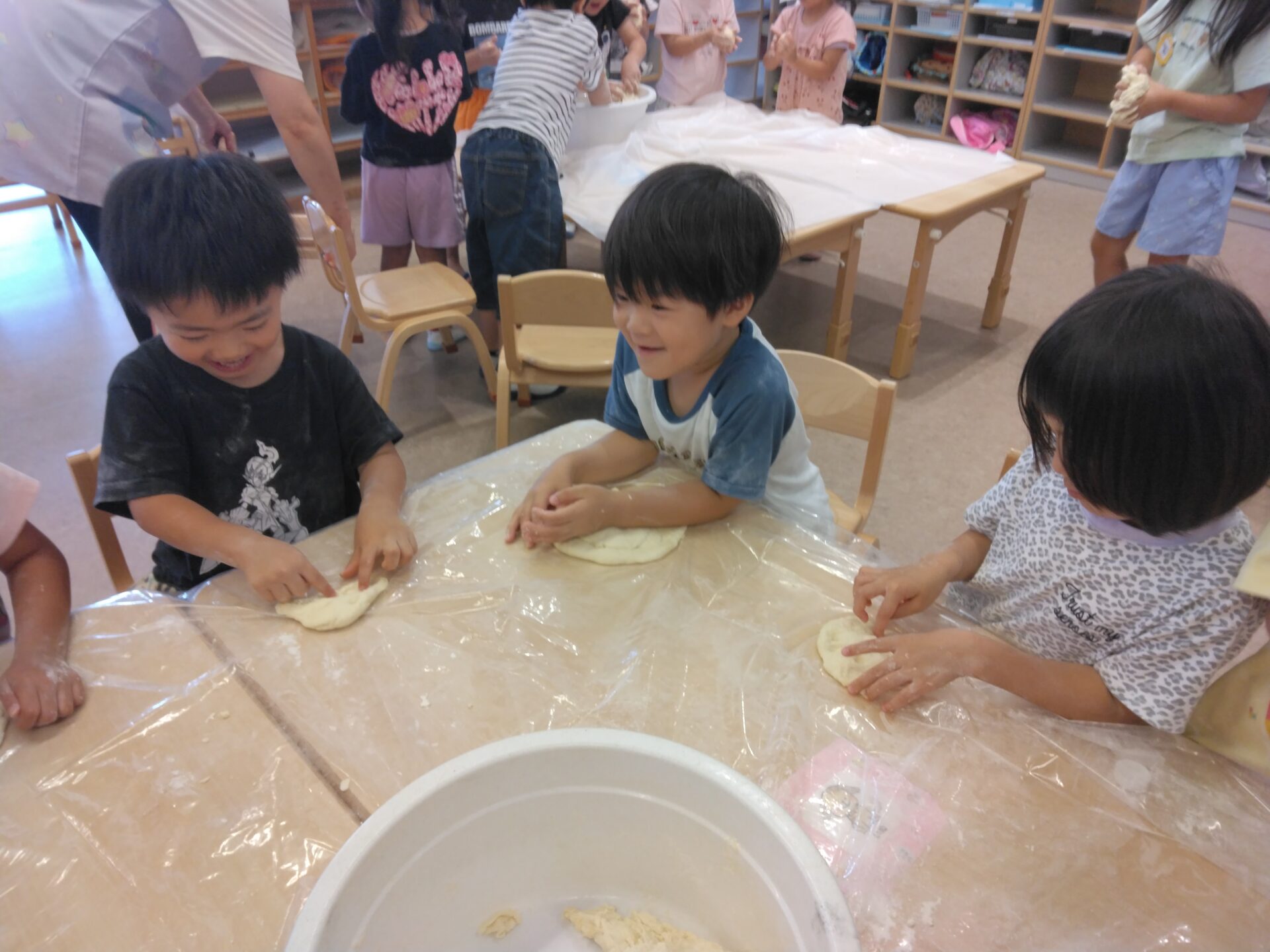 ハートの形のパンを作ったり、ピザのように丸く伸ばして「ピザができた」「なんだかピザの匂いがしてきそう」と、友だちとの会話も楽しんでいました。