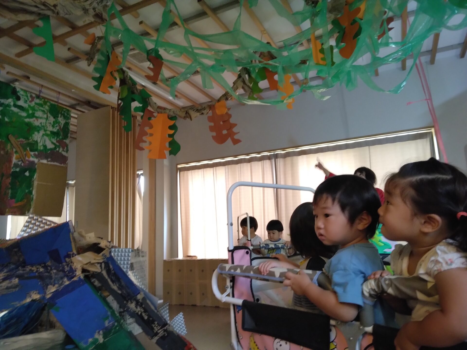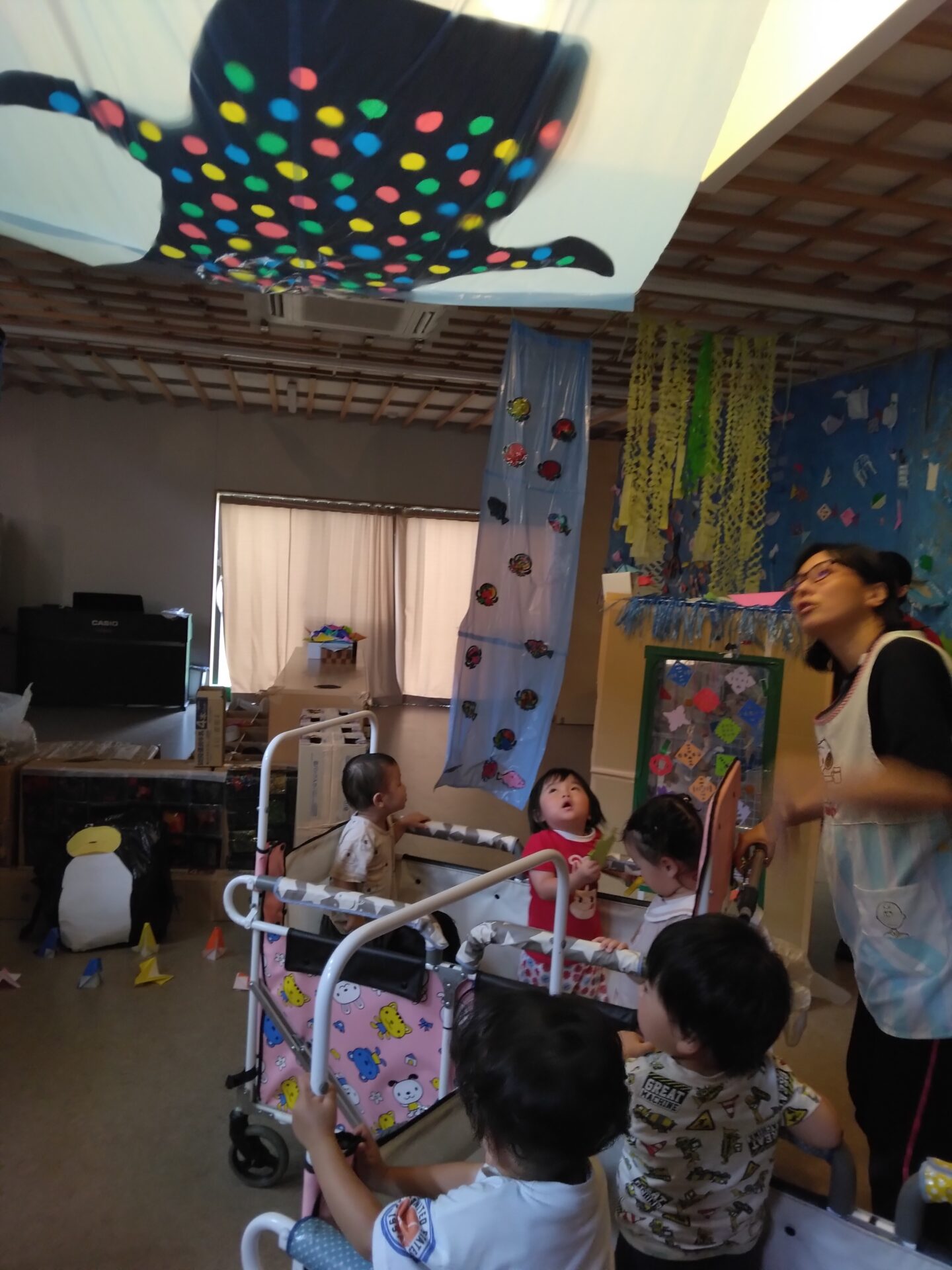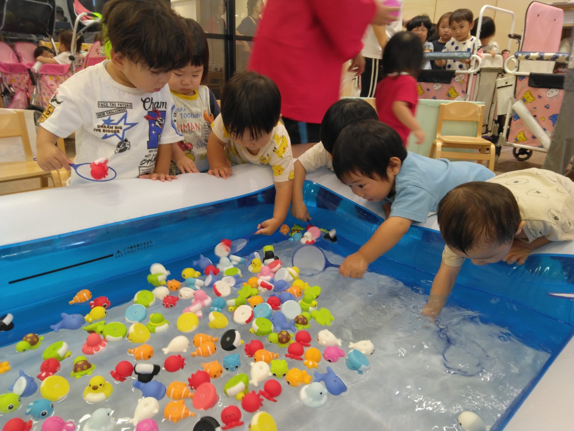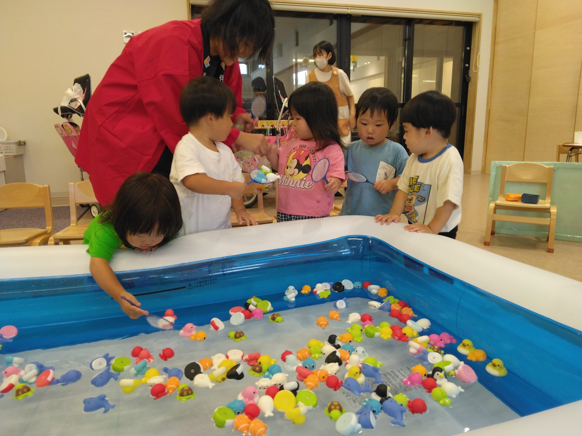 サマーフェスティバルでは、いつもと違う雰囲気にドキドキワクワク。くじらすくいや、よーよーすくいに挑戦したり、ポテトやかき氷のお店屋さんごっこを楽しんだりと盛りだくさんでした。最後は、年長児の部屋で5歳児さんが作ったステンドグラスアートや、恐竜の世界や海の世界を見て、指さして楽しんでいました。