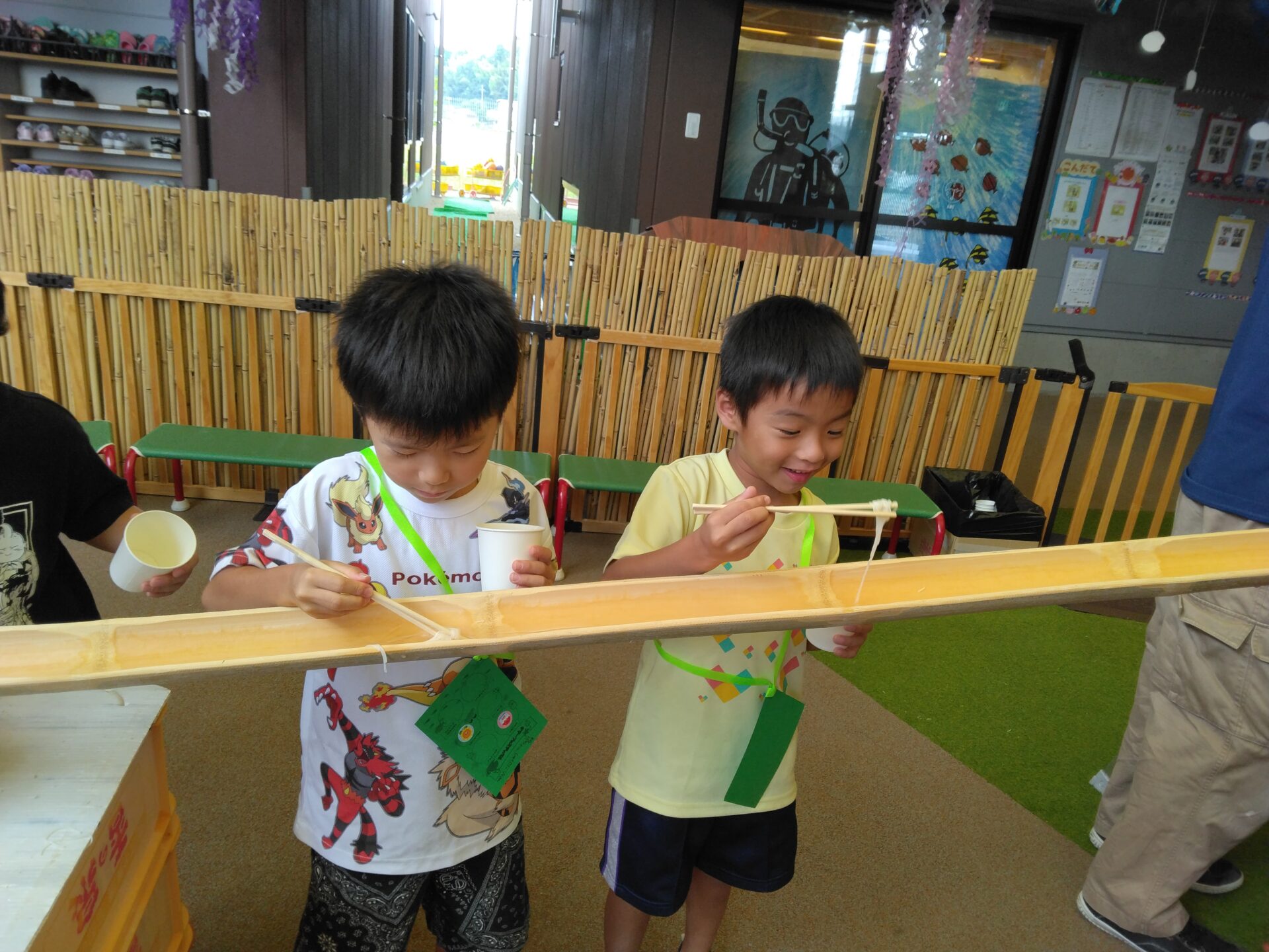 エントランスでは、流しそうめん!!(竹は地域の方にご協力をいただきました)