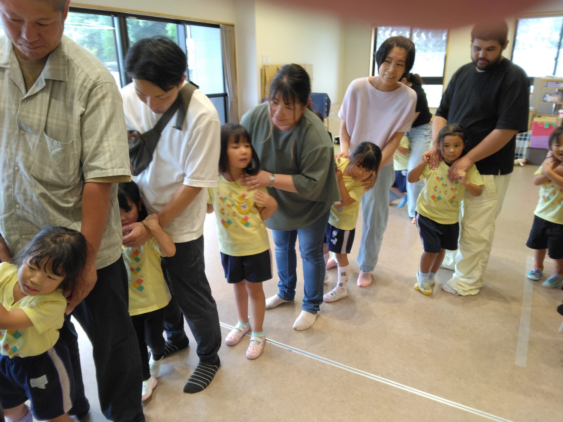「とんとん肩たたき」「じゃんけん列車」「お寺のおしょうさん(ロングバージョン)」を親子で楽しみました。