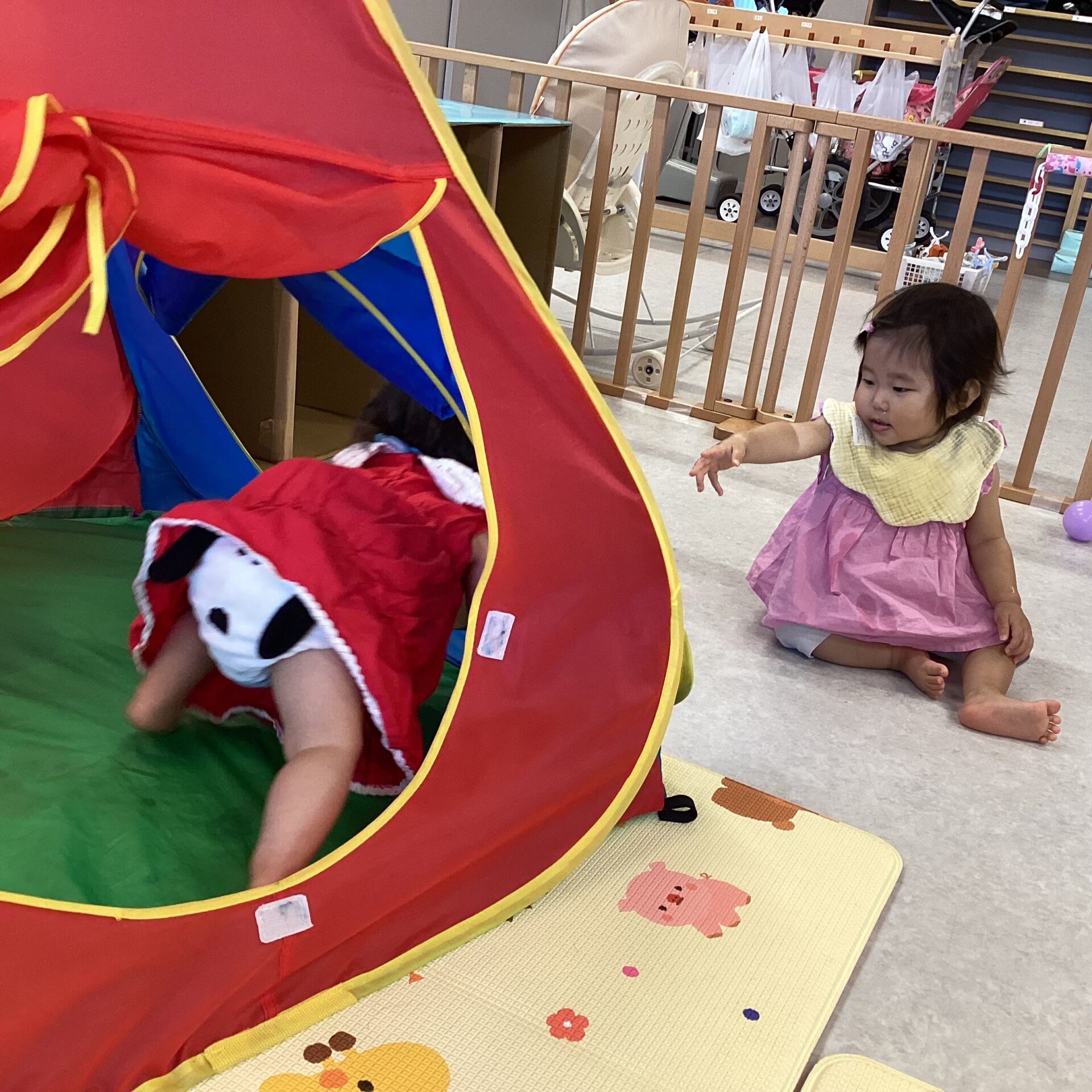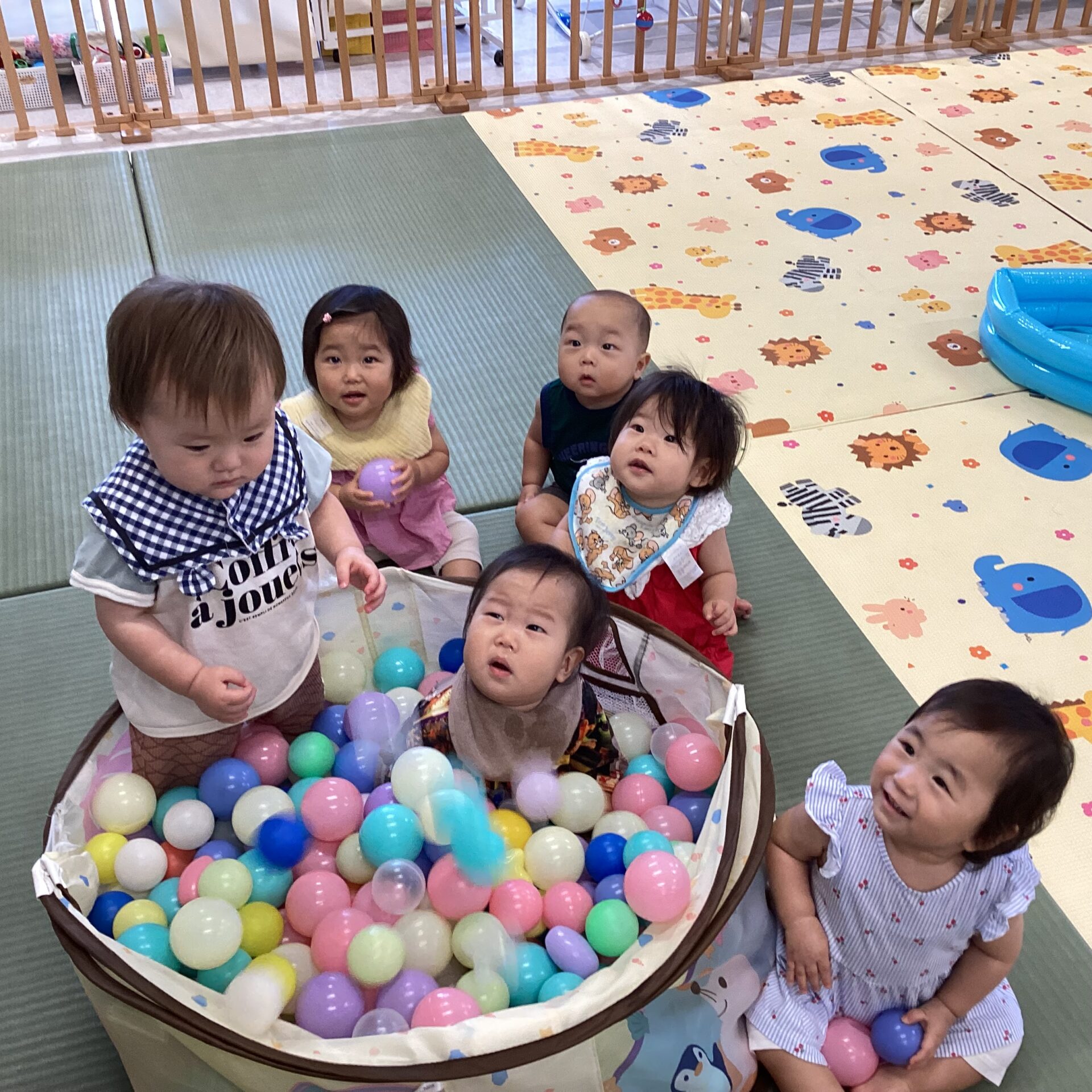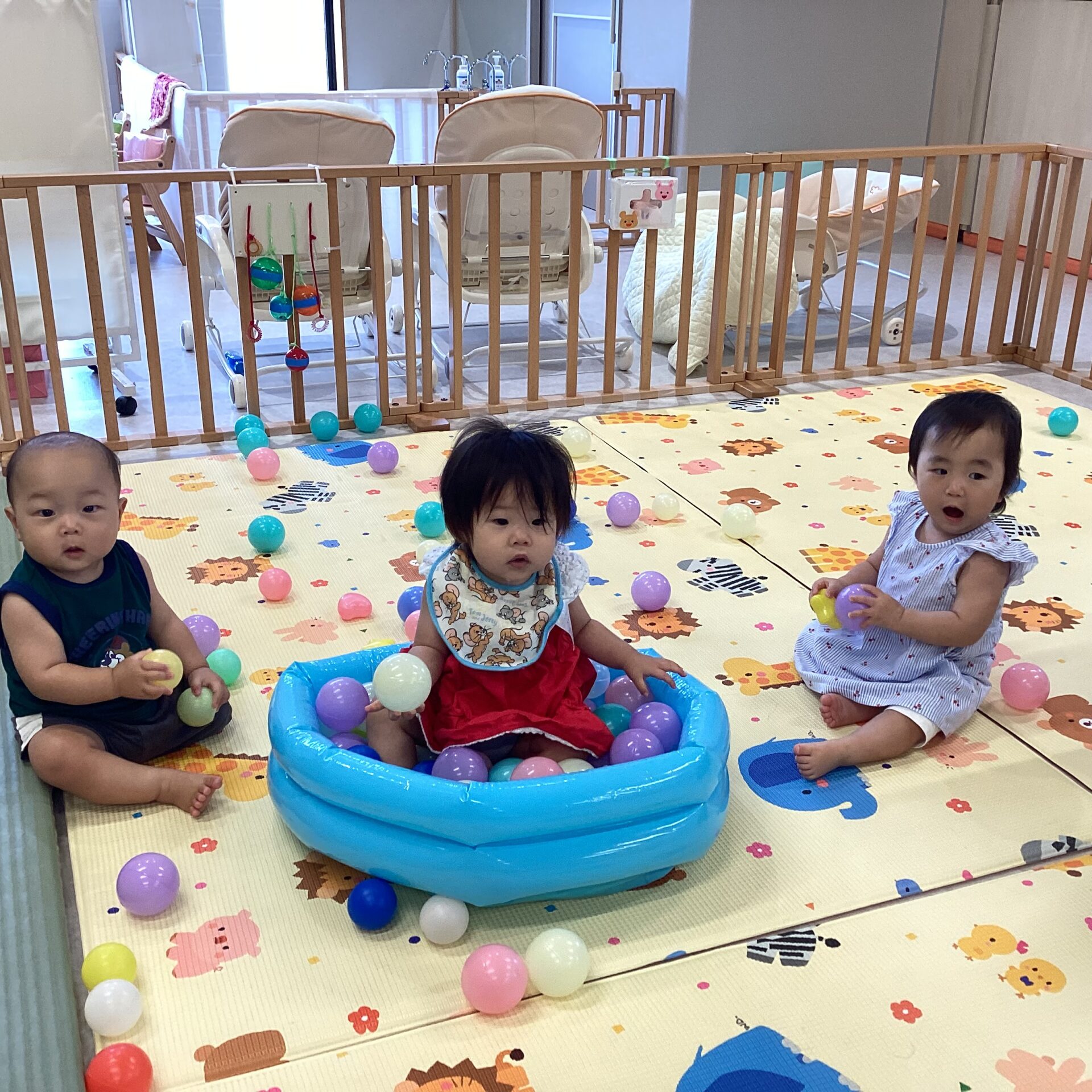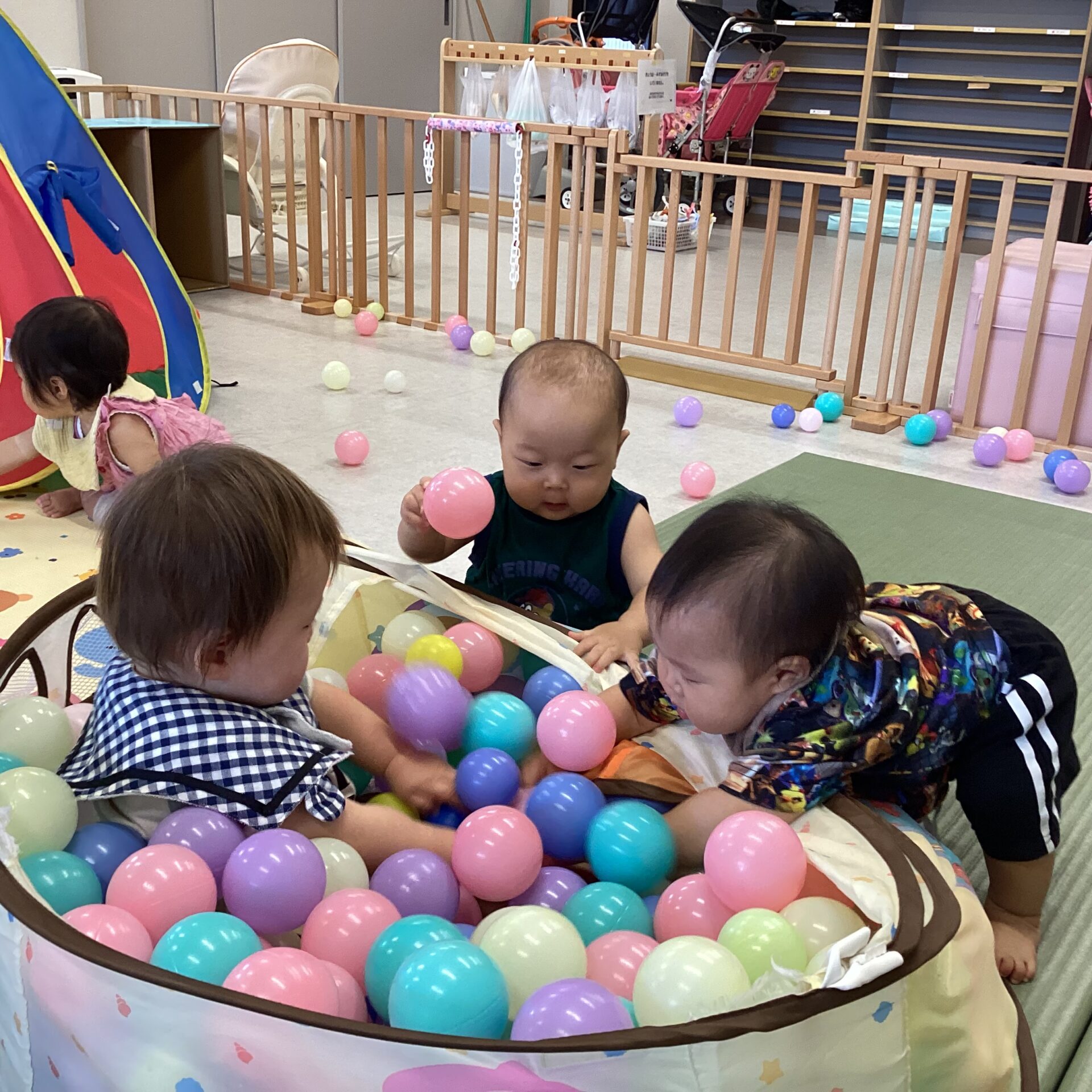 ボールに埋もれて感触を楽しんだり、ポイっと投げて楽しんだりしました。