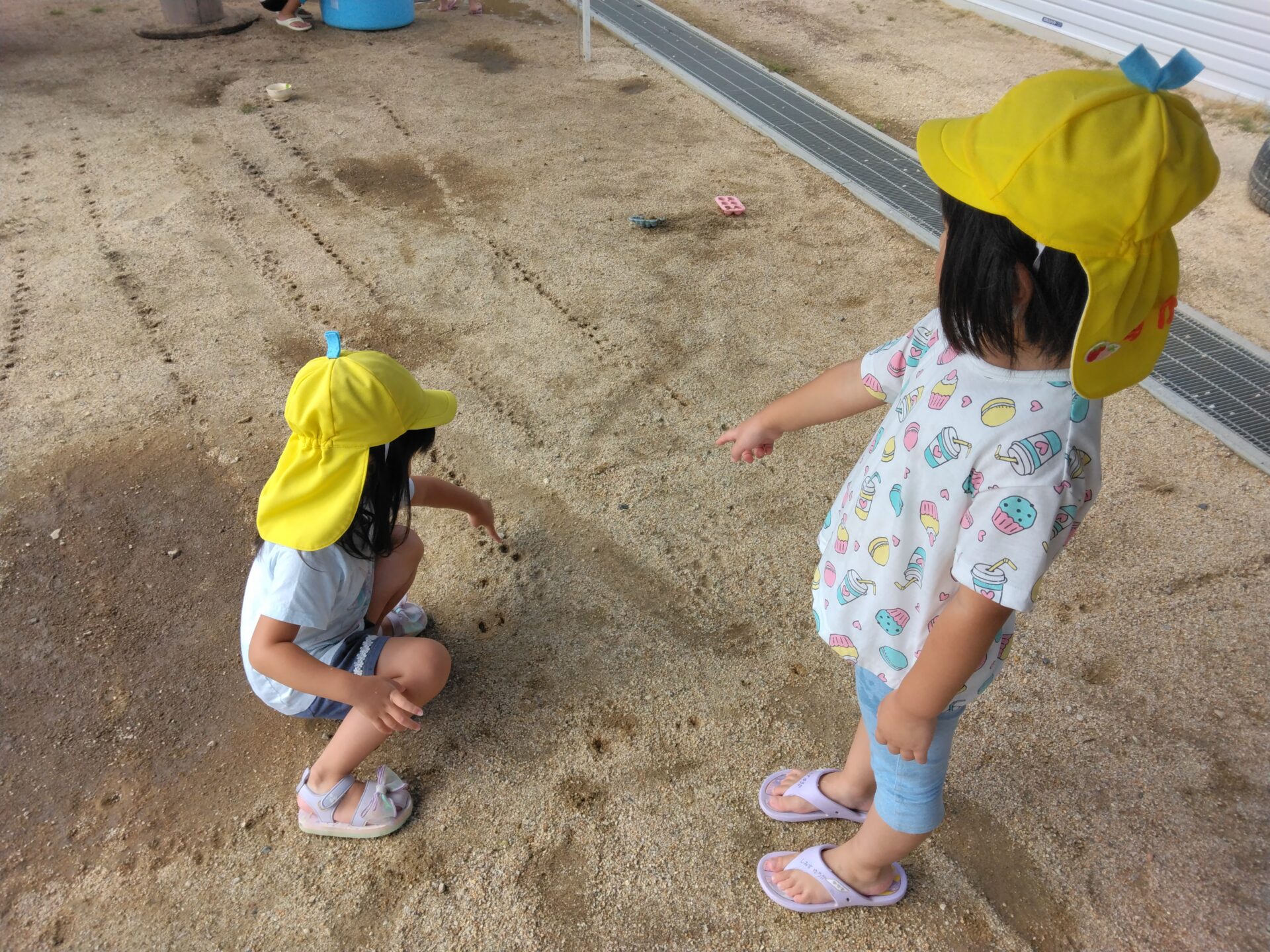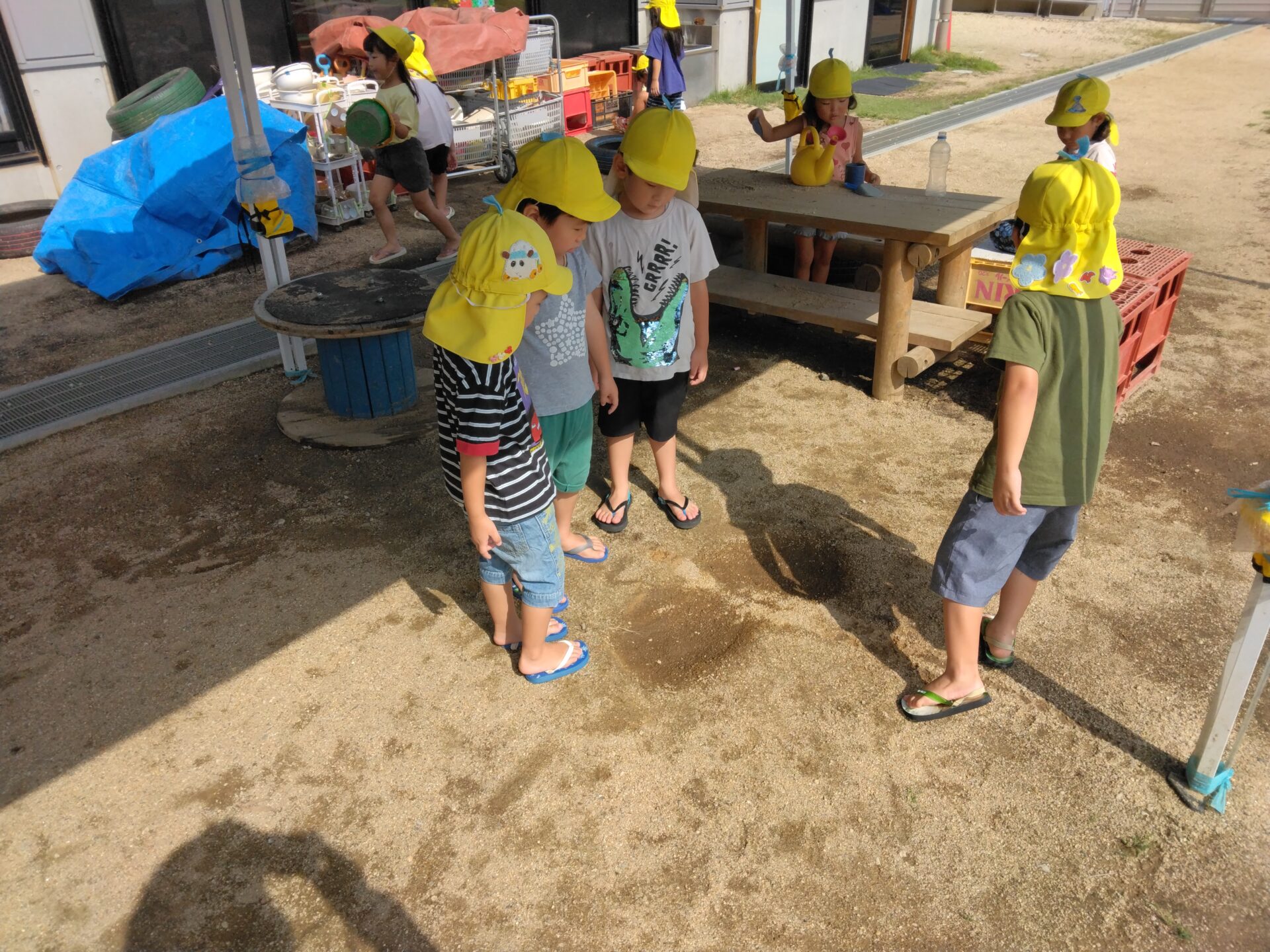 昨日の雨粒の跡が、子どもたちの想像膨らむものに変身していきました。