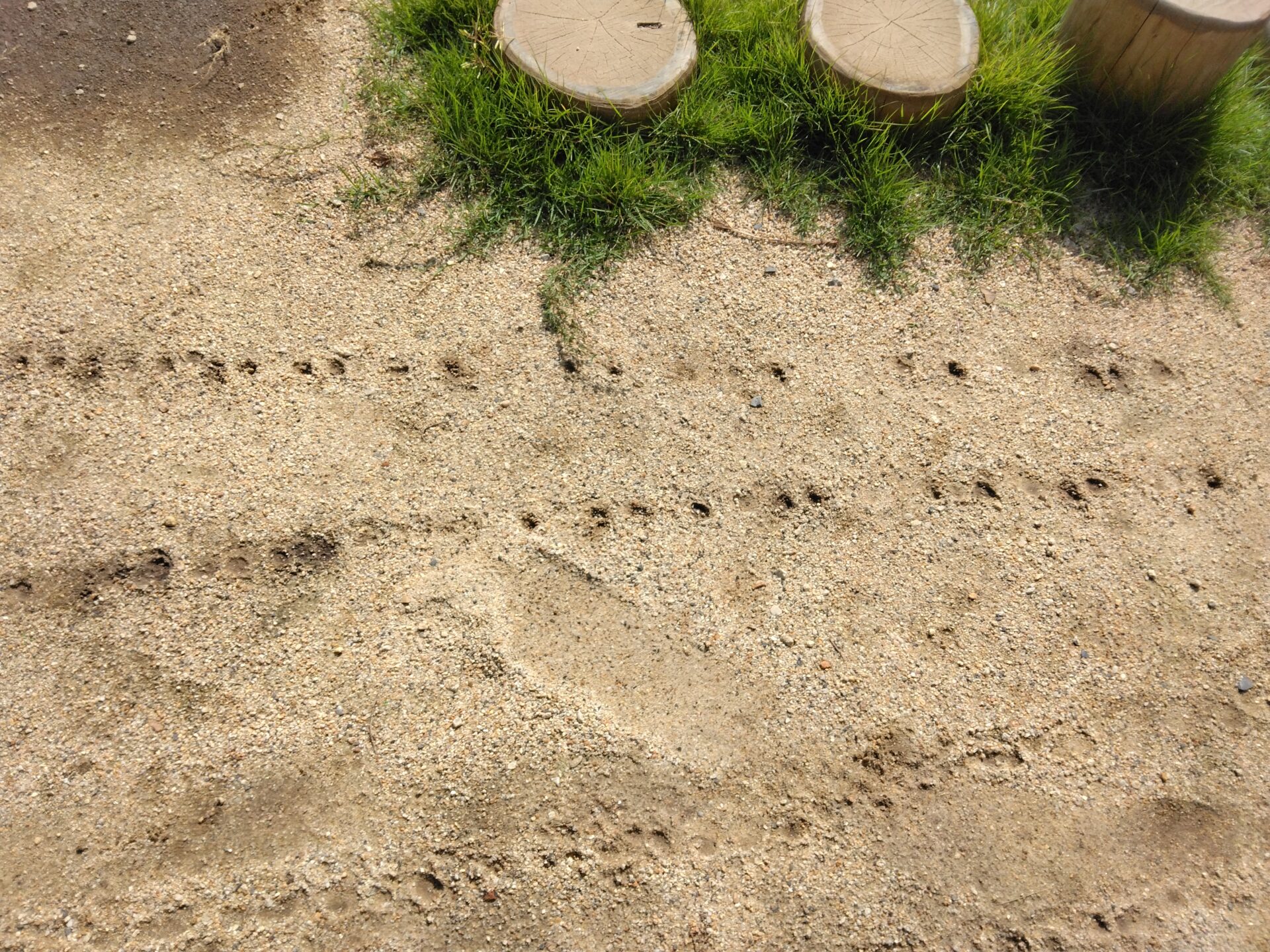 園庭にたくさんの跡が・・・「こっちにもあるで~」カンガルーの足跡探しが始まりました。