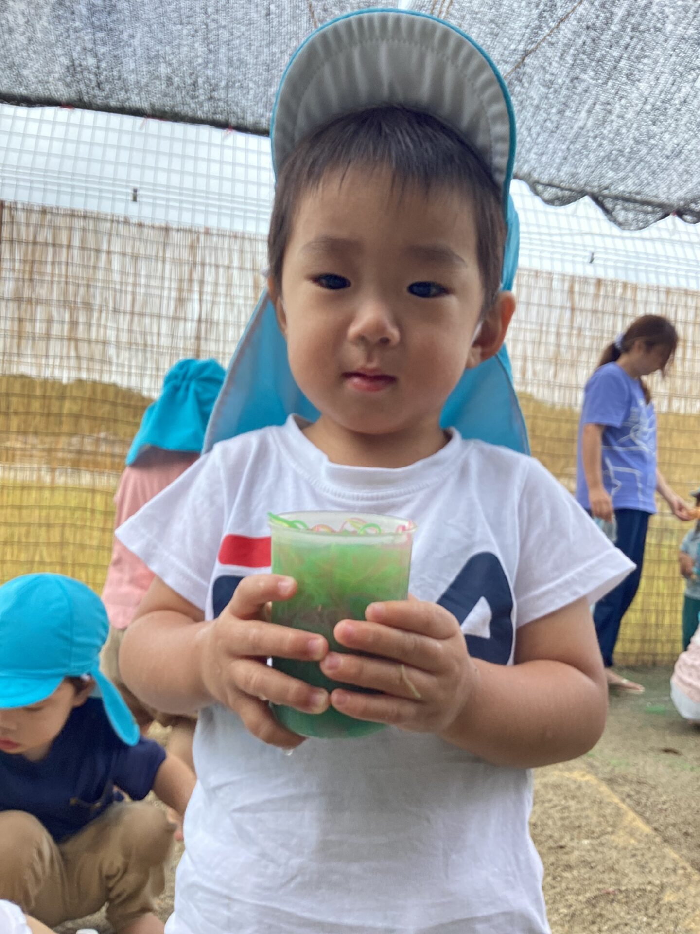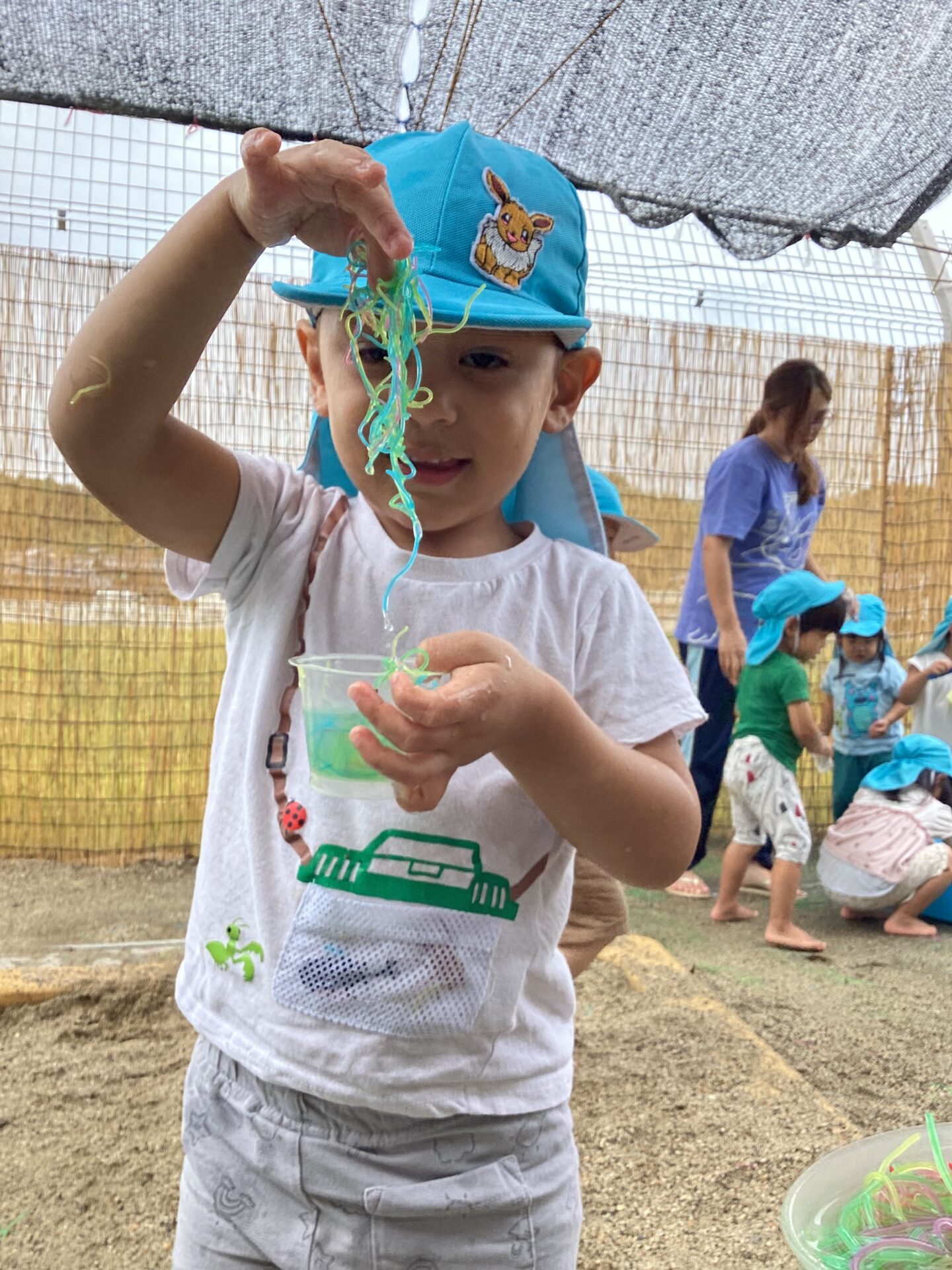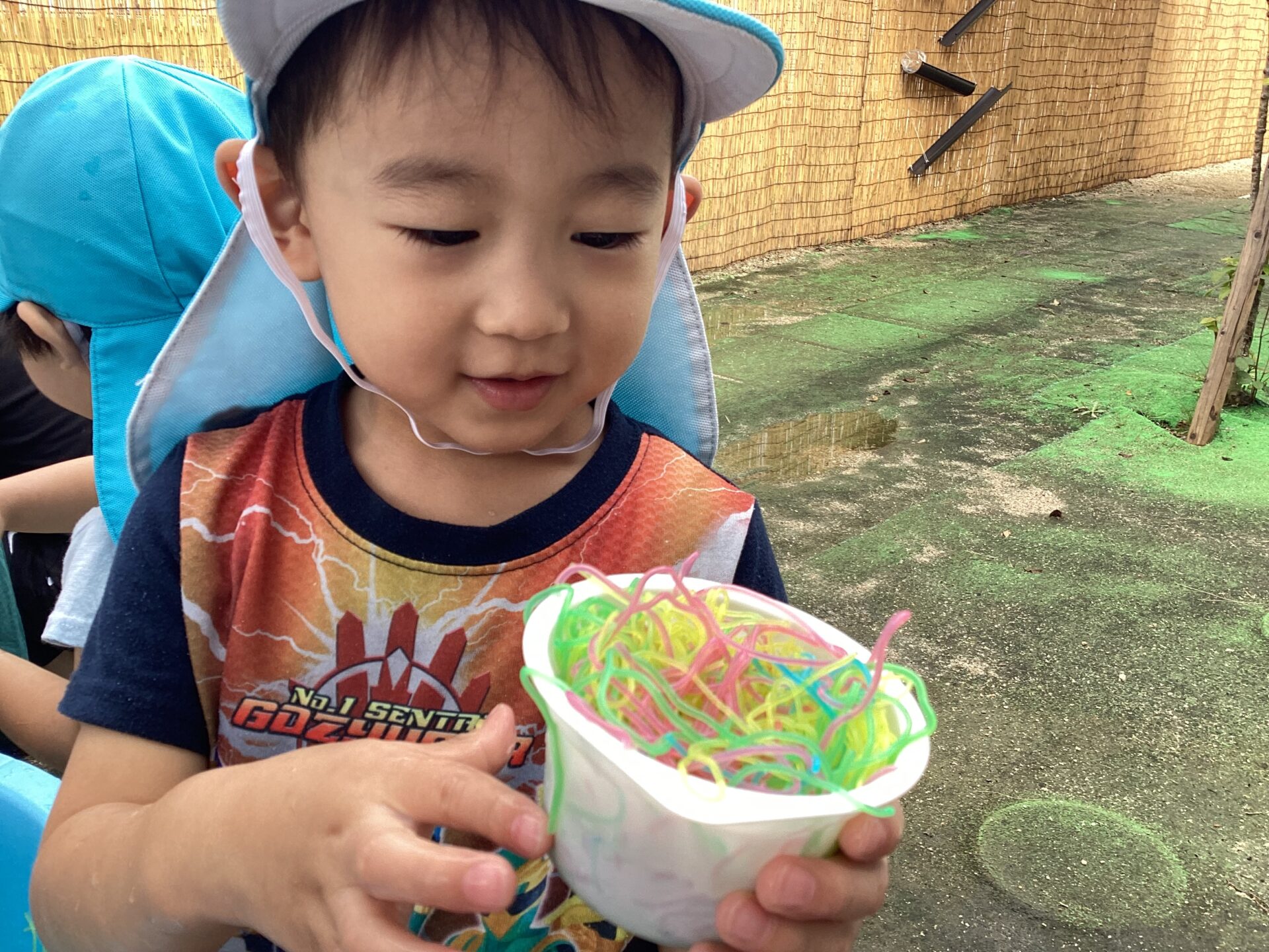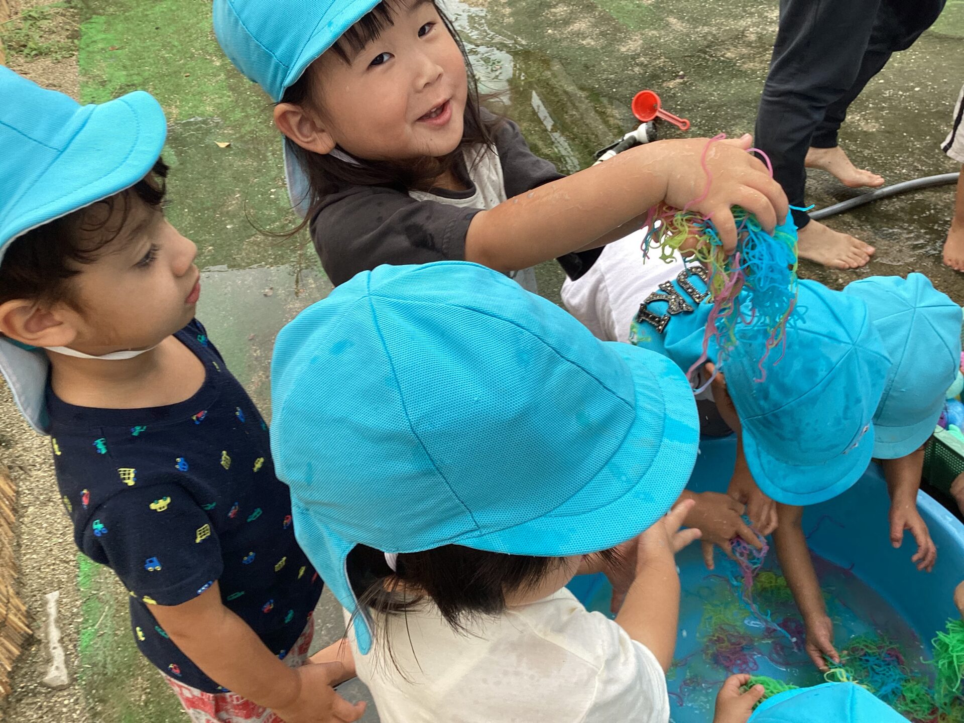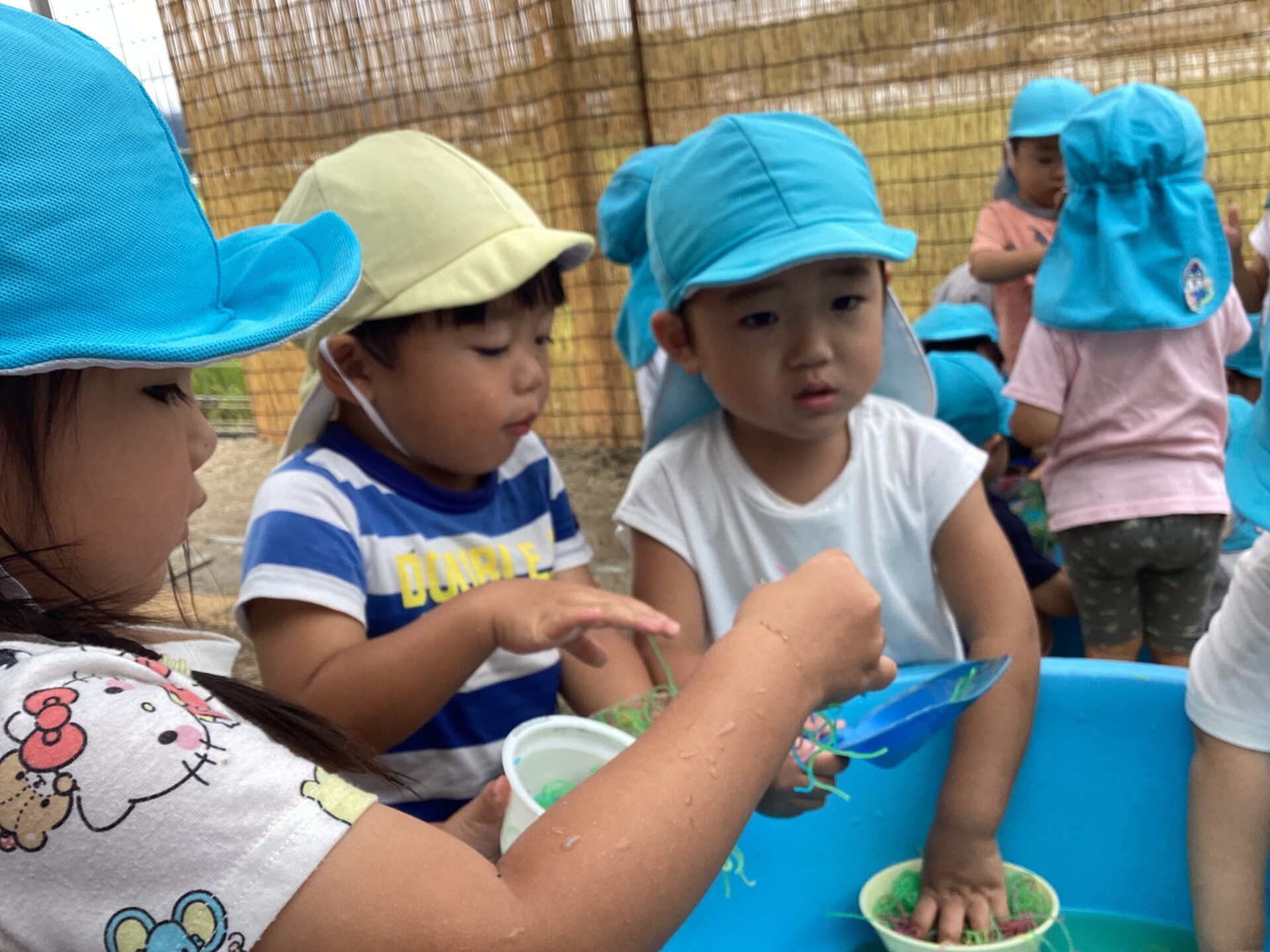 色とりどりの春雨を冷蔵庫で冷やして、戸外に持ち出し手遊びました。手にすると「つめた~い!」と感触を楽しむ姿が見られ、さらに「ラーメンみたい!」と、容器に入れてごっこ遊びを広げる子どもたちもいました。