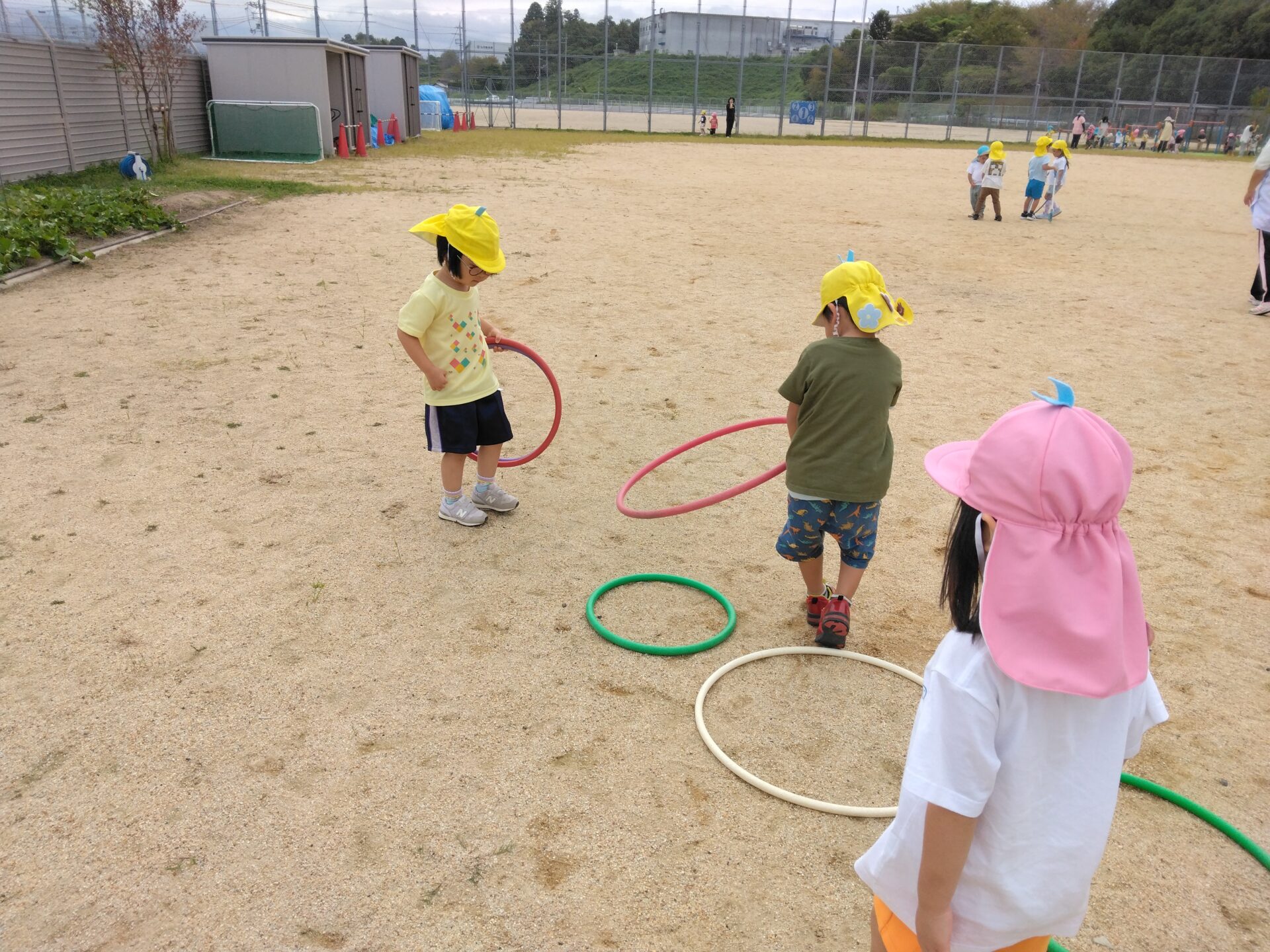 さらに「フープもつなげよう!」と自分たちで工夫し、タイヤからフープの道へと広がっていく遊びを楽しんでいました。