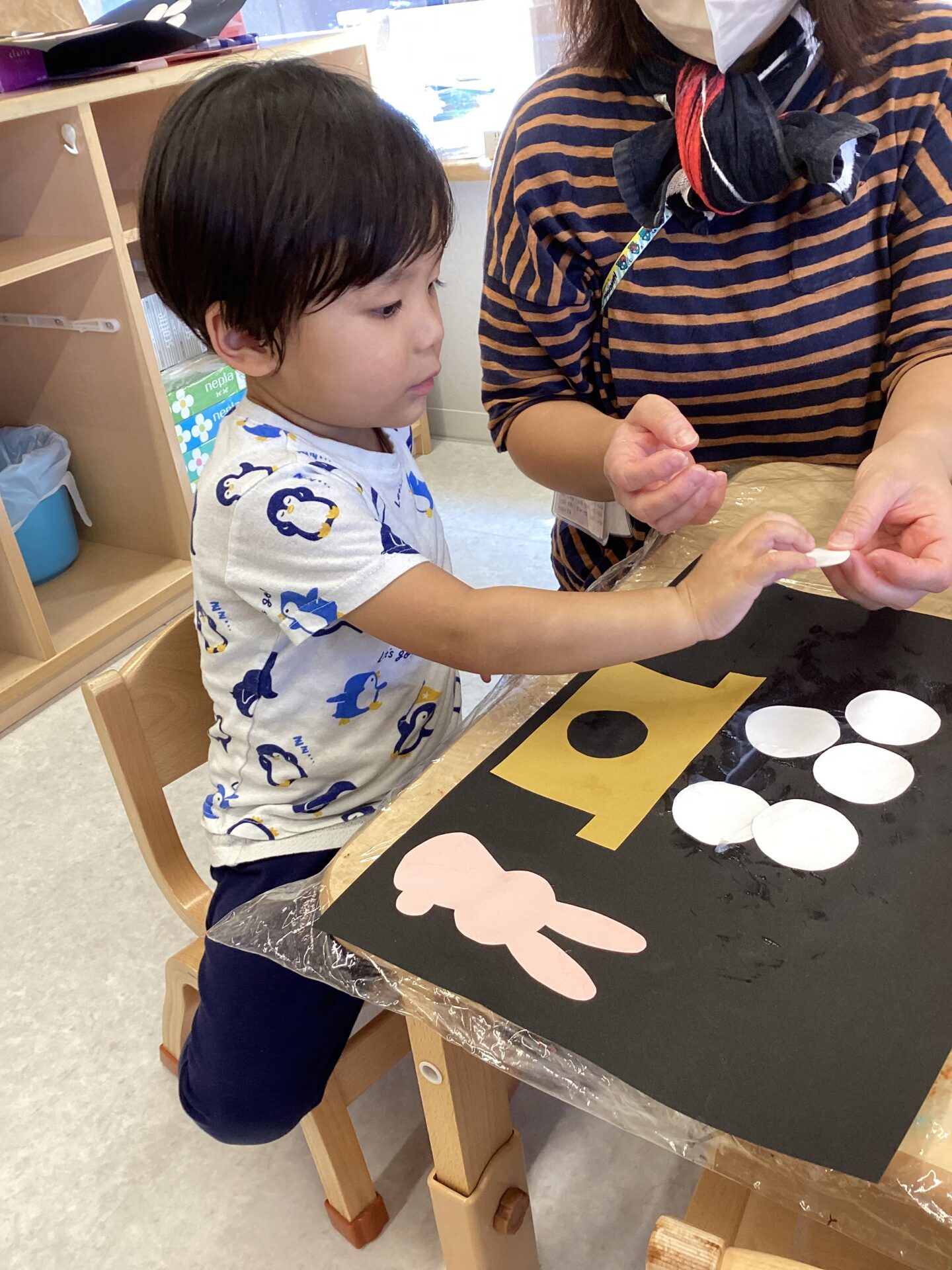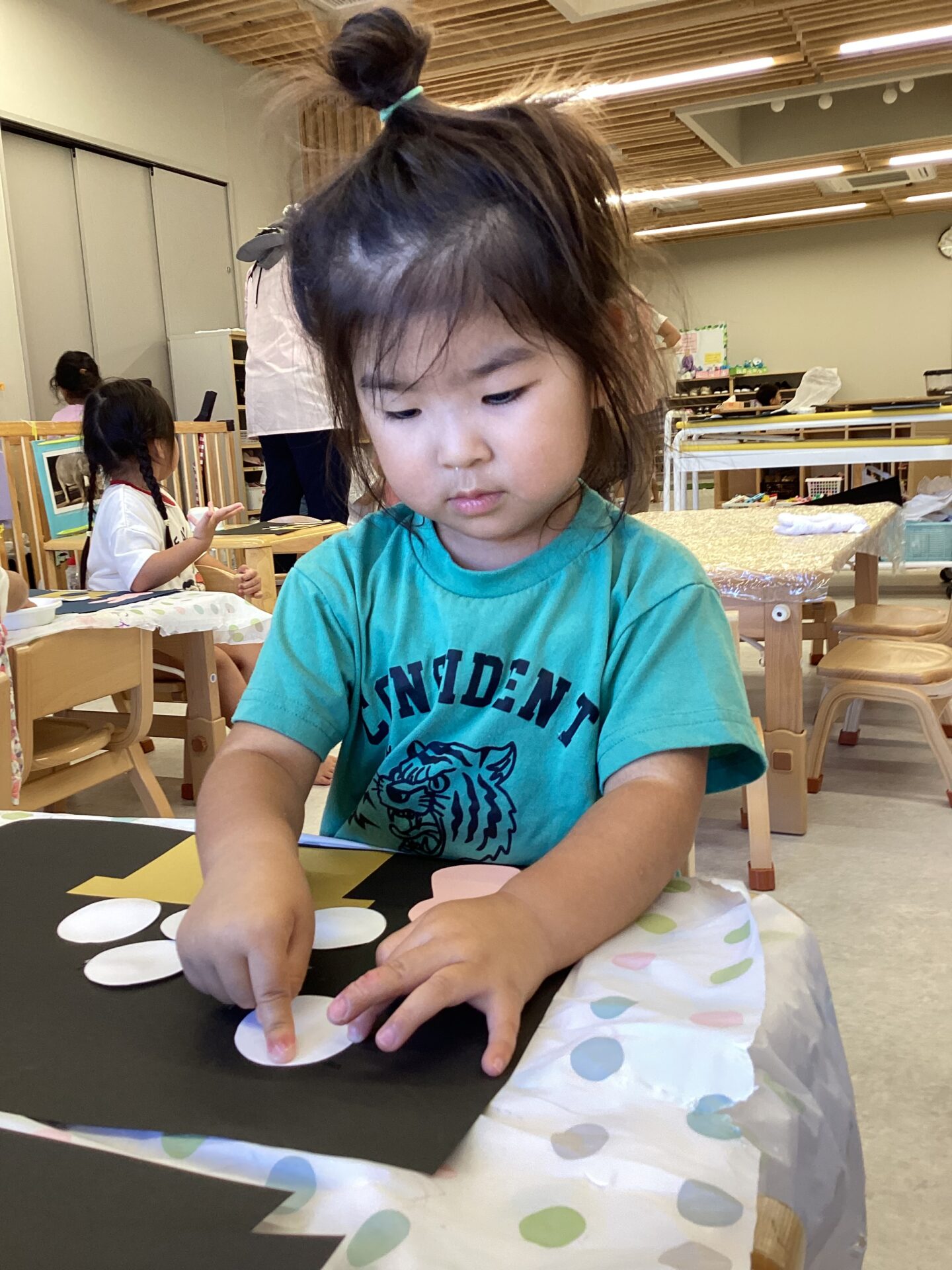 絵本を見て、「同じに貼る!!」とじっくり見ながら積み上げるように貼る子・・・とさまざま。