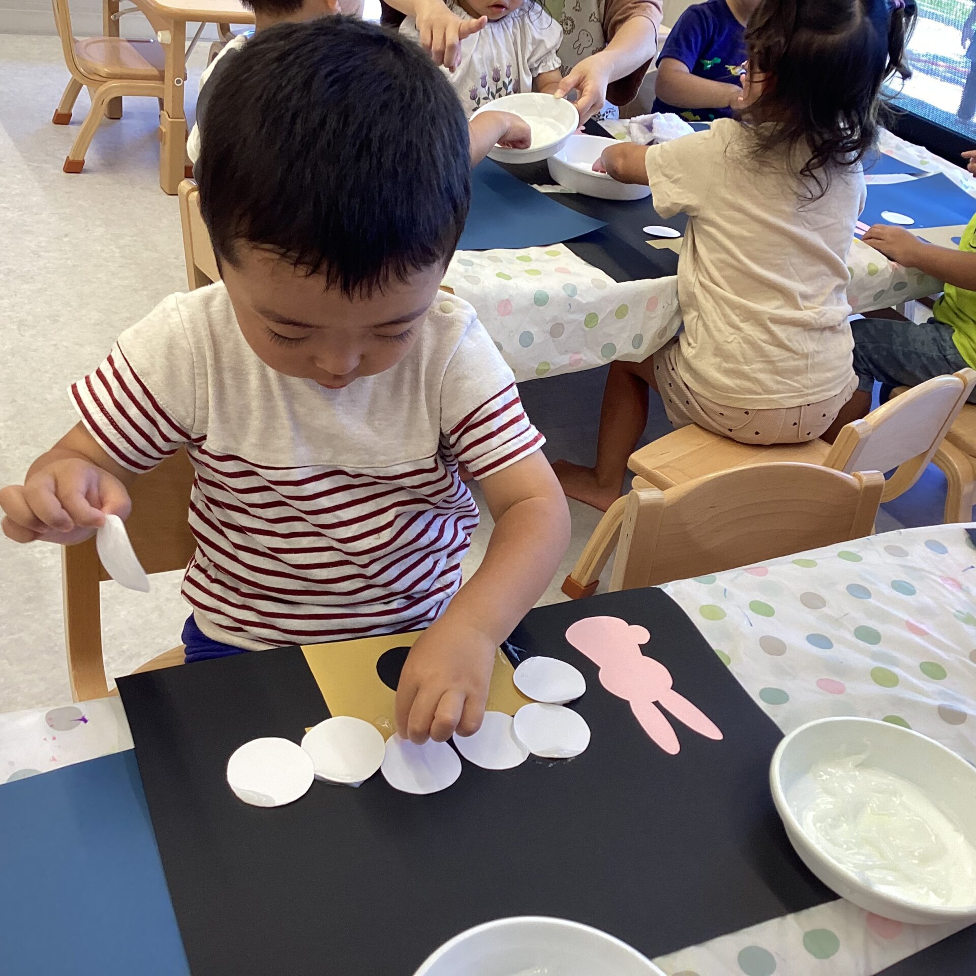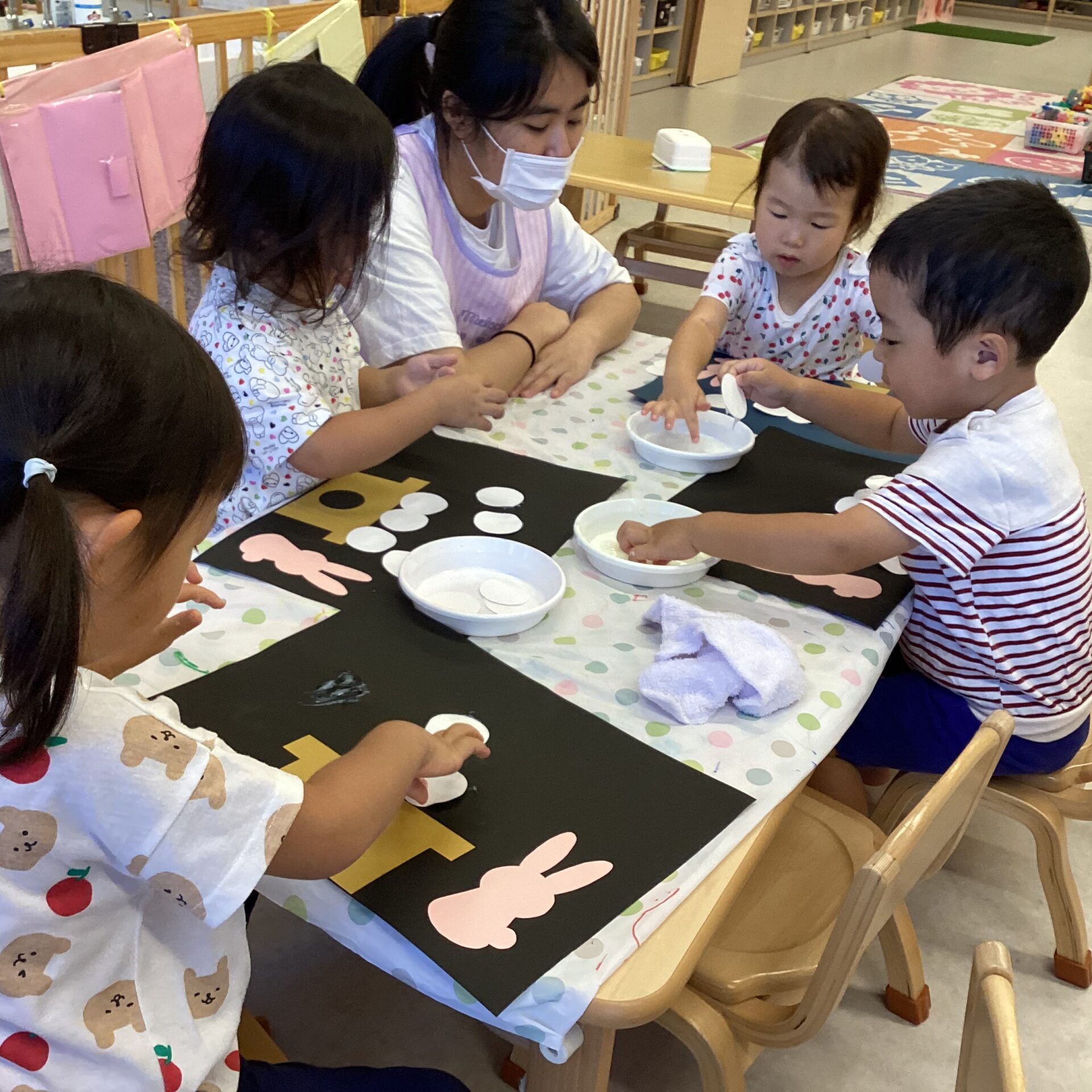 今回は、お月見で大事な ” 月見団子 ” を糊を使って貼りました。
