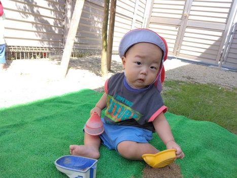 最初は「なにするの?」の表情も、だんだん楽しくなって、笑顔で砂の感触を楽しんでいました。