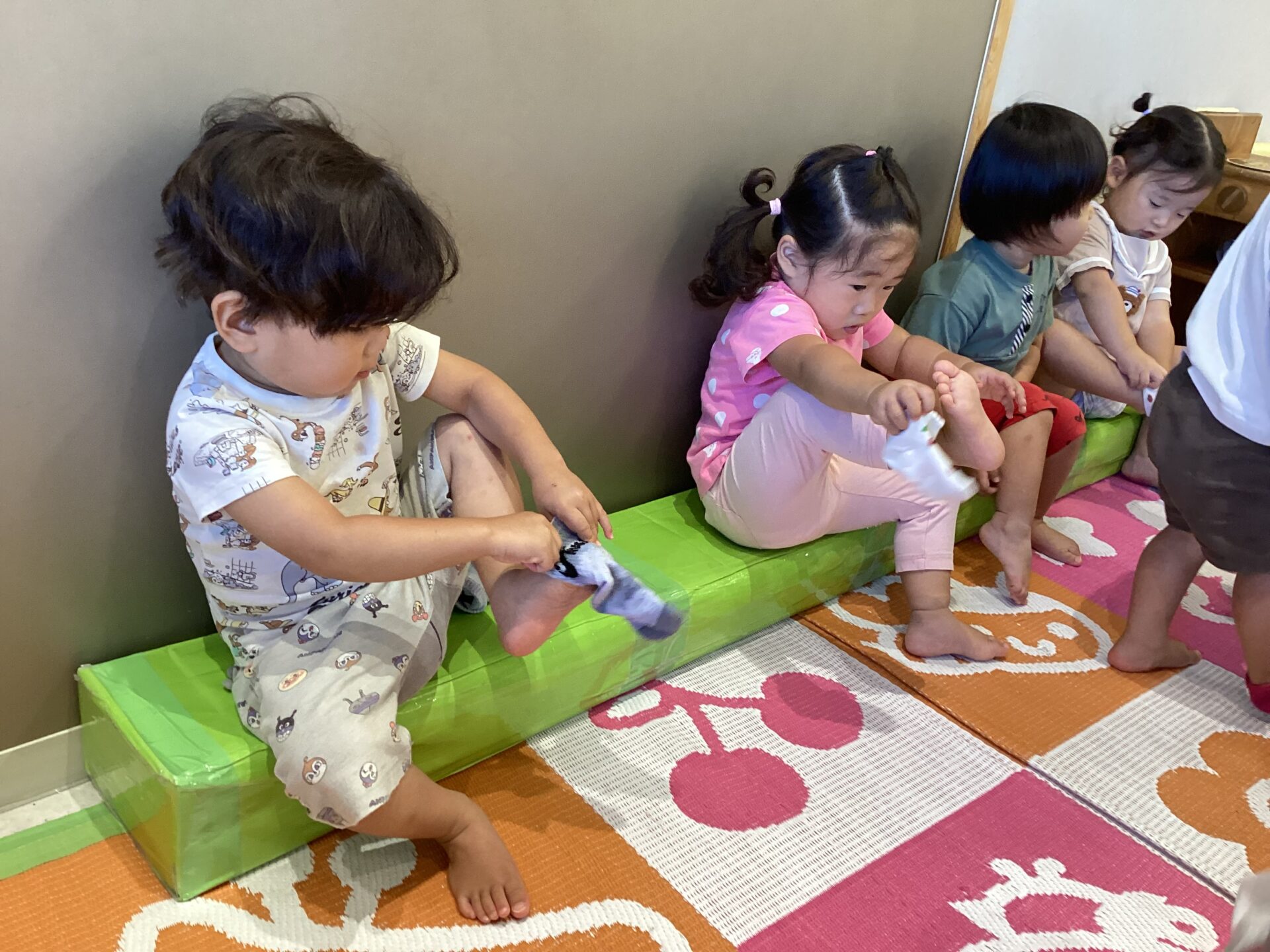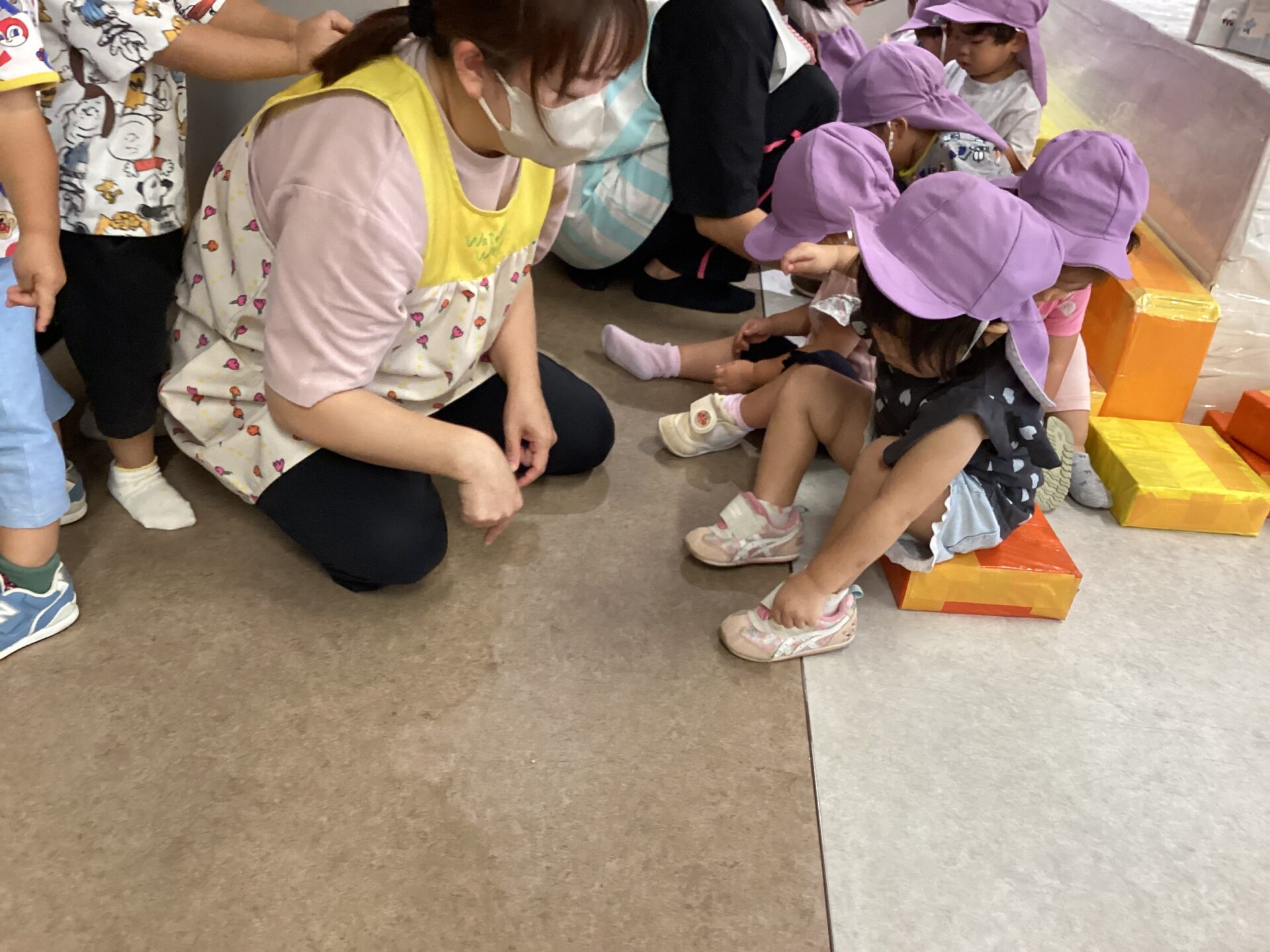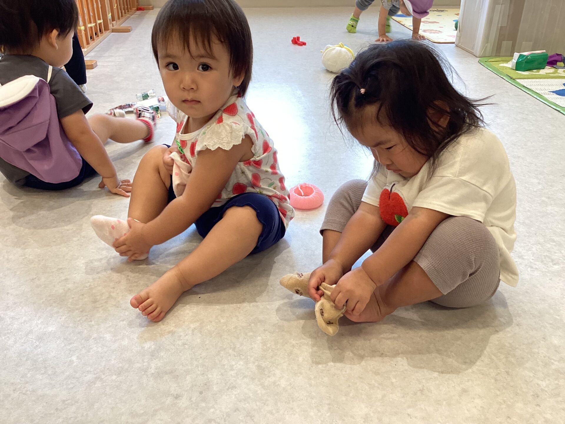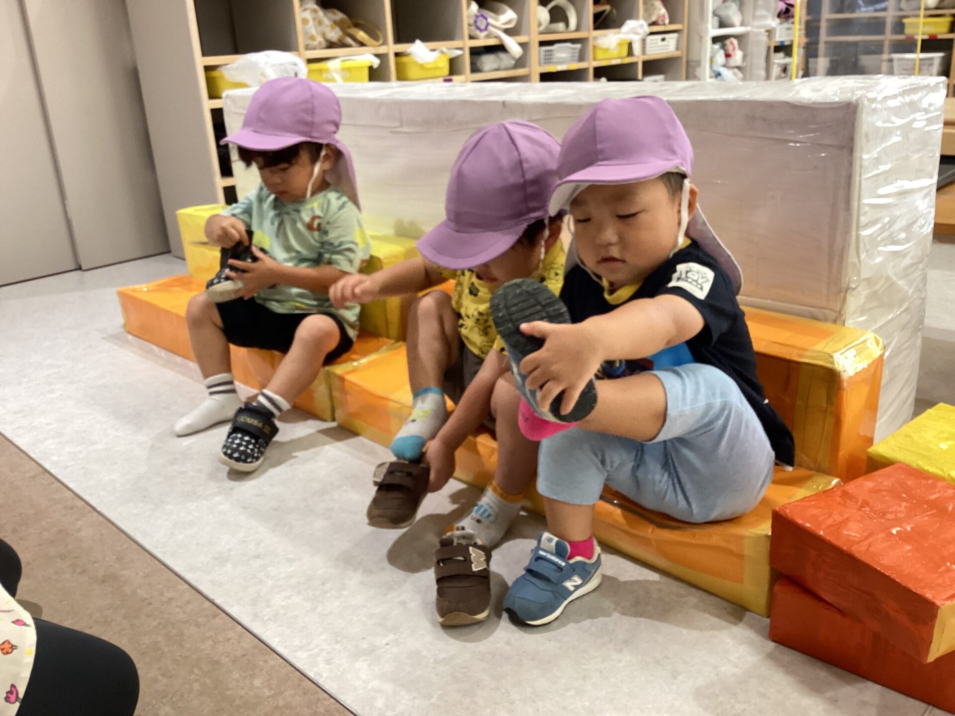 保育者がさりげなく手伝うと自分で履けた満足感があり、にっこり嬉しそうです。