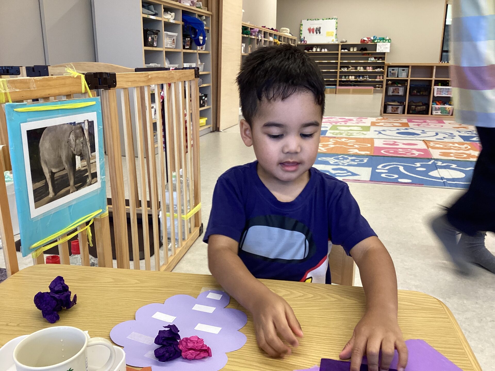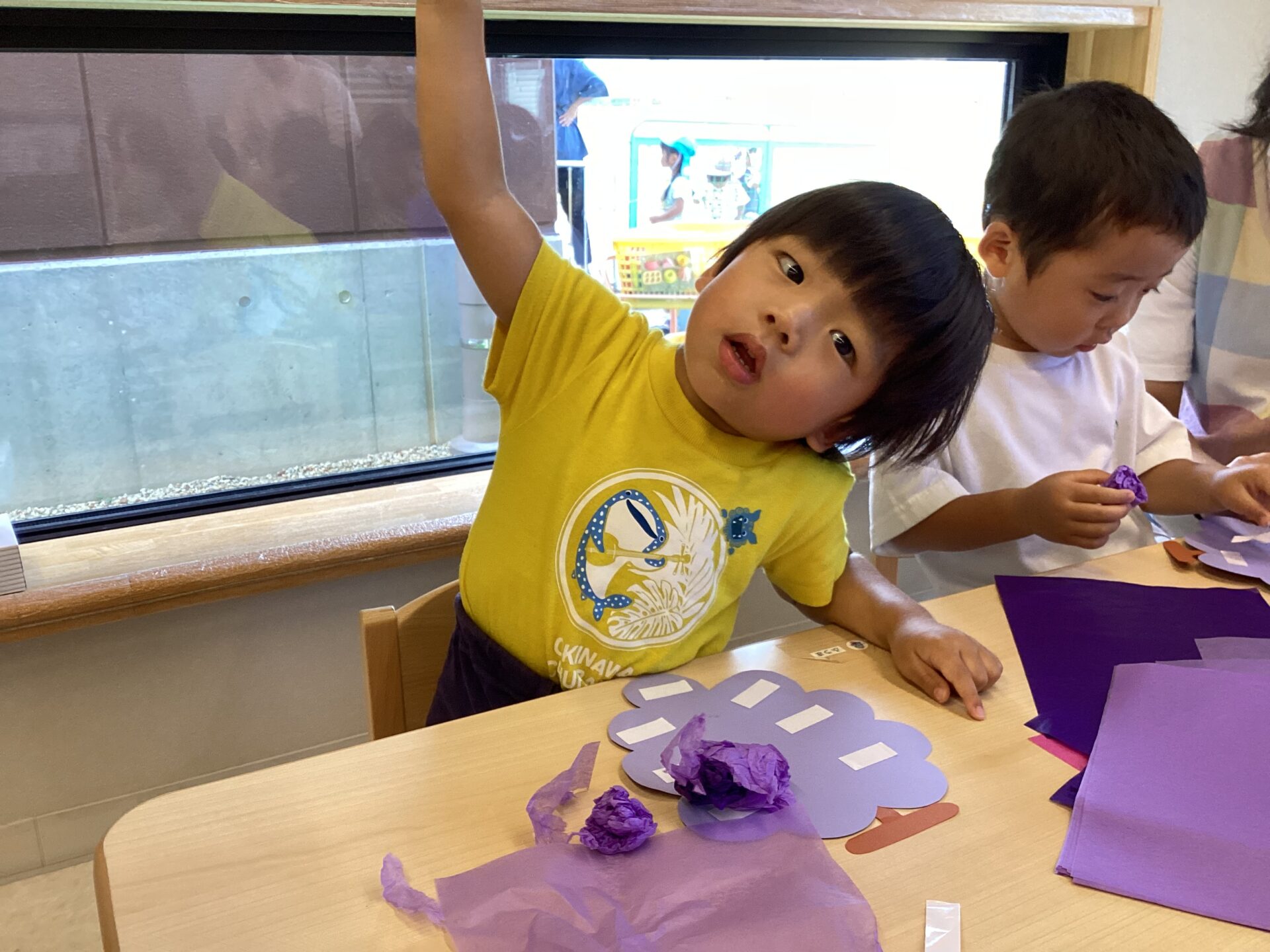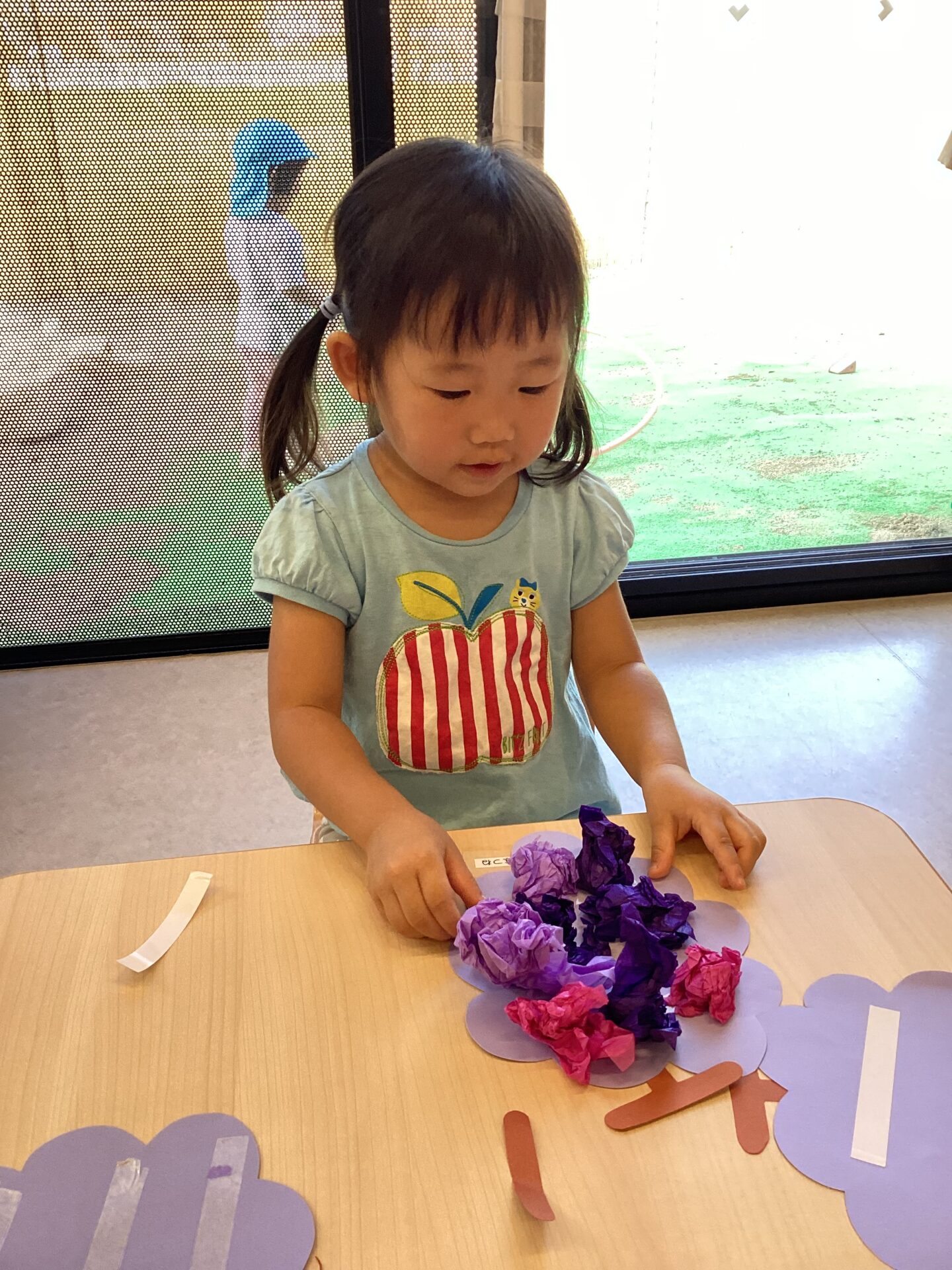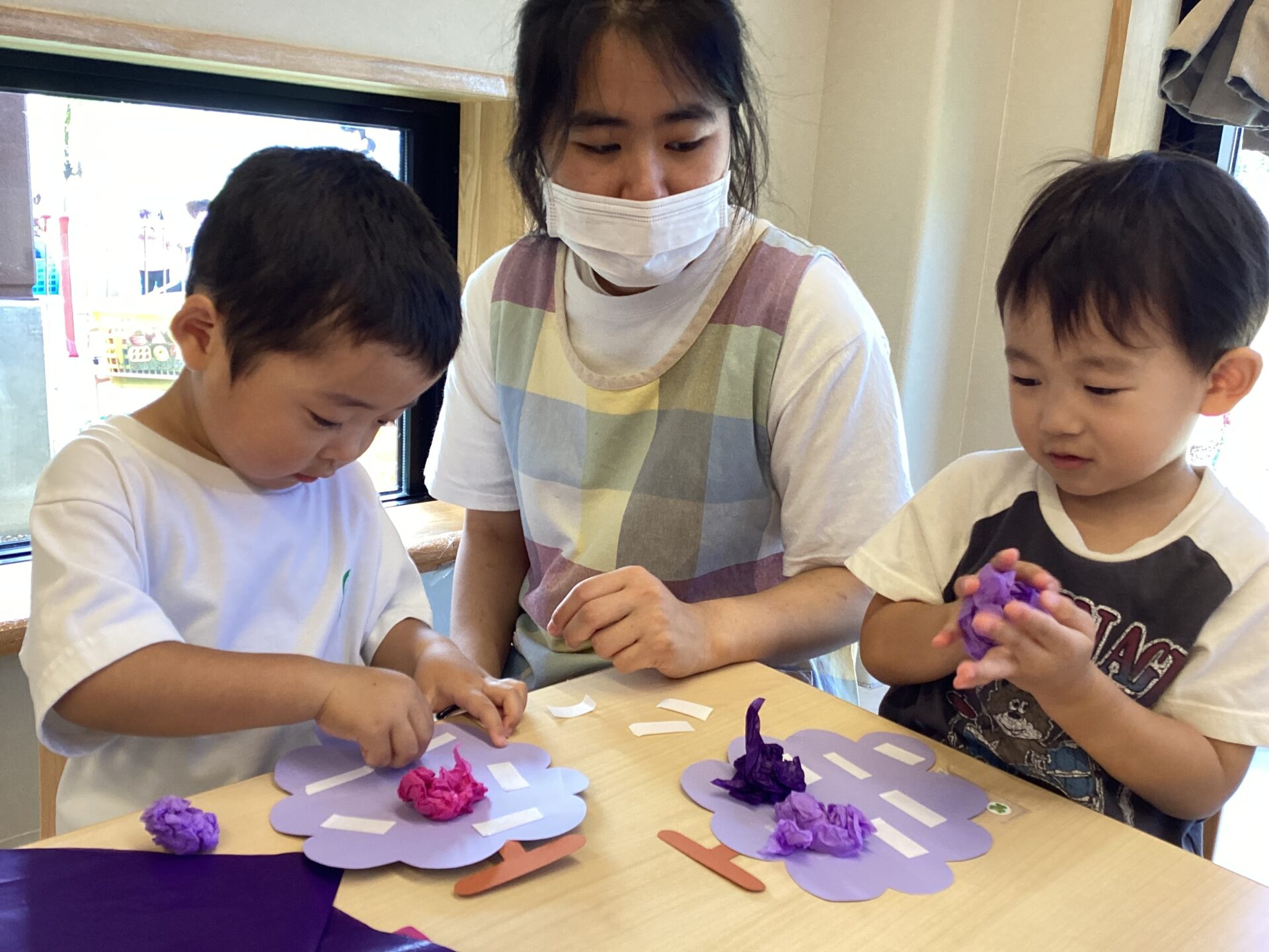 2025.10.03 お知らせ 2歳児 あめチーム 「丸々ぶどう!」 「ぶどう」を作りました。両面テープを外して、花紙を丸めてペタリ。丸めながら「ぶどうになーれ!」と念じている姿がとても面白かったです。 一覧へ戻る