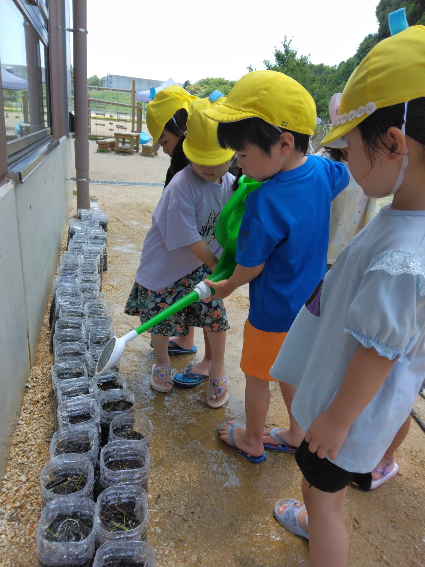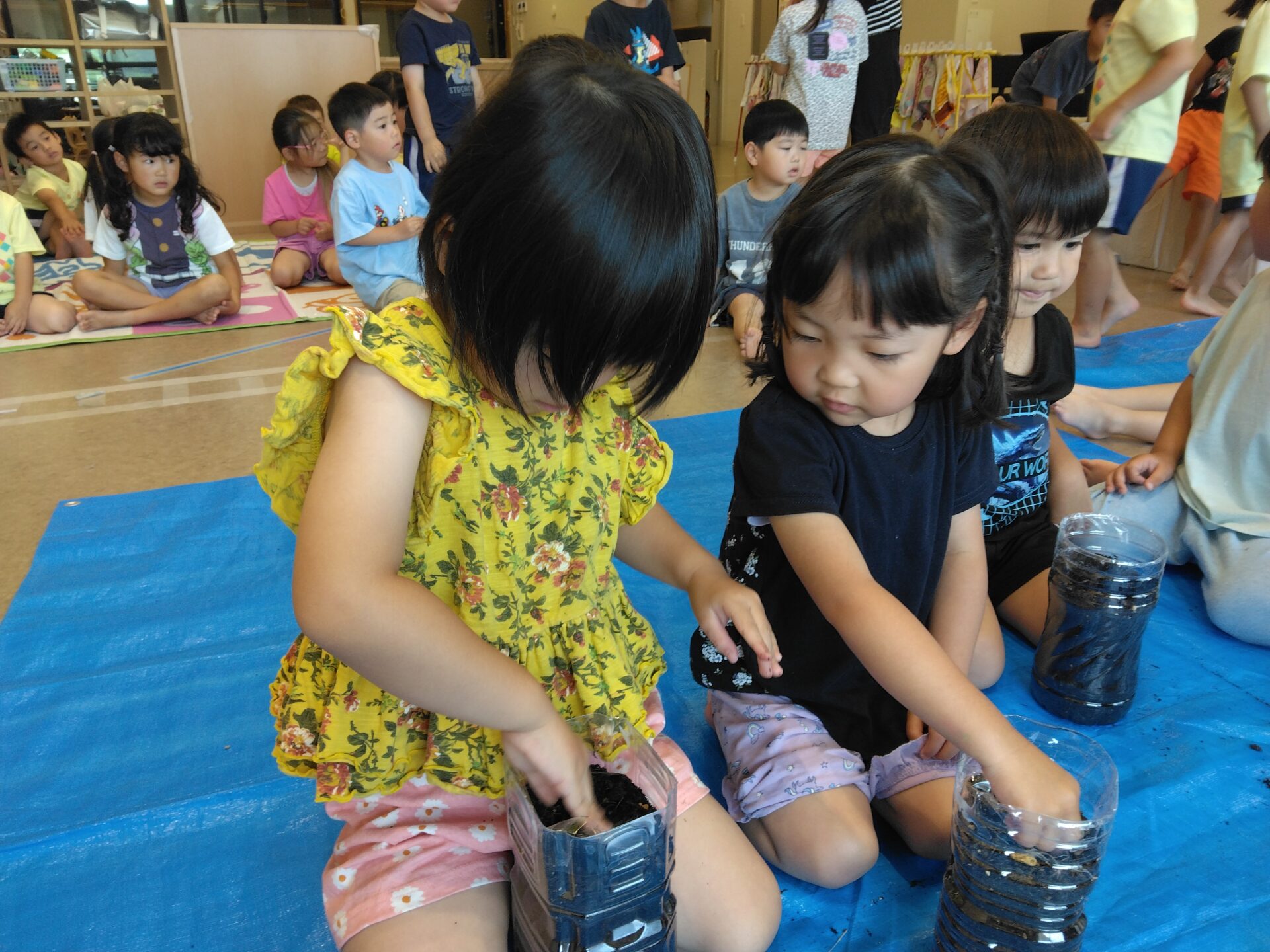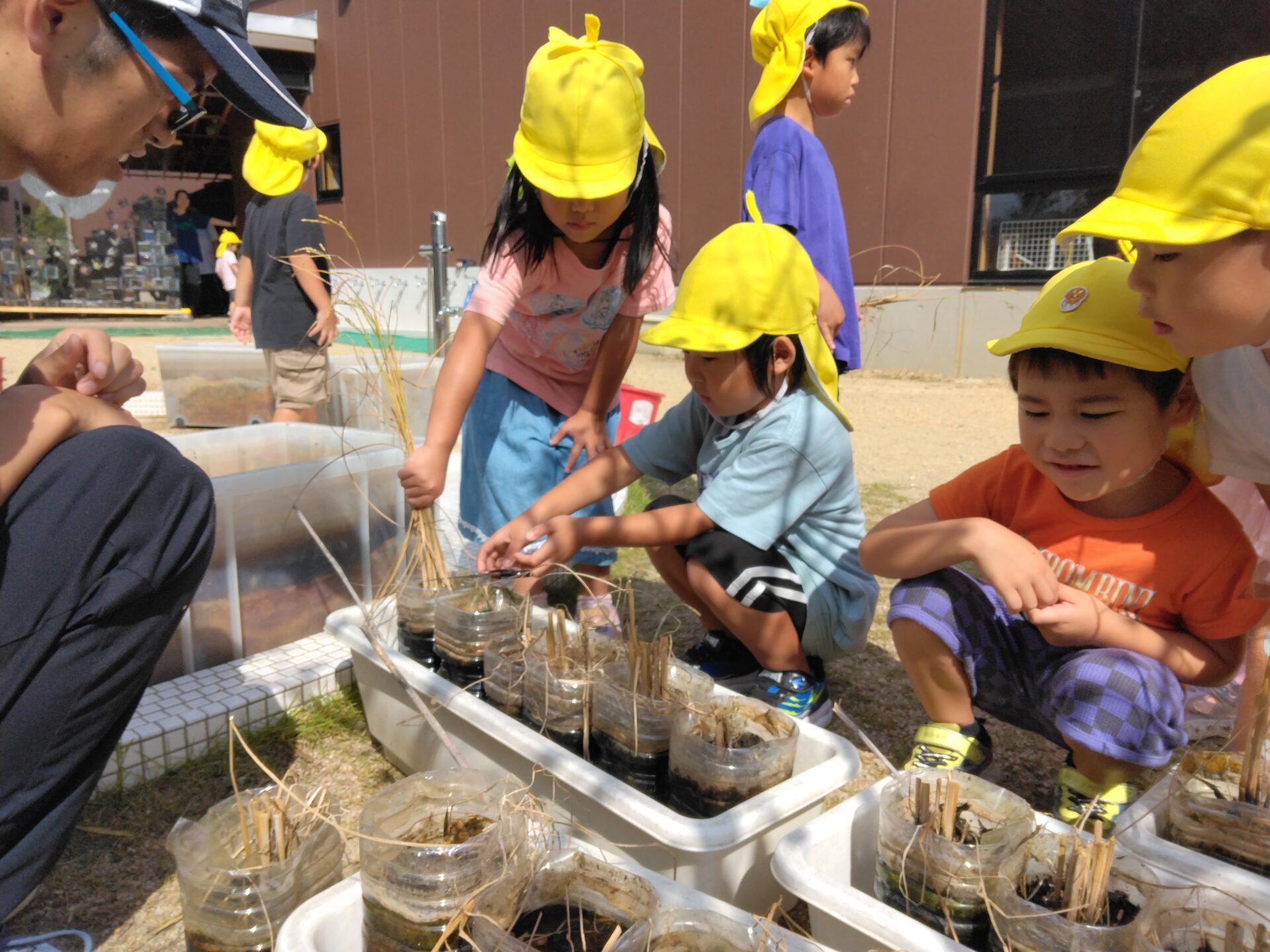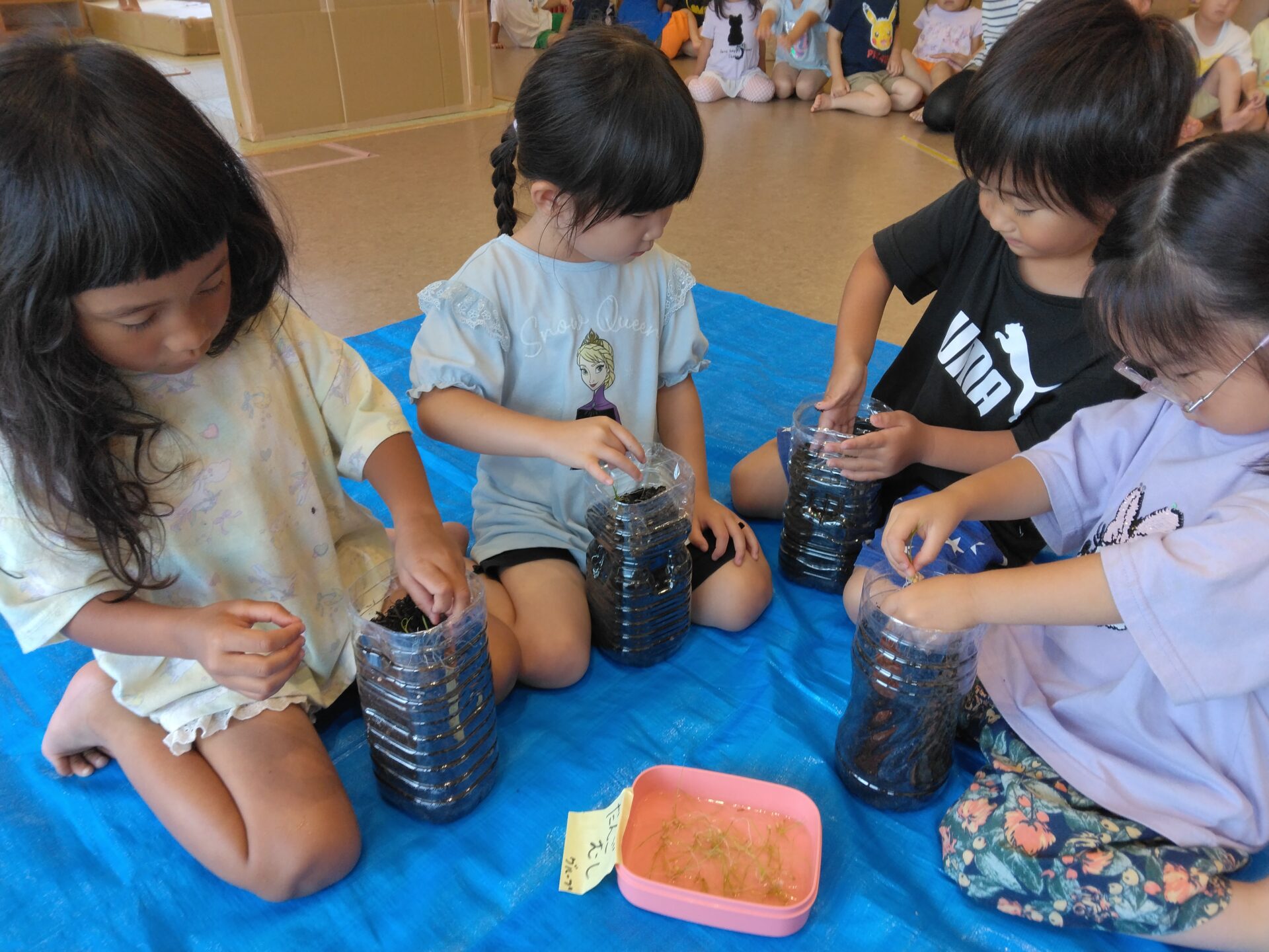 ペットボトルに土を入れ、そこに芽が出た種もみを三本ずつ植え付けていきます。