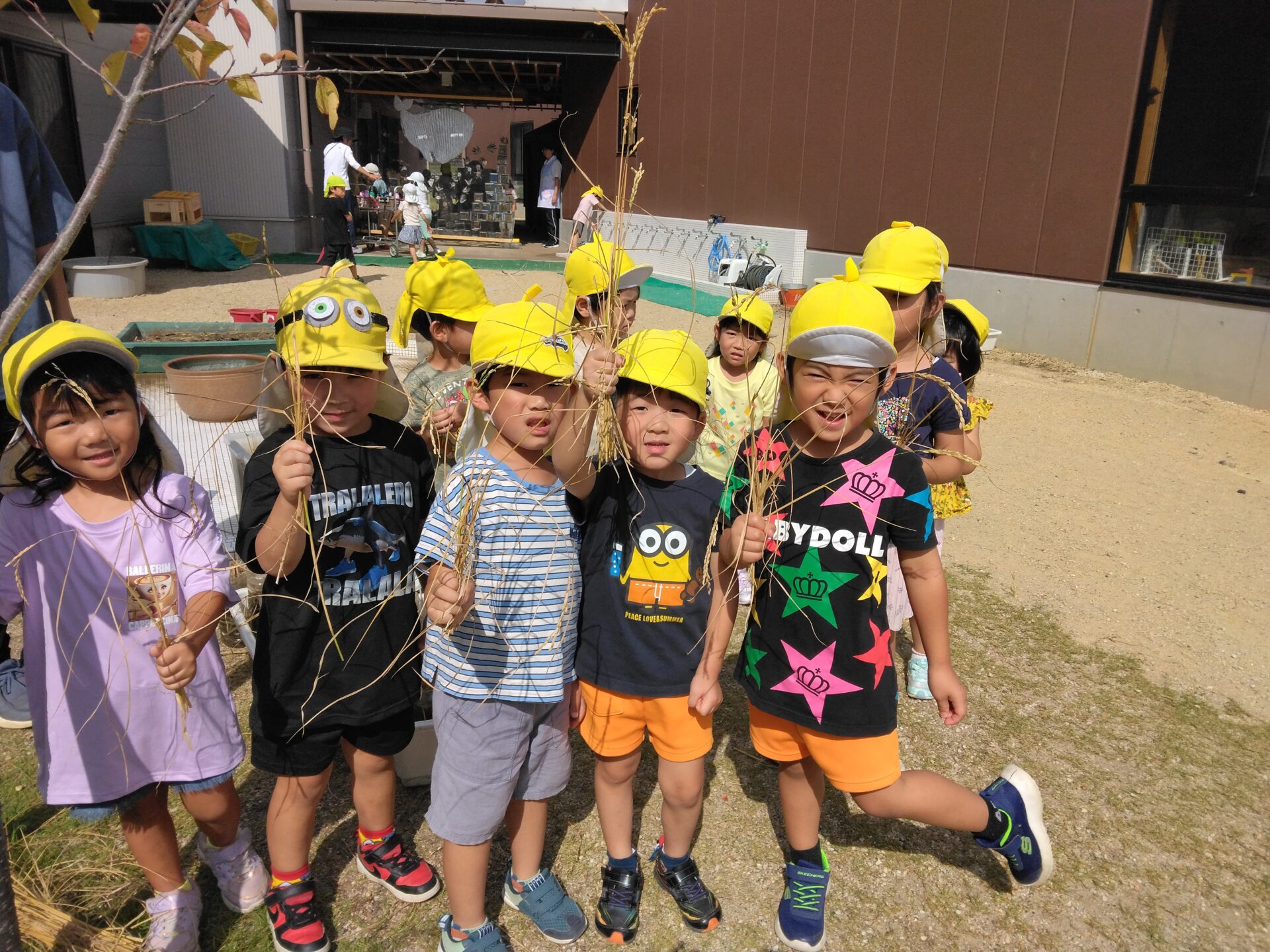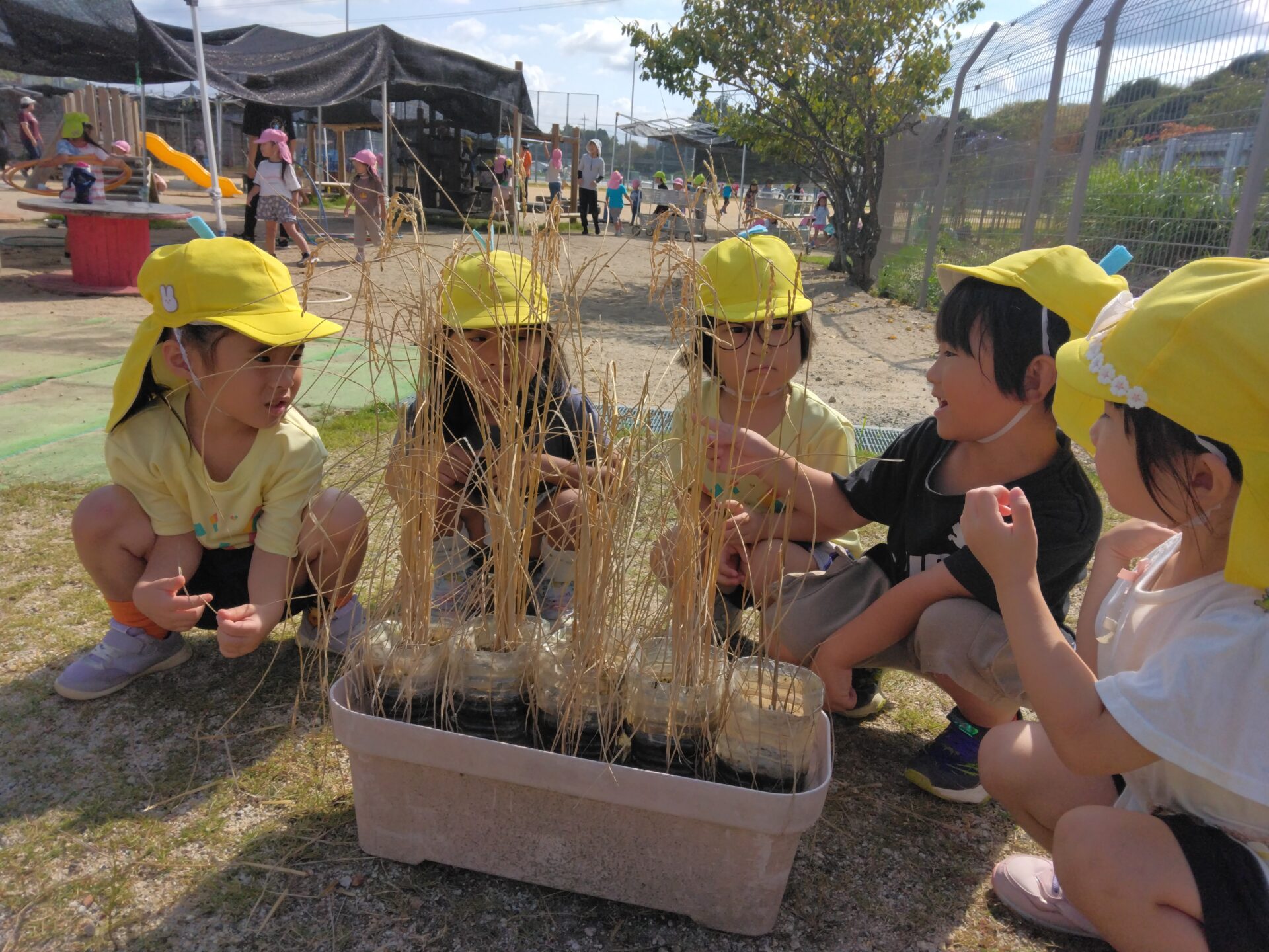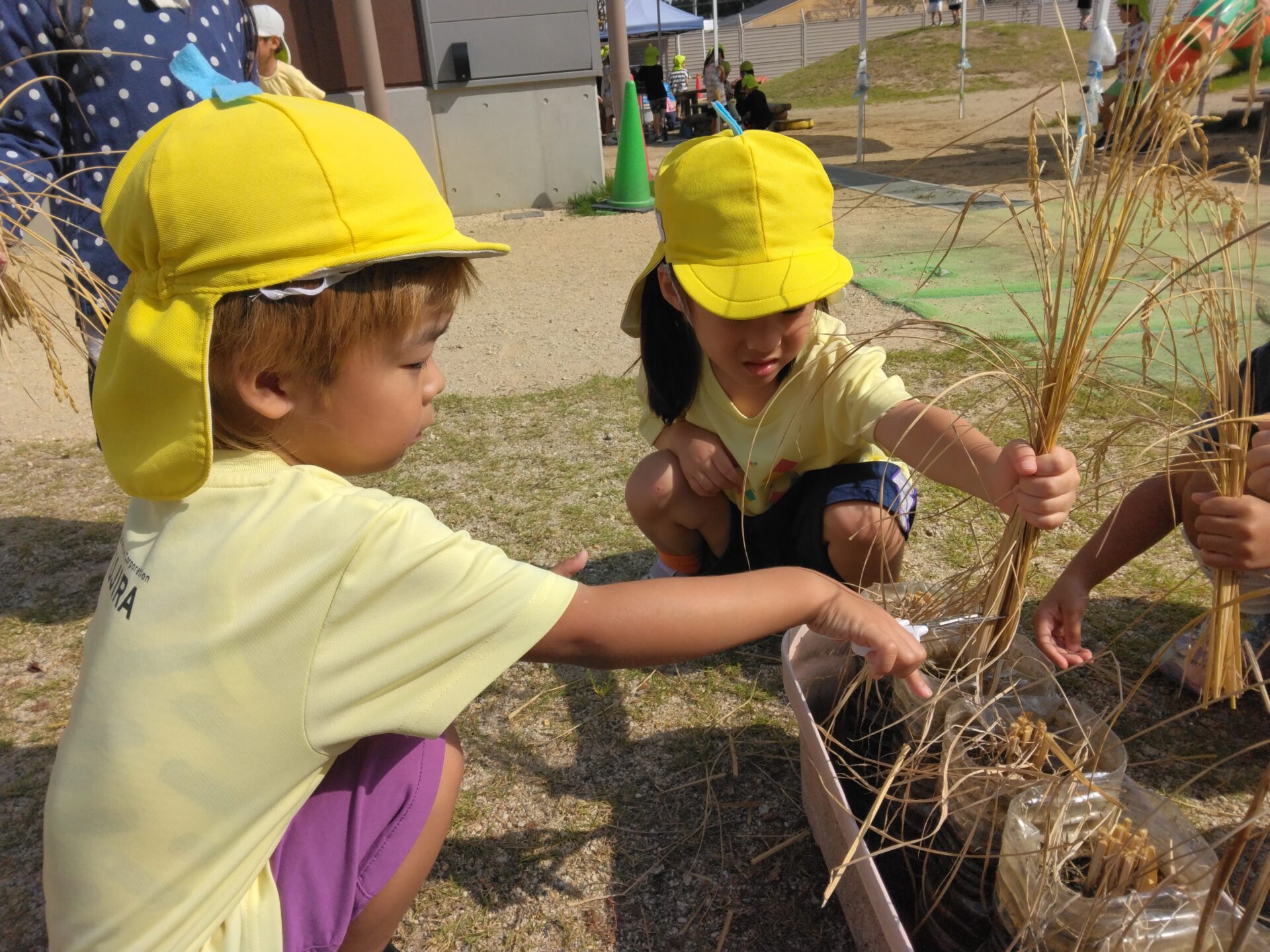 子どもたちが楽しみにしていた稲刈り!「これ、お米やな~」「いっぱいついてるな~」稲穂を見ながら会話を楽しんでいました。