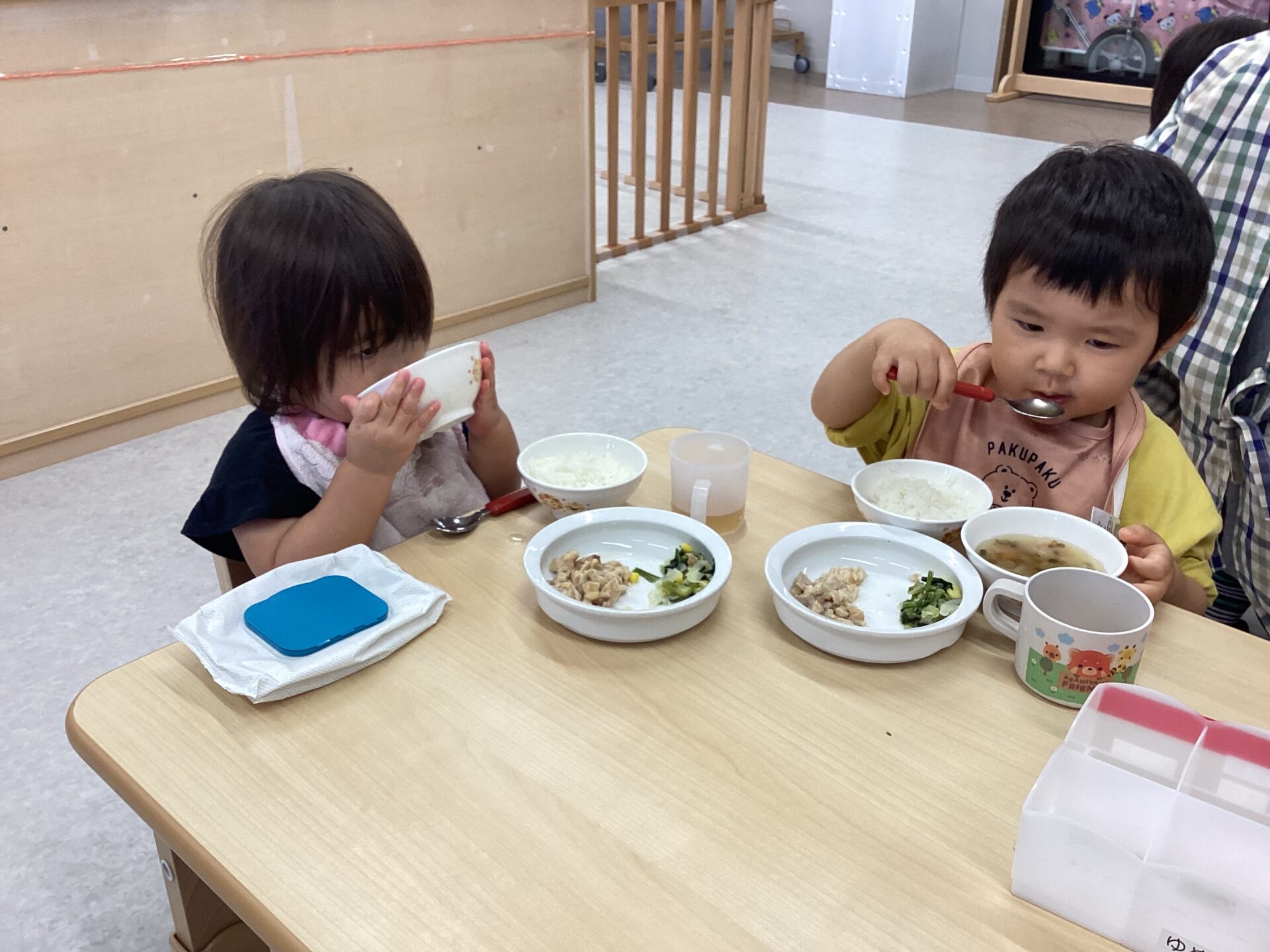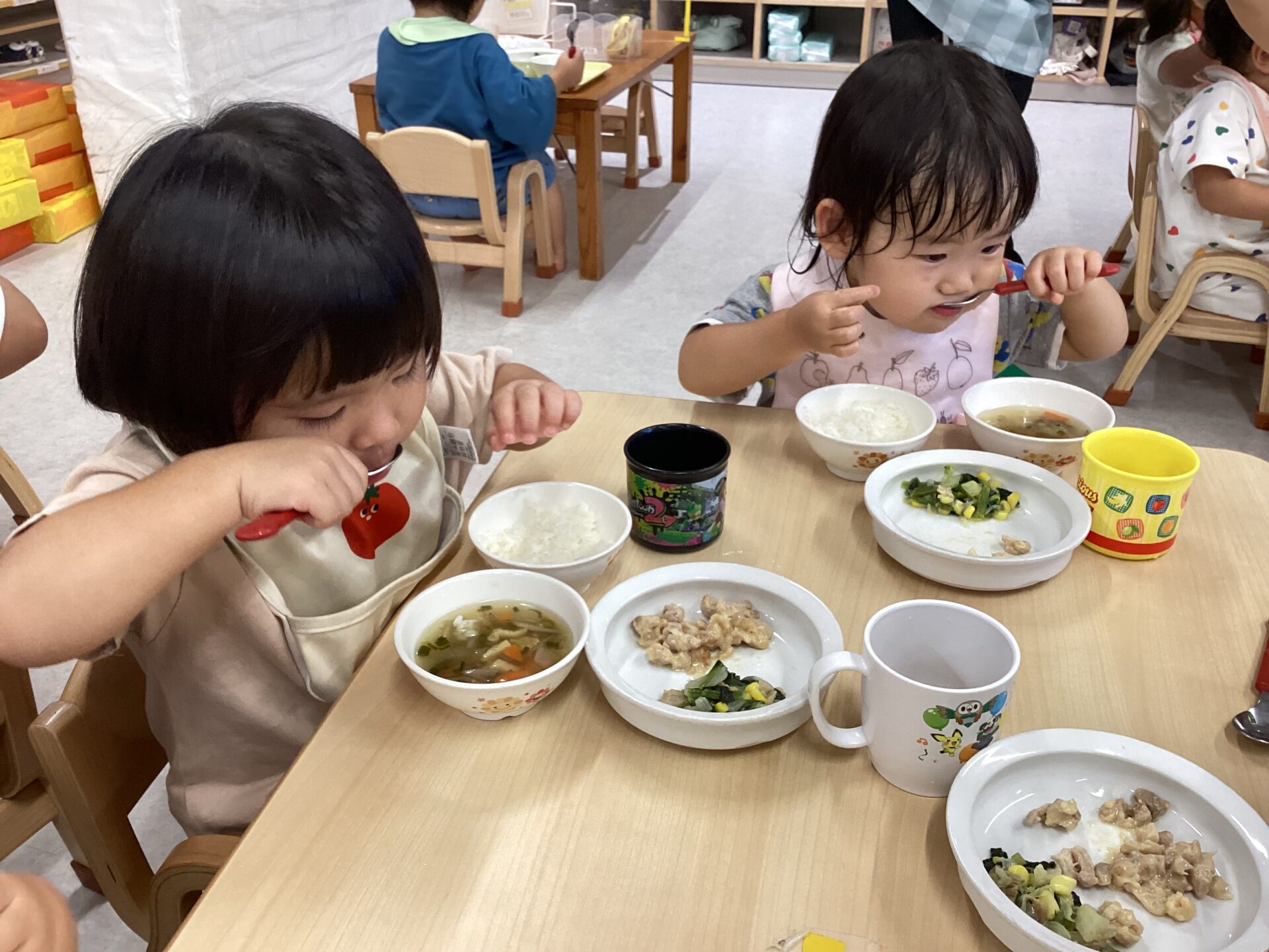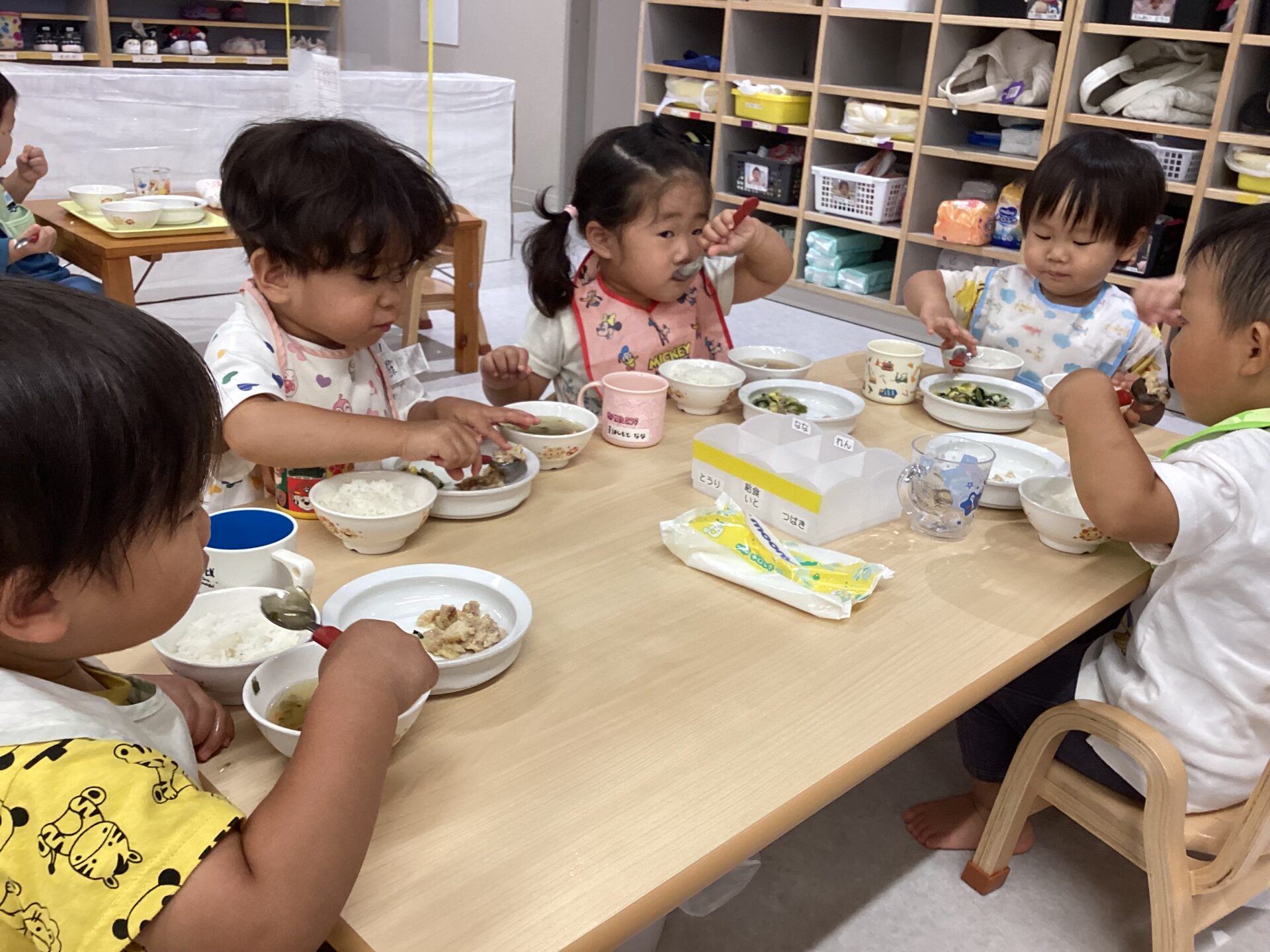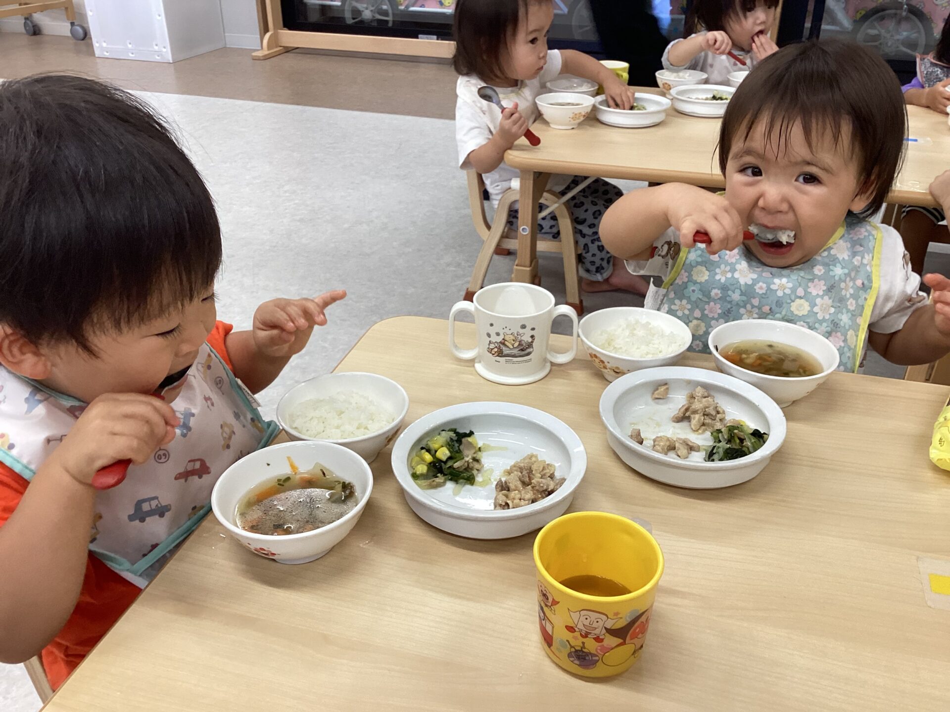 手づかみもありますが、スプーンを使って食べる意欲が芽生えてきました。