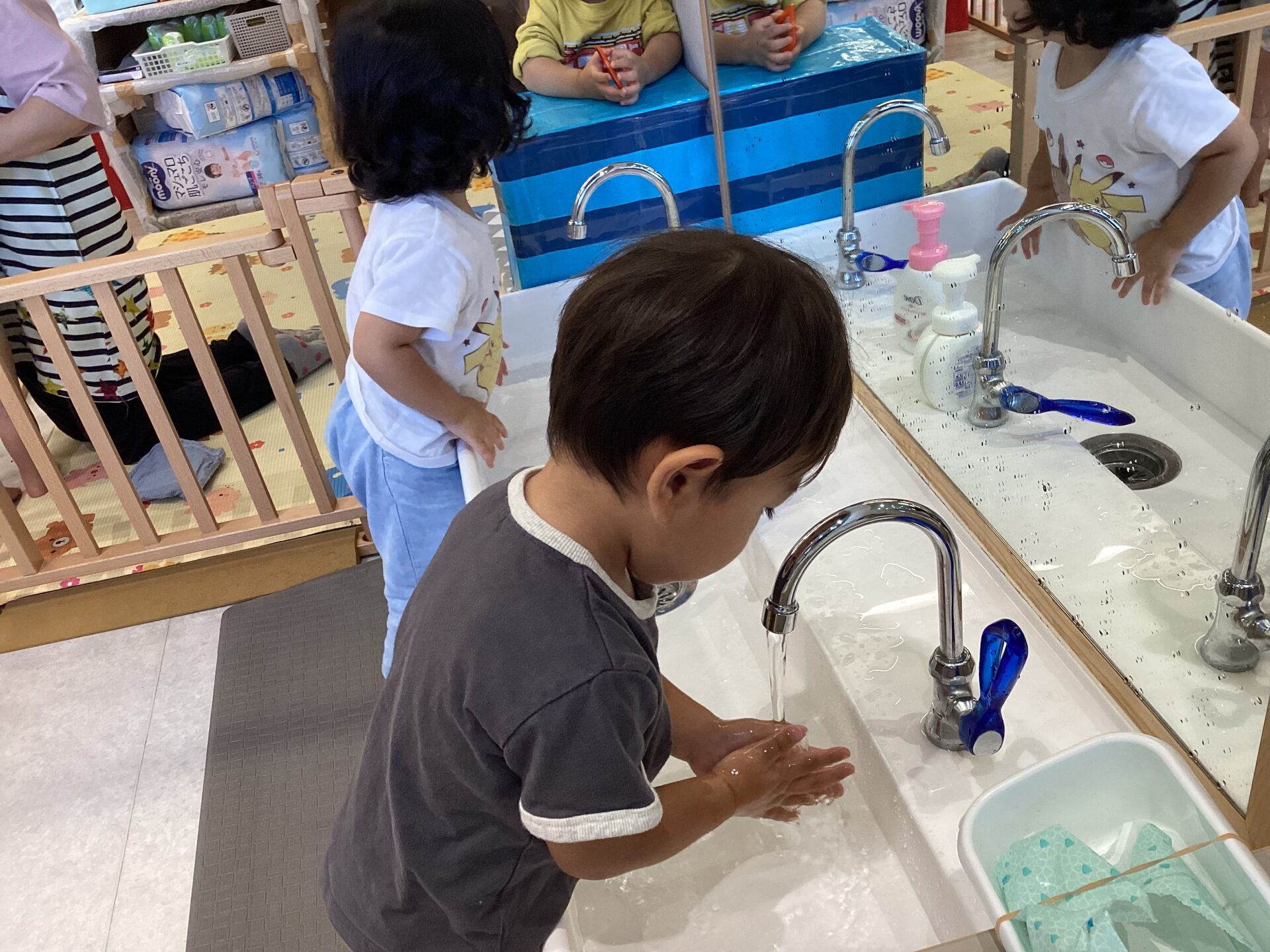 手を洗う場面も「ゴシゴシ」と言いながら洗って、きれいになった気持ち良さを味わう姿も出てきました。