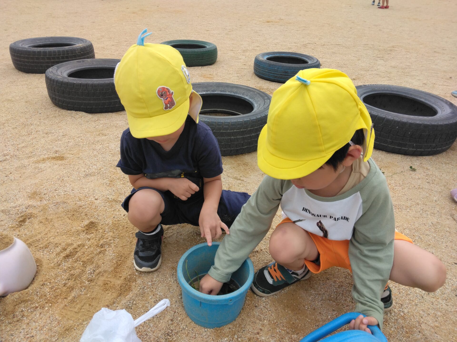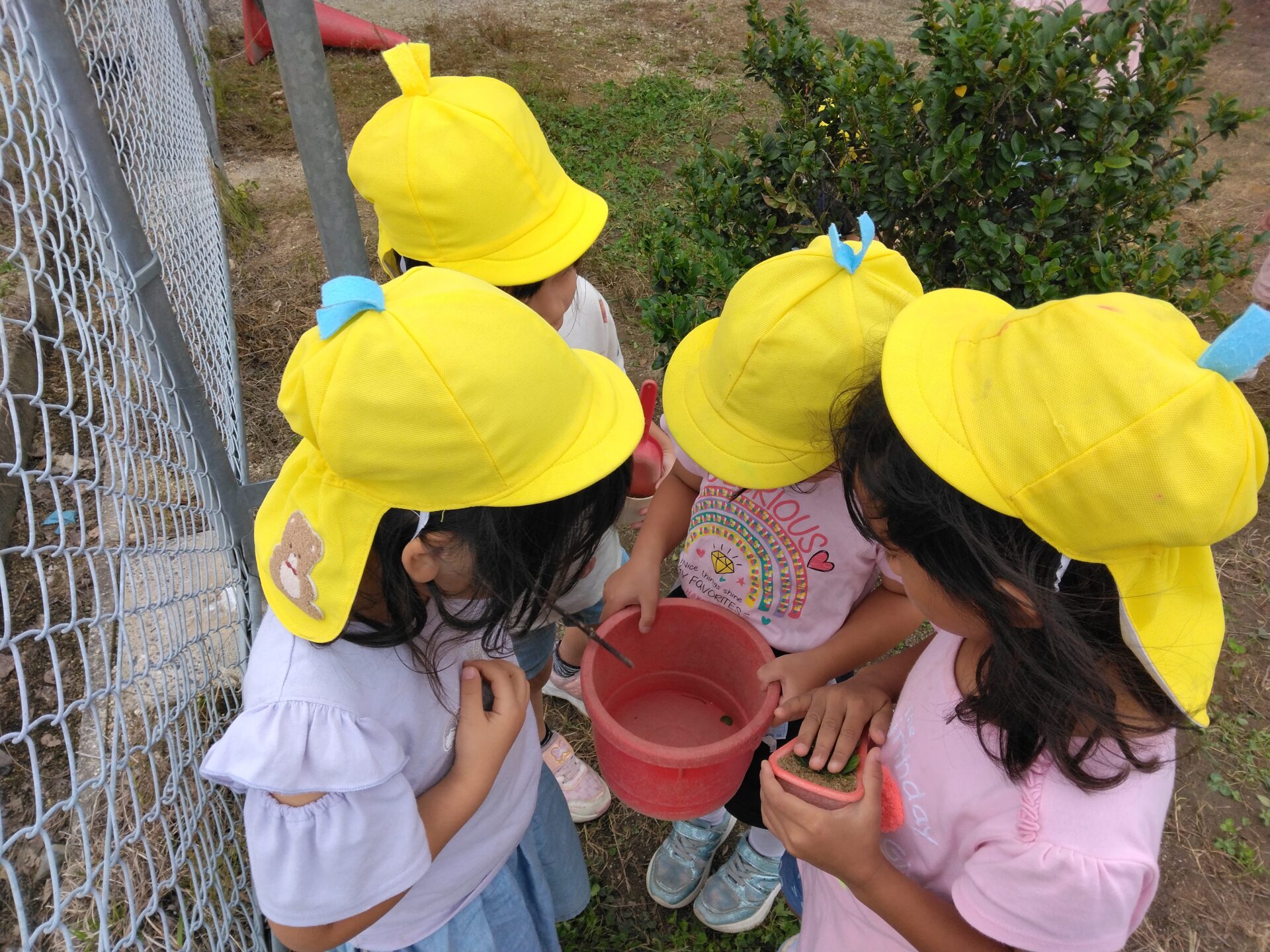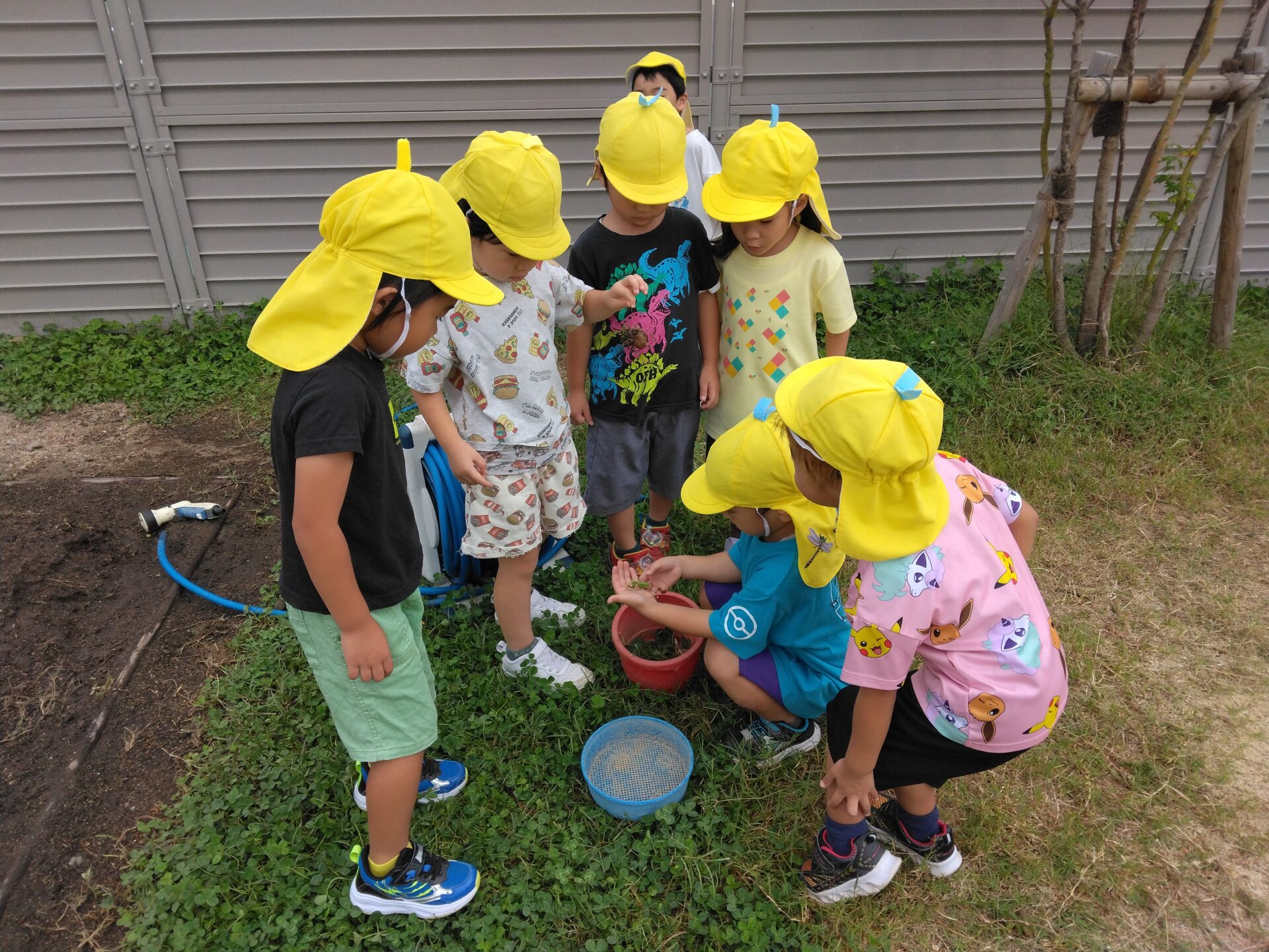 ぴょ~ん!と逃げ足が速いバッタには、帽子を使って… 子どもたちなりに工夫しています。