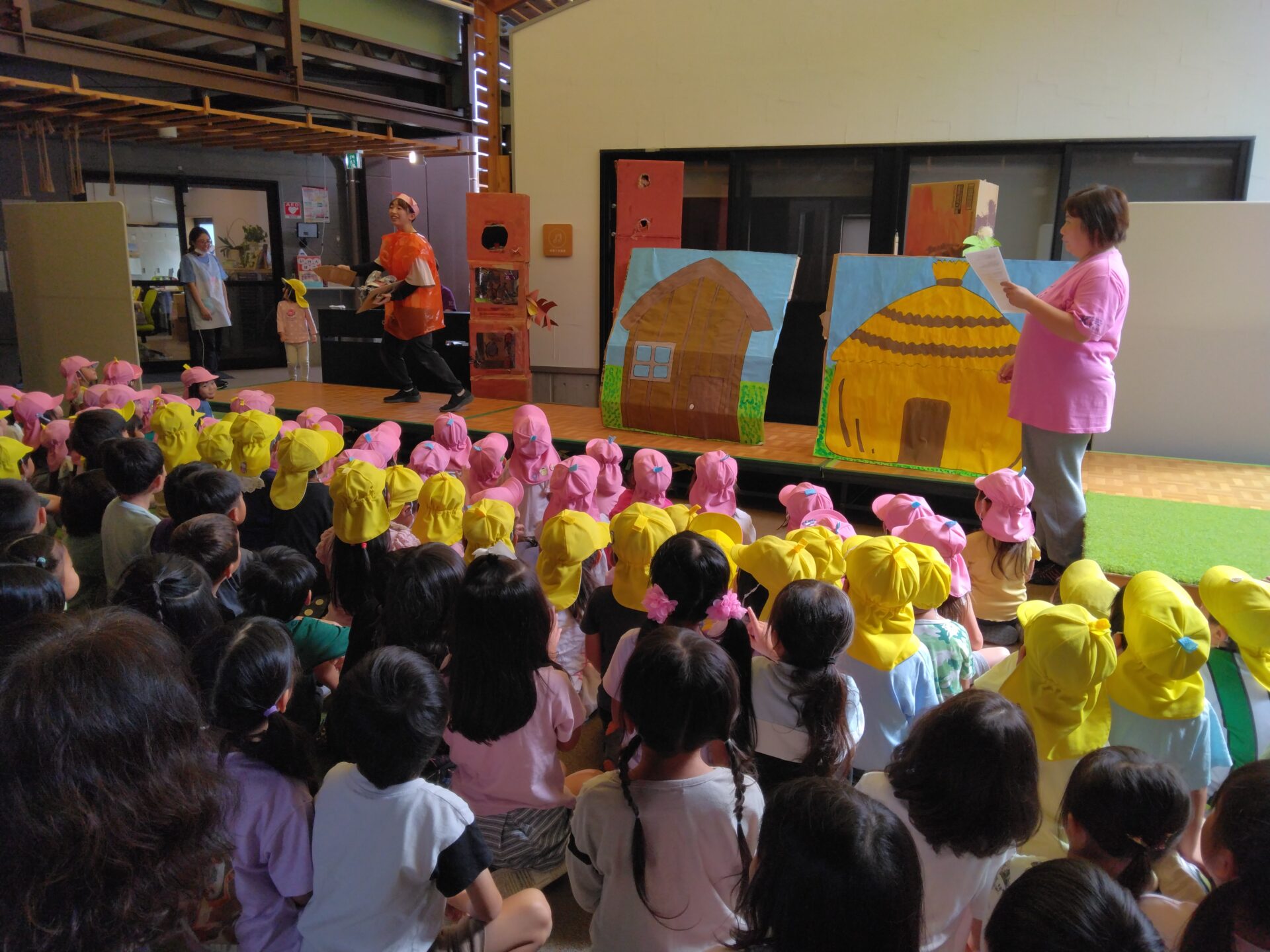 エントランスで、職員によるオペレッタ「三匹の子ぶた」を、子どもたちが見て楽しみました。
