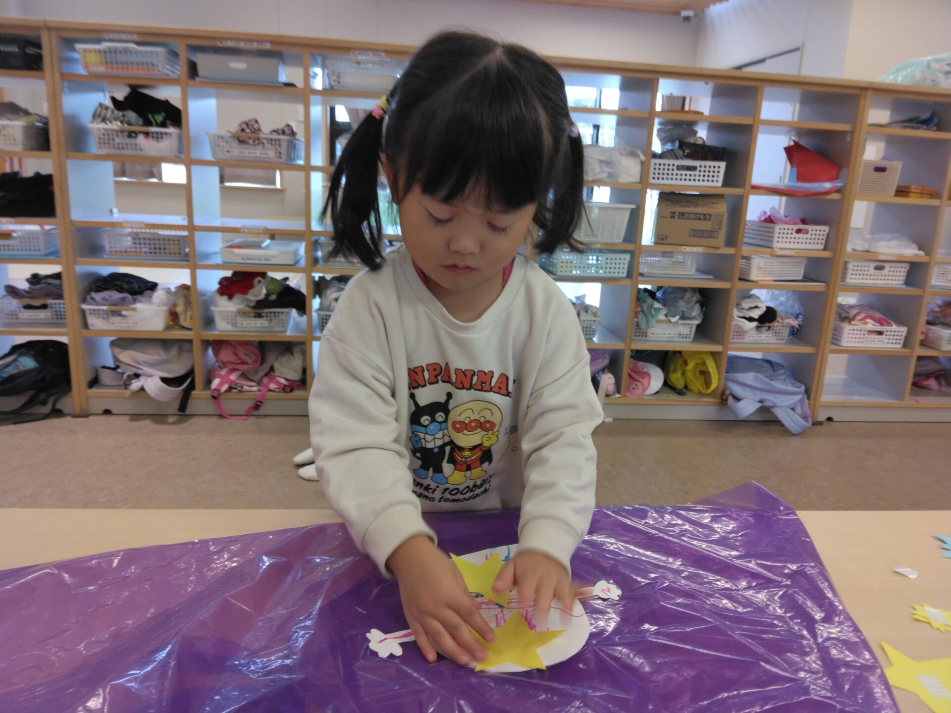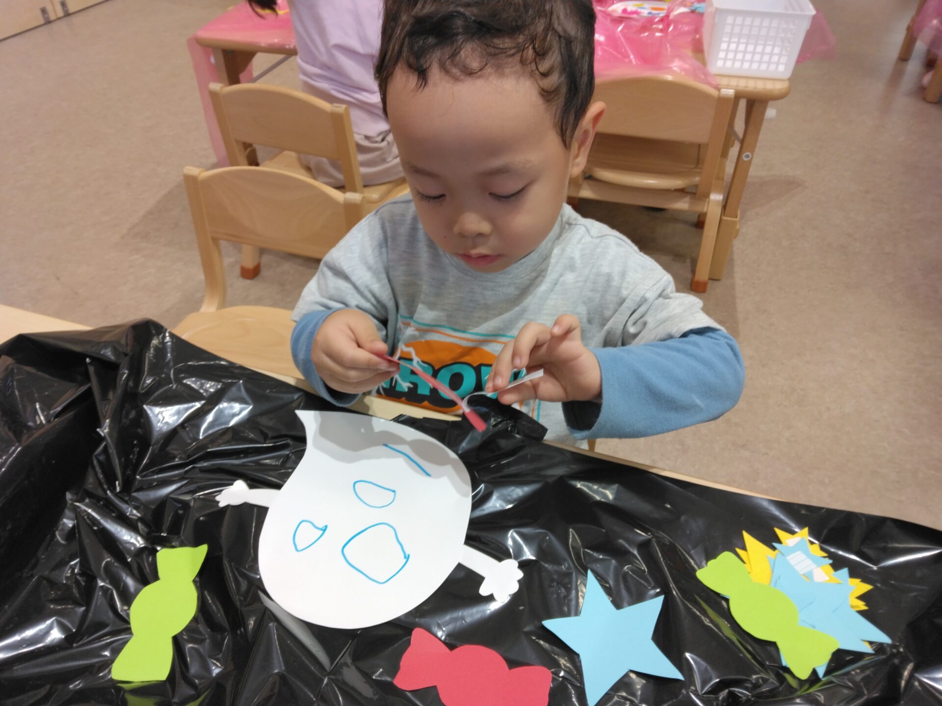 いろんな色の星やキャンディーの中から自分の好きなものを選んで、マントに貼っていきました。