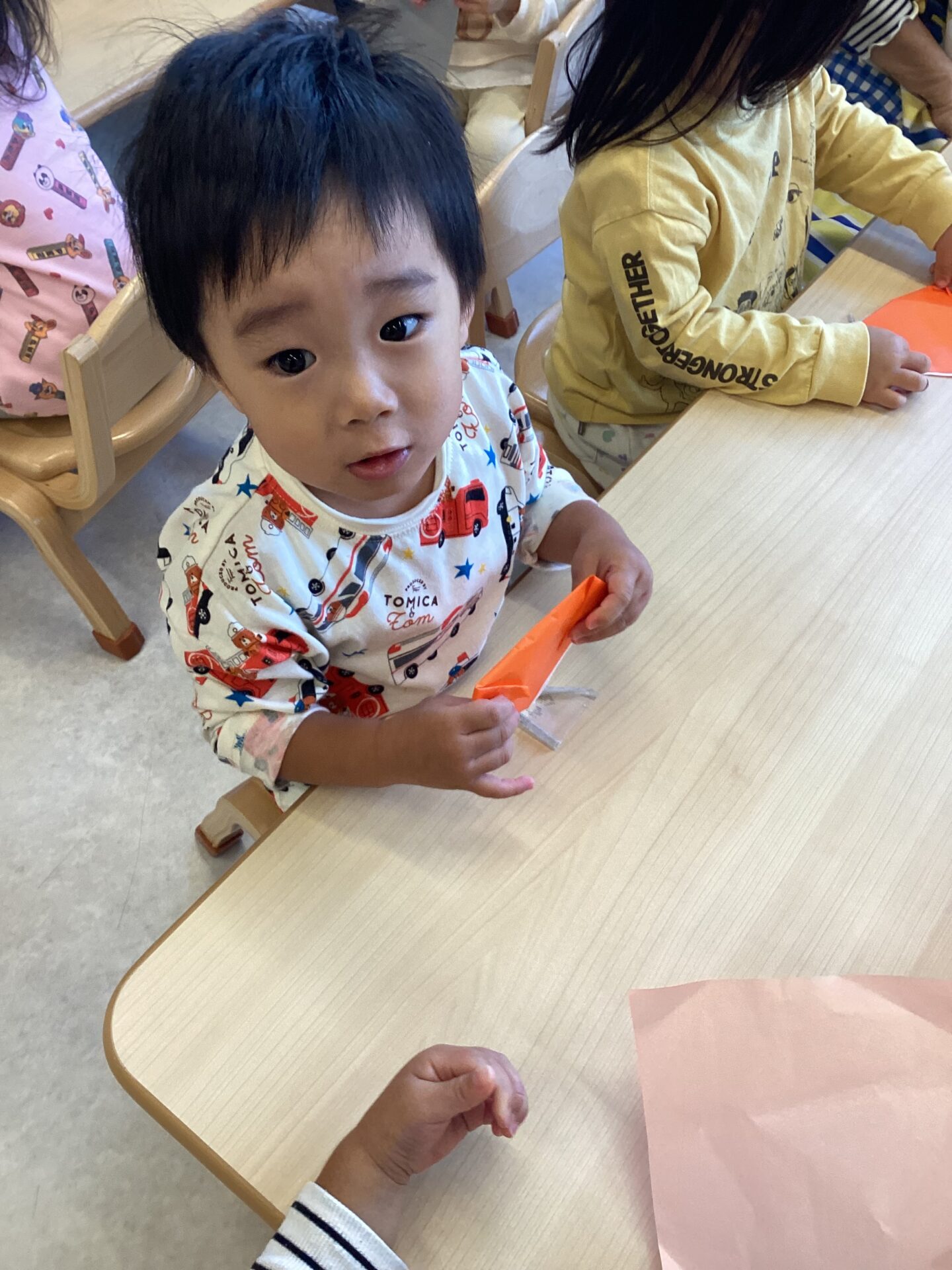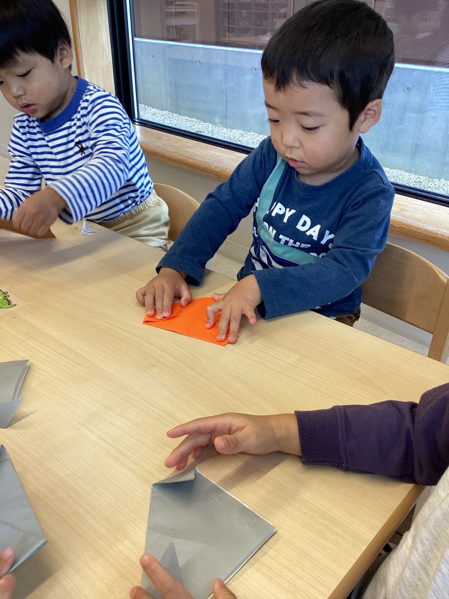 折り紙を見つけると思いおもいに折り始める子どもたち。