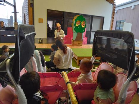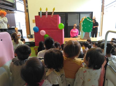 みんなで「おめでとう」の言葉と歌、拍手でお祝いした後は、未満児クラス合同で、先生たちからのプレゼント劇 ”どんぐりさんの誕生会” をエントランスで楽しみました。