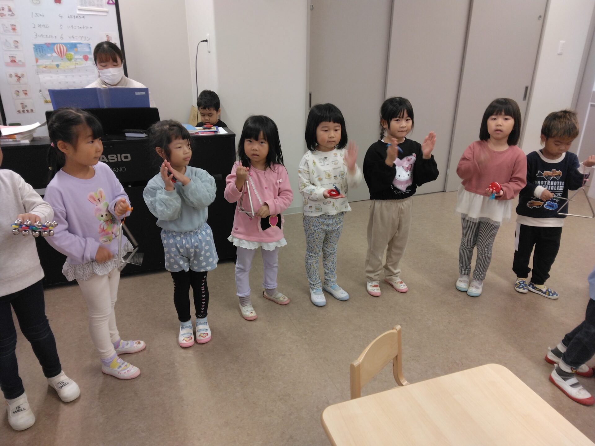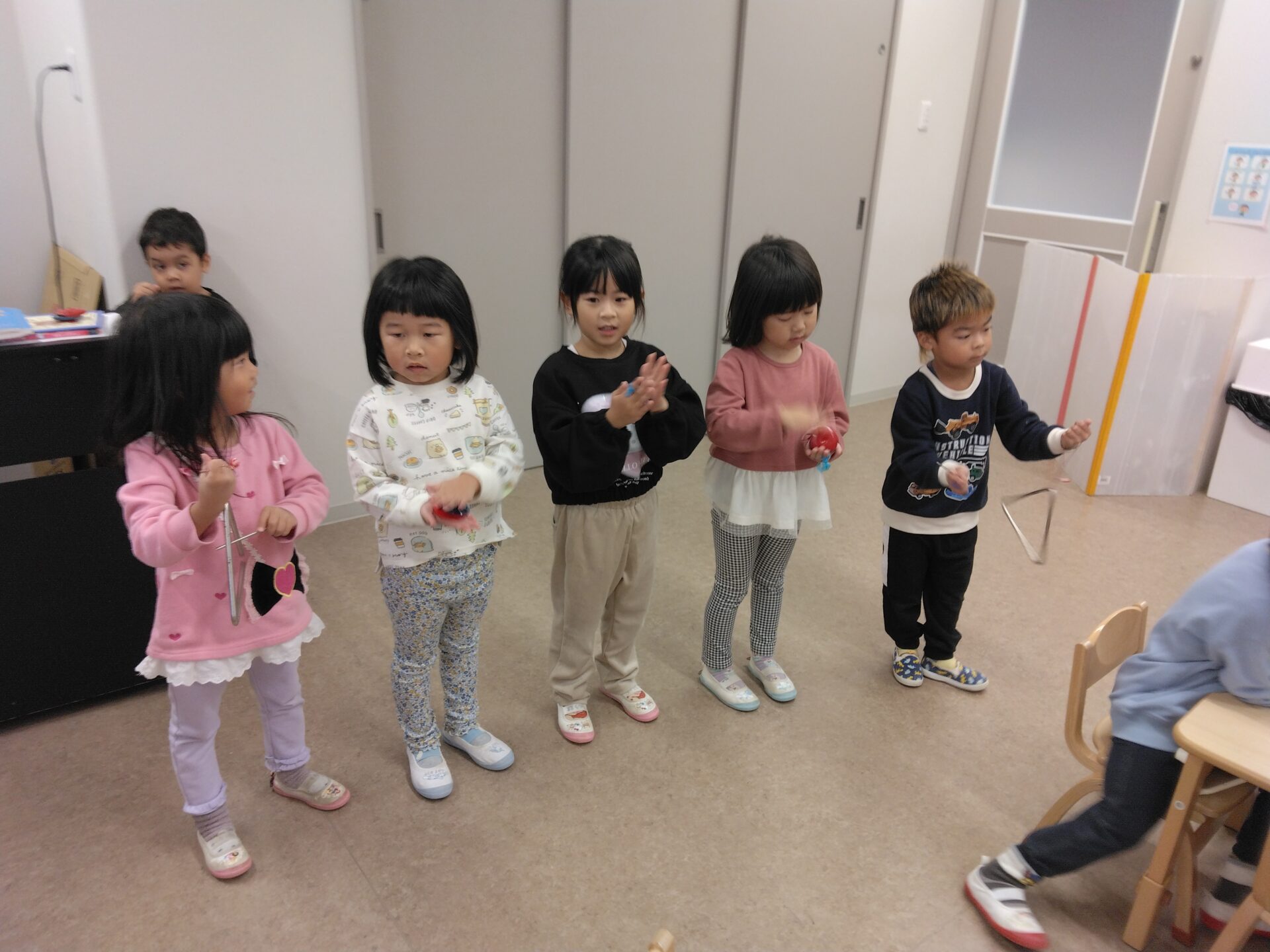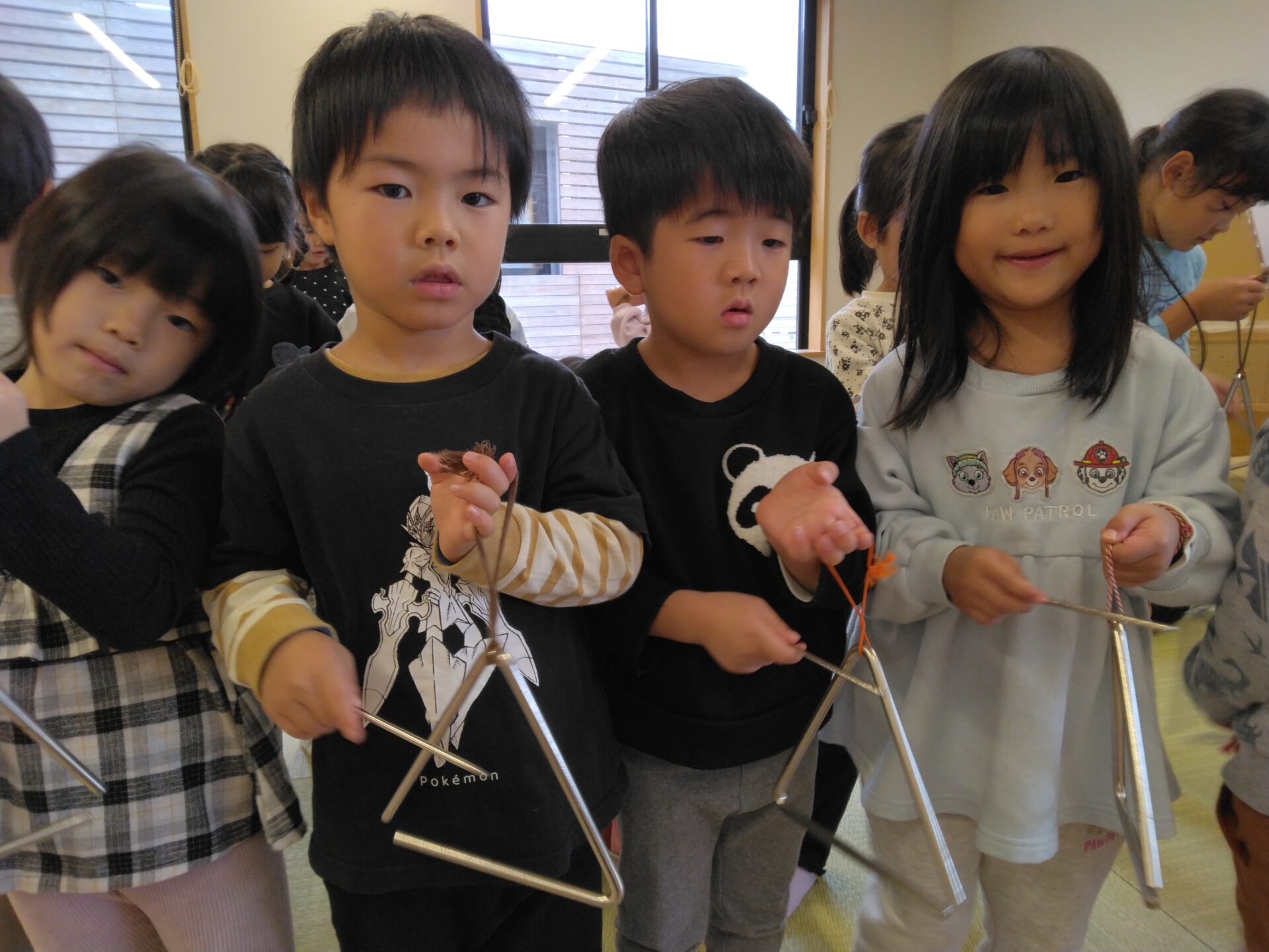 トライアングルや鈴、カスタネットの中から「これにしよう!」と、自分の好きな楽器を選んだ子どもたち。音を鳴らして思い思いに楽しんだ後、保育者が奏でるピアノの曲に合わせて、リズム打ちをして楽しみました。これから、友だちと音を合わせる心地よさや、みんなで奏でる楽しさを感じられるよう、遊びを広げていきたいと思います。