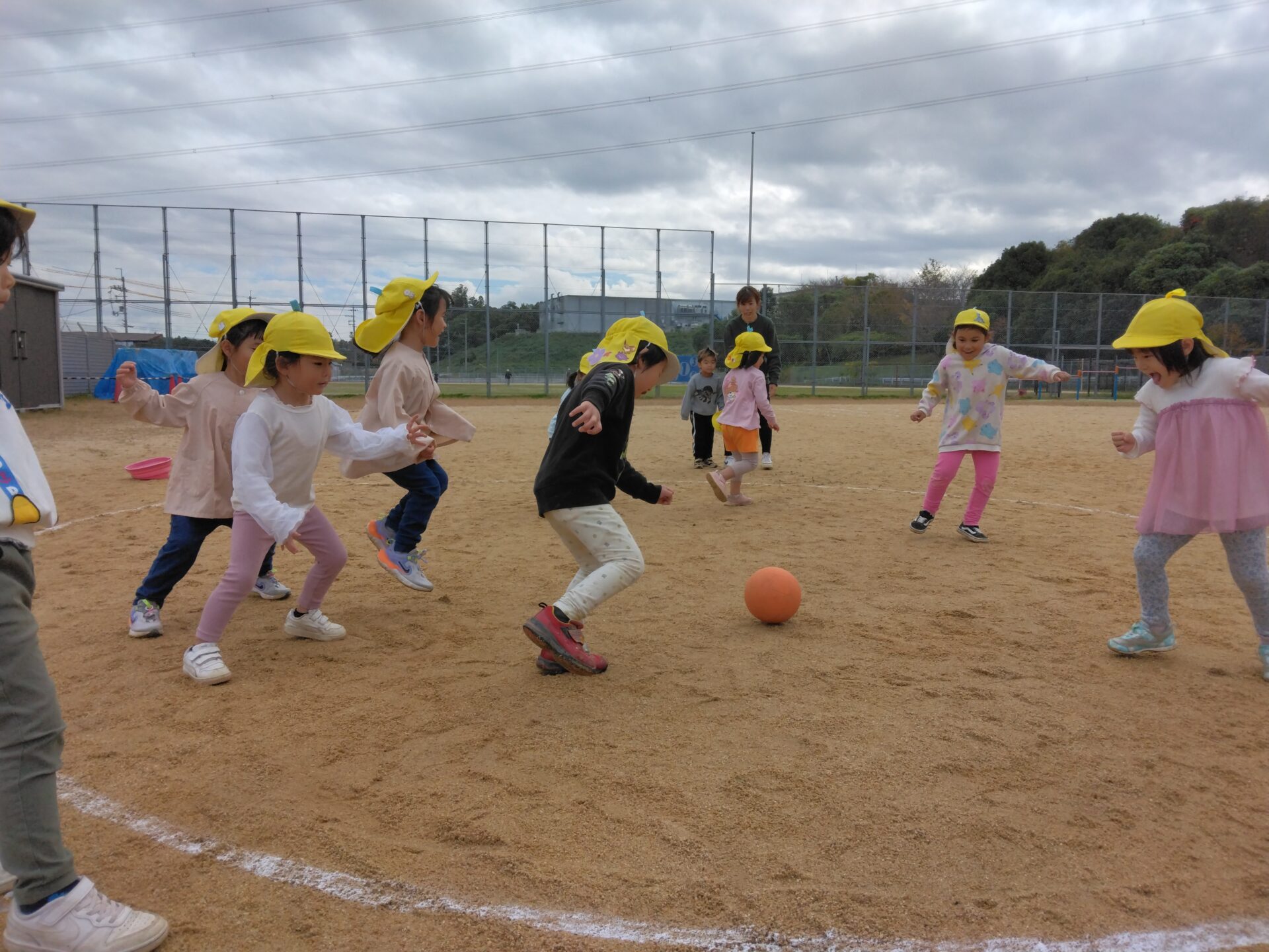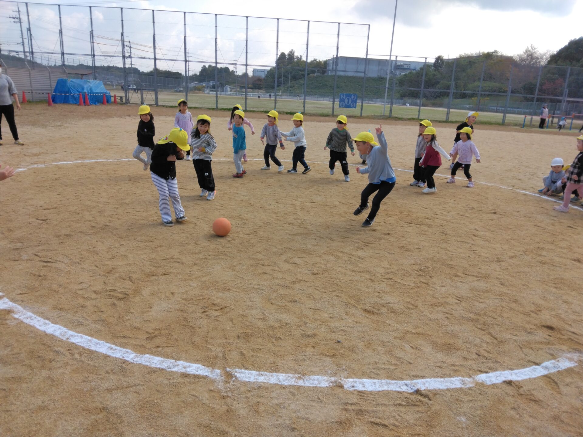 ボールがあたらないように逃げる子どもたち。